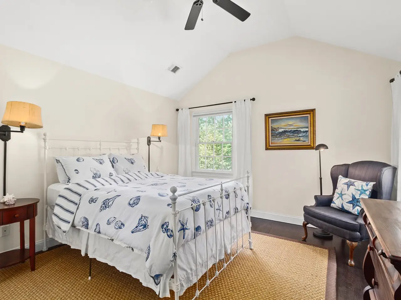 This quintessential Hamptons home features five bedrooms, three and a half baths and plenty of living space for the perfect summer getaway. Boasting a large double-high living room with a fireplace, dining area and open kitchen, this home has it all. The first floor is equipped with a generous master suite, half bath, and guest bedroom, while the second floor has an additional master suite and two additional guest bedrooms. The property is rounded out with a heated saltwater pool, surrounded by meticulously maintained landscaping, designed by a renowned horticulturist. Conveniently located, this is the ideal summer escape.
