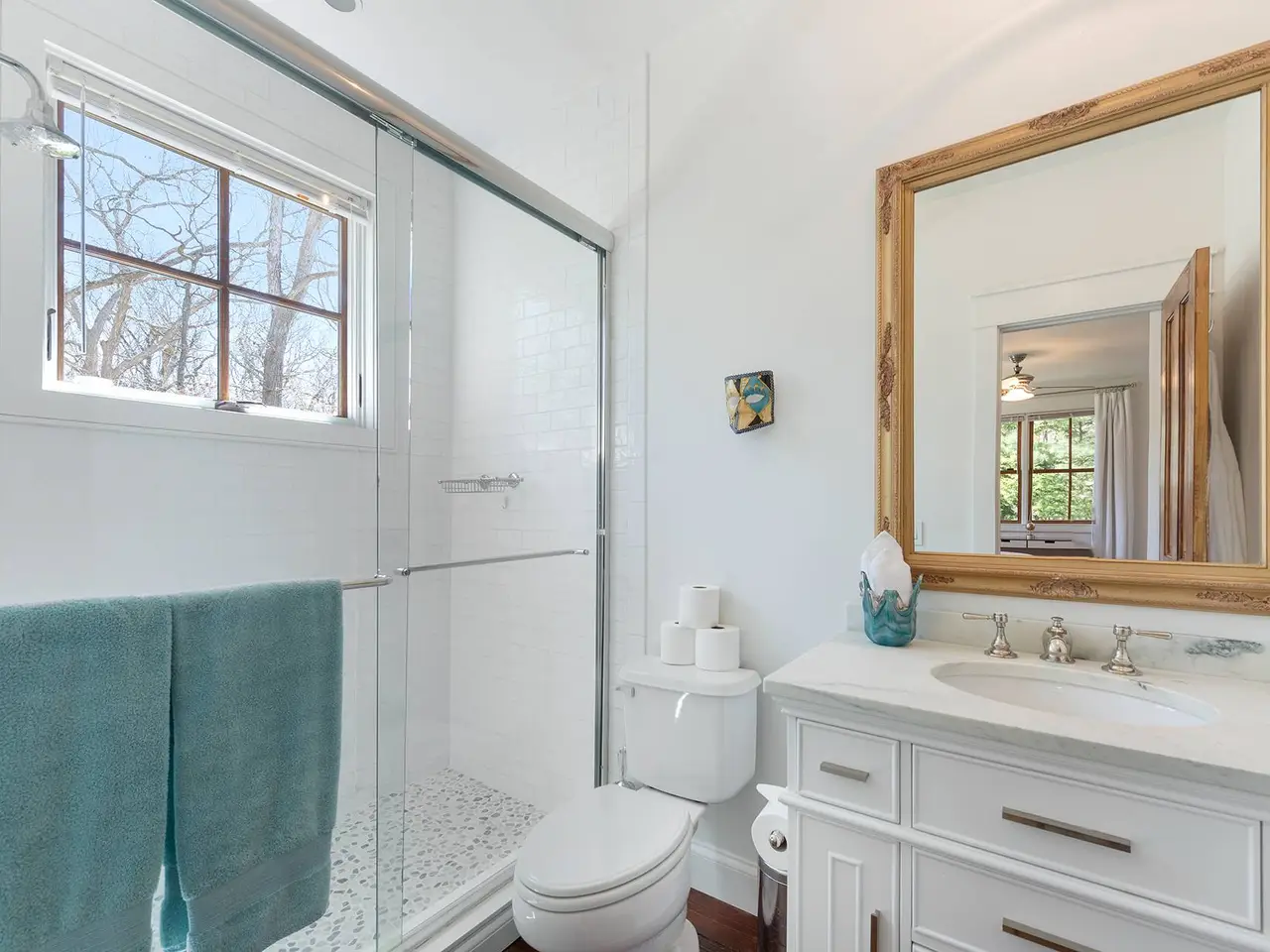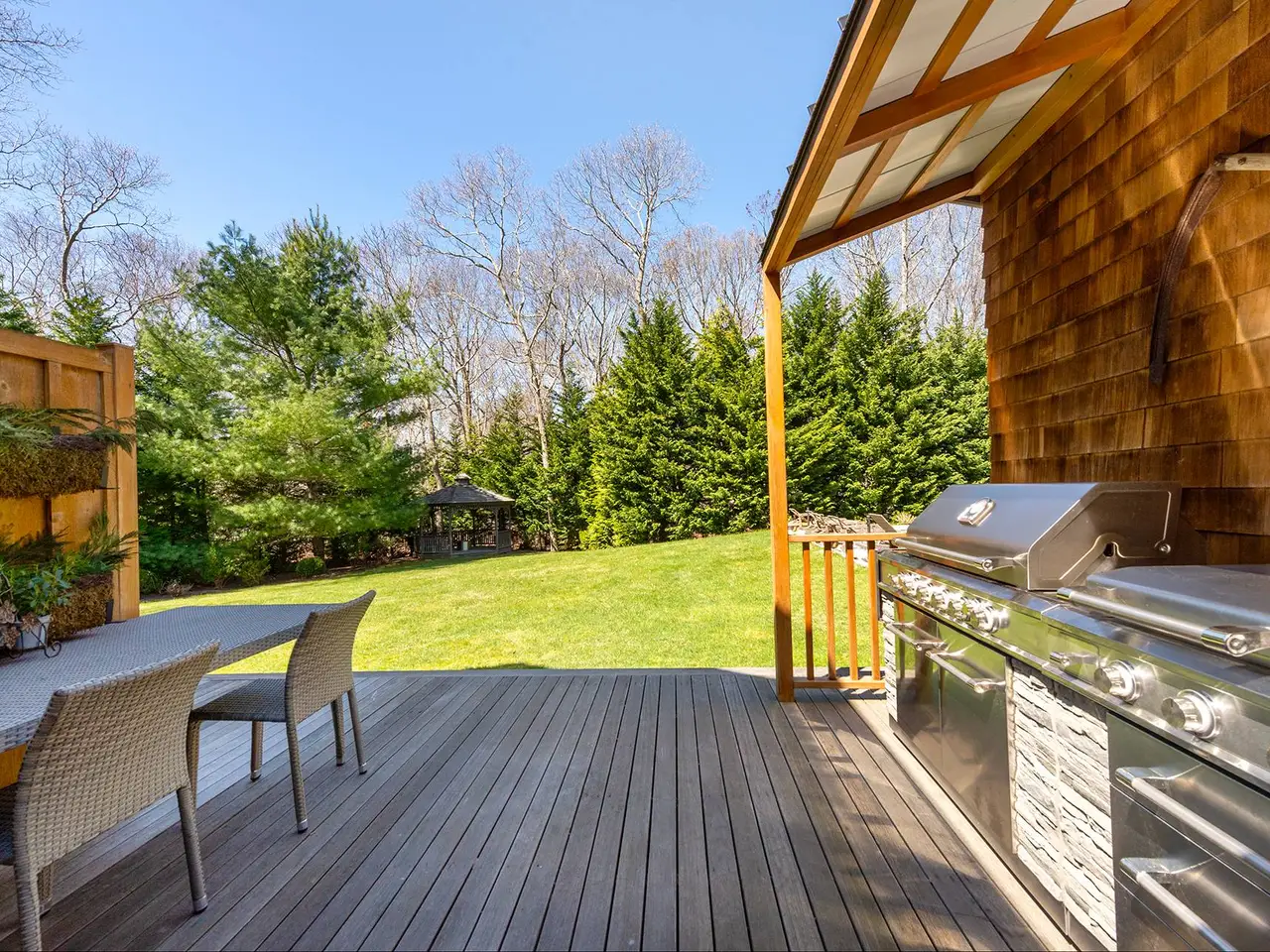 Escape to this stunning traditional Hamptons home set on nearly two serene acres in Hidden Ponds, an exclusive and quiet community in East Hampton's Northwest Woods, just five miles from the heart of East Hampton Village and local beaches. This light-filled, beautifully designed home is the perfect summer retreat, offering comfort, privacy, and everything you need to relax or entertain in style. The open-concept layout includes a spacious living room with a dramatic stone fireplace and French doors leading to the backyard patio and pool. The chef's kitchen is a dream-complete with vaulted ceilings, a large island, Sub-Zero refrigerator, Dacor six-burner range with double ovens, two dishwashers, a wine fridge, and more. A large pantry and custom cabinetry add extra convenience. Enjoy meals in the elegant dining room or relax in the sunroom overlooking the landscaped grounds. The home features 5 bedrooms and 4.5 bathrooms, including a private primary suite with a gas fireplace, spa-like bathroom with both an oversized standing shower and separate free-standing bathtub and walk-in dressing room. There's also a separate guest suite with its own entrance, ideal for visitors or house staff. Outdoors, unwind on the mahogany deck, take a dip in the heated gunite pool, lounge by the gazebo or enjoy a home cooked meal from the outdoor BBQ kitchenette. An outdoor shower, toilet stall with a changing area, and multiple patios make it easy to make the most out of every moment of summer. Extras include central A/C, radiant heat, wide oak floors, in-house laundry, and a fully finished basement. Tall evergreens surround the property giving it total visual privacy. Whether you're hosting friends or looking for a peaceful escape, this home has everything for the ultimate East Hampton summer.