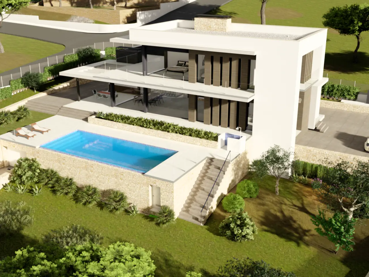 This stunning villa is located in the exclusive El Garroferal area of Jávea, Alicante, offering a privileged setting on the mountainside and just a short distance from all amenities and the golf course. The recently constructed property stands out for its modern and elegant design, as well as its generous dimensions: a built area of 635.93 m², a spacious terrace of 301.57 m², and a private plot of 1,646 m². The villa features four bedrooms, each with an en-suite bathroom, ensuring privacy and comfort for every family member or guest. Additionally, there is a guest toilet and a full bathroom. The interior spaces have been carefully designed, including a fully equipped kitchen, a bright living room with direct access to the private terrace, and a practical laundry room. The walk-in closet and built-in wardrobes provide functional and elegant storage solutions. Among the leisure and relaxation areas, the property offers a private pool surrounded by an exclusive garden, perfect for enjoying the Mediterranean climate. The terrace, both covered and uncovered, invites you to host outdoor gatherings, complemented by a barbecue area. For those who appreciate wellness and entertainment, the villa’s basement includes a gym, cinema room, and wine cellar, providing unique spaces for every occasion. The private garage, panoramic mountain views, and proximity to both the town center and golf courses make this villa an unbeatable option for those seeking exclusivity, comfort, and a privileged natural environment on the Costa Blanca.