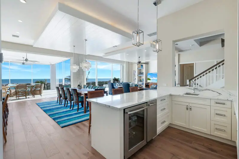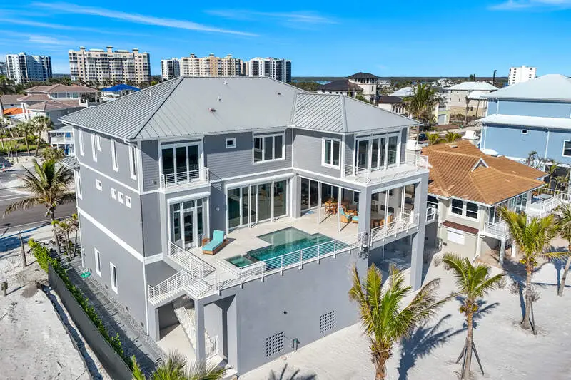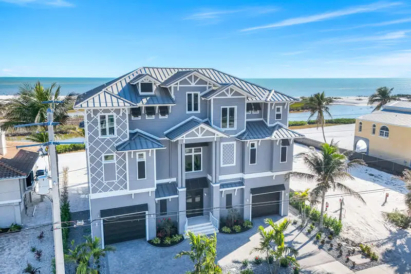 An exclusive & spectacular beachfront home located on the tranquil south end of Fort Myers Beach offers unrivaled panoramic gulf & beach front views stretching from Naples to Sanibel on clear days & evenings serving as a perfect backdrop of luxury & privacy. Positioned on a rare section of beach w/ultra-private backyard yet, from the home, you have direct access to the sandy beach & gulf waters. Featuring 6 spacious ensuite bedrooms or 5 ensuites & a den w/full bathroom, the residence boasts 10' to 15' high ceilings, stunning hardwood & tile flooring, fully color-coordinated accents, an open 3-tiered floorplan drawing in natural light throughout plus, an elevator that provides easy access to all levels, ensuring convenience throughout the home. The chef-inspired kitchen is equipped with top-tier appliances, dual ovens, dual dishwashers, large walk-in pantry, wet bar, multiple dining options from casual to formal both inside & outside, ideal for both everyday living, entertaining & those special gatherings. Step outside to the expansive patio, where you'll enjoy a full outdoor experience from lounging, sunbathing, dining & more. Complete outdoor kitchen, fireplace, infinity pool & spa, all designed for taking full advantage of the mesmerizing sunsets & living the ultimate beach front lifestyle. Designed with comfort, efficiency & luxury at top-of-mind, this home features high-impact windows & doors, electric Clear Choice Storm Shutters, motion-senor automated sliders that open up to the beach, a garage that follows the footprint of the home to accommodate 6+ cars, double laundries (main & upper level) & Lutron lighting system. Additional highlights include two new A/C systems (2024), on-demand gas water heaters, a 1,000-gallon underground propane tank, a MyQ WiFi-controlled garage & beautiful, irrigated landscaping. A short drive, bike ride or trolley connection can take you to Lovers Key State Park, a variety of local marinas, various local shopping & dining venues as well as easy access to a number of public boat launches. The trolley-stop is just across the street. This home is perfect for enjoying the finest in beachfront living as well as both current & future local attractions as investment in the community continues to unfold.