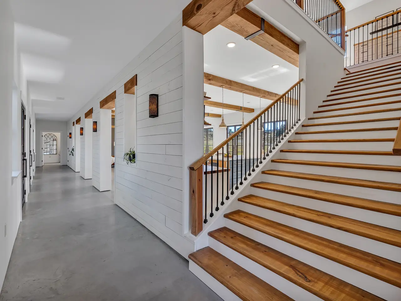 Experience serene luxury in a modern farmhouse nestled in the picturesque Texas Hill Country. The property is ideally located near the charming towns of Fredericksburg, Comfort, and Kerrville. Upon entering the property, an expansive limestone pathway leads to the entrance. The inviting courtyard adorned with a vine-covered pergola and twinkling lights provides a delightful spot to relax. The two-story home has been thoughtfully designed to blend functionality and luxury seamlessly. The first level features elegant hallways that guide you through the various rooms. The entire first level has heated flooring and recessed lighting with evening mood settings. The chef-ready kitchen is an excellent space for culinary enthusiasts, with multiple workstations, three sinks, high-end appliances, a butler's pantry, and quartz and woodblock countertops. The kitchen is perfectly set up for hosting events with separate stations for kitchen tasks, ample storage, and an 11-foot-long island that can accommodate up to five guests. The open floor plan leads to the dining area and living space, where large, rugged beams span the ceiling. The brick accent wall and wood-burning fireplace ground the light-filled room. Large solid steel entry doors line the exterior on each side of the home, providing easy access to the surrounding yard. The entire home is filled with natural light, and during the late afternoon, the main living area is transformed into a warm and serene space as the setting sun beams bounce off the floors, illuminating the space. The east wing of the home leads to the primary suite and office space. The elliptical arched ceilings with evening mood lighting provide an exceptional peaceful retreat. The en suite bath features a dual vanity, a freestanding porcelain tub, and a walk-in shower with a heated stone bench. The primary suite's dressing room boasts built-in shelving, a center console with storage, and a tri-fold mirror. The spacious and secluded office offers privacy and a reflective workspace. The second level features three spacious bedrooms, two full bathrooms, and a family room. The wood floors on the second level complement the abundance of natural light that fills the entire home. The property's detached oversized garage provides ample space for two cars, a golf cart/ATV, and extra storage. The barn, measuring 36x30 feet, is currently set up as a horse barn but can be restructured as a storage barn, among other options. Restful country living can be experienced at this tranquil, private home.