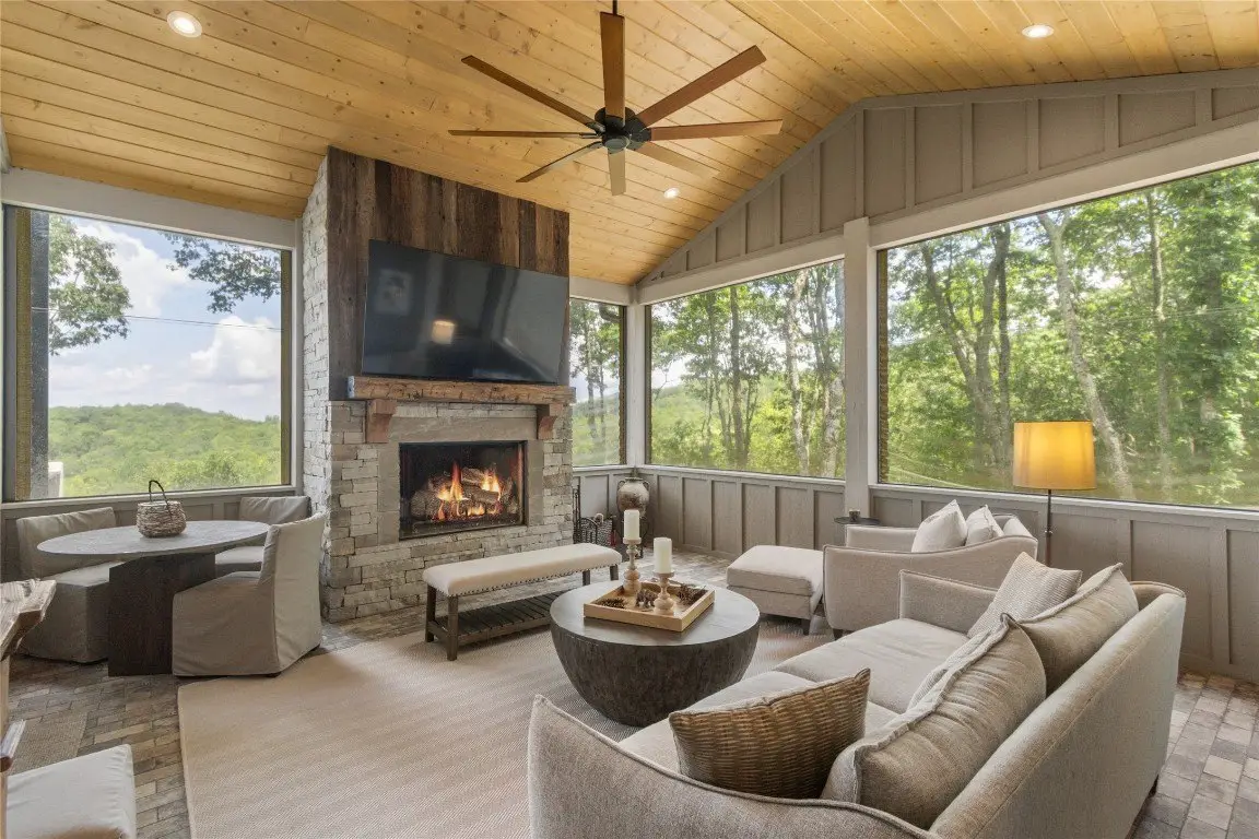Perched at a breathtaking 4,300 feet in elevation, this stunning mountain home in Glenridge offers sweeping panoramic views over miles of untouched national forest. Nestled beside the vibrant Chinquapin community and bordering the serene Panthertown National Forest, Glenridge is a small, private estate enclave just 8 easy miles from the Cashiers Crossroads — the perfect blend of privacy and convenience. This impeccably maintained, turnkey home is the epitome of mountain elegance, combining cozy cottage charm with high-end finishes and designer furnishings throughout. The inviting carport leads to a spacious mudroom with abundant storage and a seamless entry to the kitchen — ideal for storing hiking boots and easily unloading groceries. One of the standout features is the expansive three-season screened porch, which functions as a second living room. Complete with a wood-burning fireplace and custom screens, it's a warm and inviting space for year-round enjoyment. Just outside, an open porch leads to a beautifully landscaped and hardscaped fire pit area — perfect for gathering under the stars. All three bedrooms offer ensuite full bathrooms, and there's an additional private bonus room with its own bathroom — ideal for flexible use. Every finish throughout the home is custom, high-quality, and thoughtfully curated. Situated on just under three lush, beautifully landscaped acres with a flat driveway and easy access, the property is as practical as it is picturesque. Peaceful, private, and perched "on top of the world," this mountain sanctuary is truly a must-see to appreciate its beauty and craftsmanship.