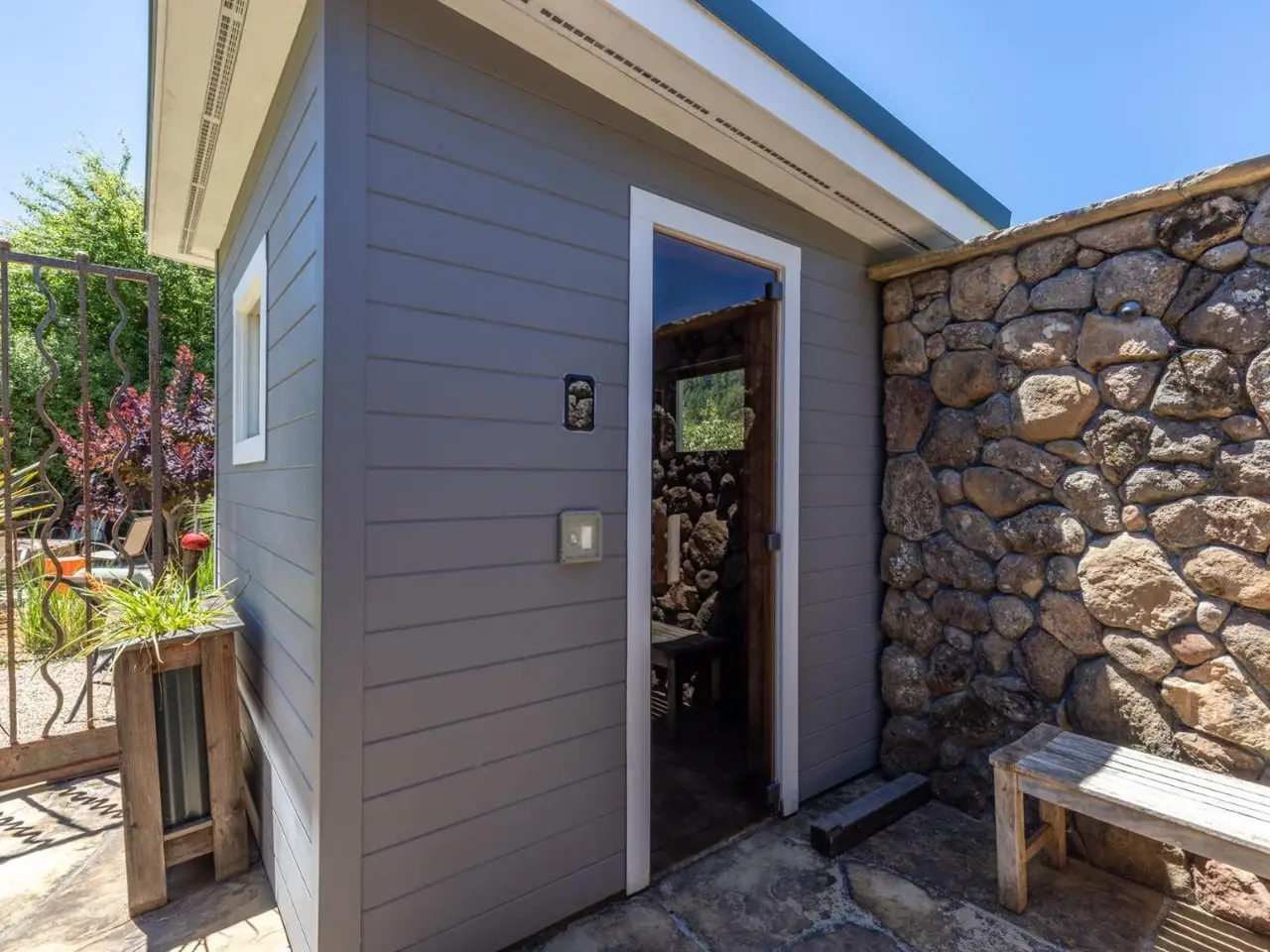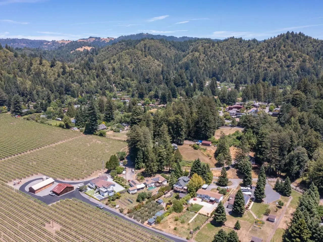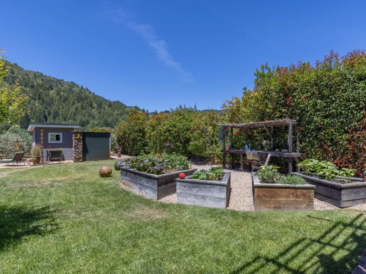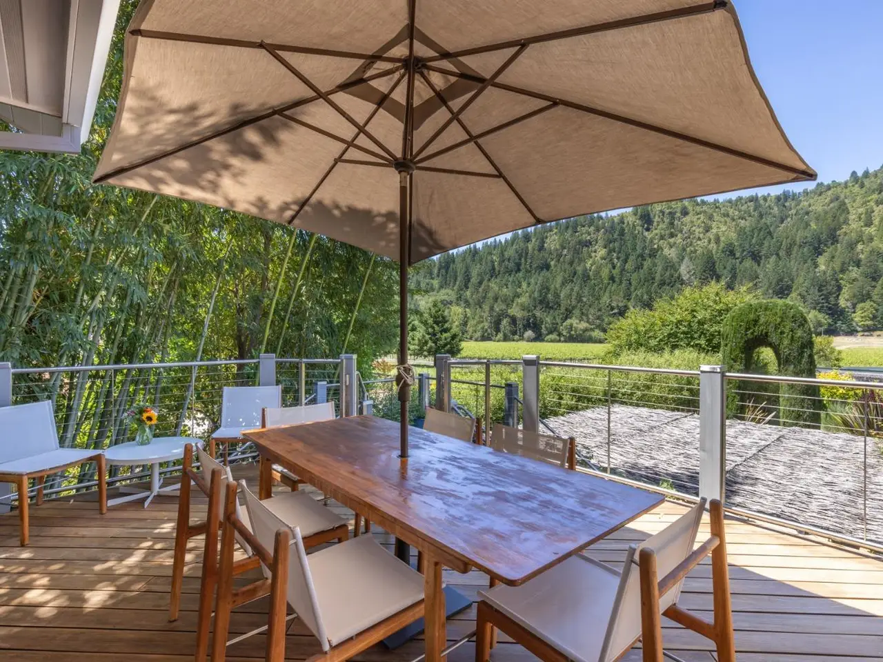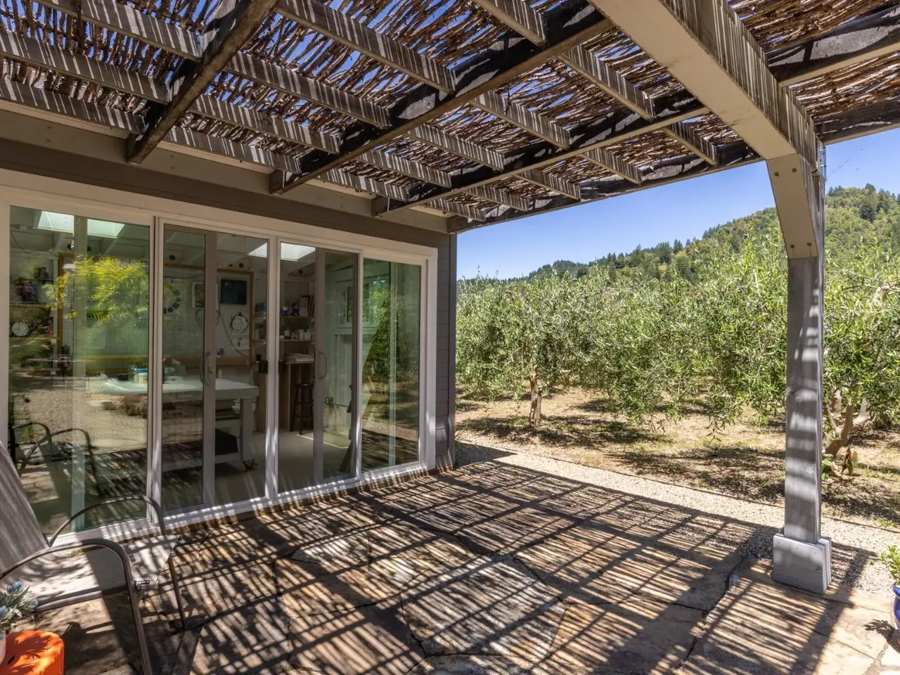 Escape to your own private oasis in this exquisite luxury property, where priceless views of the Korbel vineyard and the majestic mountains of the Russian River Valley set a breathtaking backdrop. Furnished with items meticulously curated by the acclaimed Zeitgeist Sonoma, every detail is expertly coordinated. Custom-built features and high-end finishes adorn every corner, making this home truly unique. The second-floor main level is ideal for entertaining friends or unwinding on the expansive covered deck while taking in the beauty that surrounds you. On the ground floor, a versatile fourth bedroom could be used as a game room or second living space, complete with a built-in Murphy bed and direct garden and spa access. Upstairs, the primary suite boasts a resort-like bath and walk-in closet. Outside, explore an expansive garden featuring artfully arranged garden beds, lush lawn, generous shaded patio, a firepit, craft studio, sauna with stone-walled shower, various fruit trees, and thriving olive orchard. From energy-efficient upgrades to advanced water filtration systems, no detail has been overlooked. Just a short walk from downtown Guerneville, yet nestled away from the hustle and bustle, this property offers a vacation-like setting you can cherish every day.