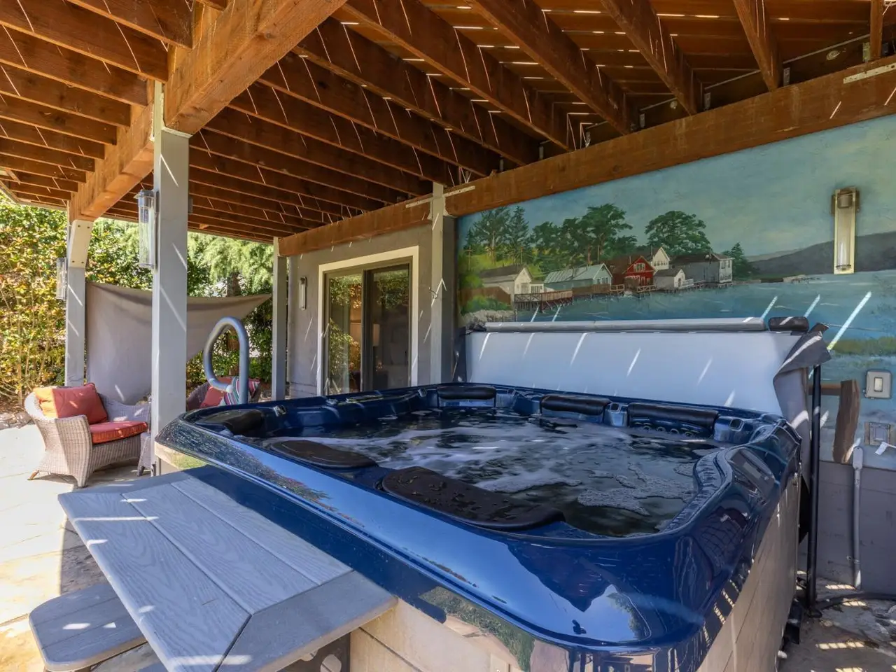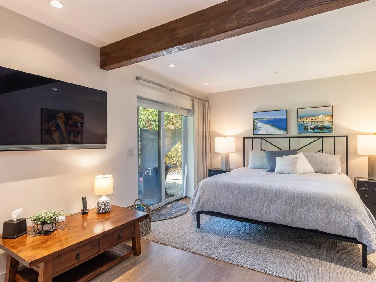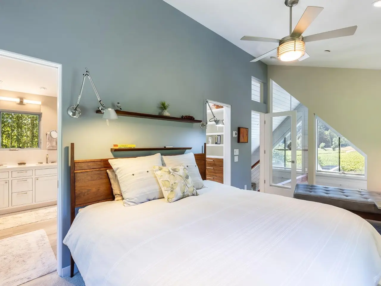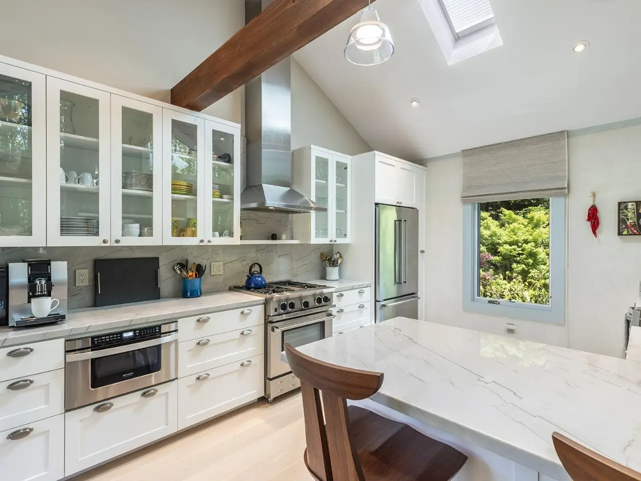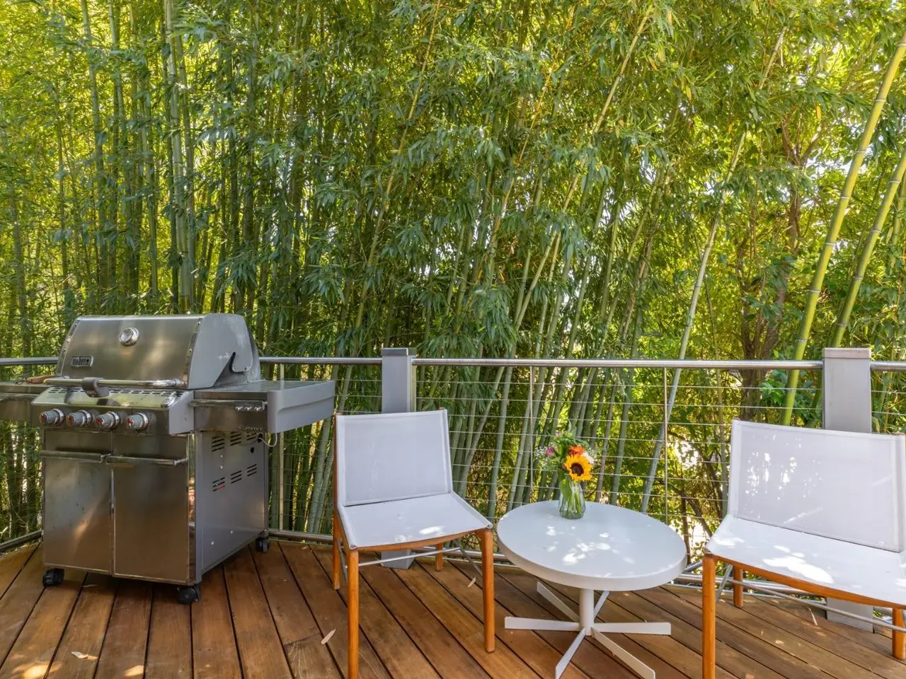 Escape to your own private oasis in this exquisite luxury property, where priceless views of the Korbel vineyard and the majestic mountains of the Russian River Valley set a breathtaking backdrop. Furnished with items meticulously curated by the acclaimed Zeitgeist Sonoma, every detail is expertly coordinated. Custom-built features and high-end finishes adorn every corner, making this home truly unique. The second-floor main level is ideal for entertaining friends or unwinding on the expansive covered deck while taking in the beauty that surrounds you. On the ground floor, a versatile fourth bedroom could be used as a game room or second living space, complete with a built-in Murphy bed and direct garden and spa access. Upstairs, the primary suite boasts a resort-like bath and walk-in closet. Outside, explore an expansive garden featuring artfully arranged garden beds, lush lawn, generous shaded patio, a firepit, craft studio, sauna with stone-walled shower, various fruit trees, and thriving olive orchard. From energy-efficient upgrades to advanced water filtration systems, no detail has been overlooked. Just a short walk from downtown Guerneville, yet nestled away from the hustle and bustle, this property offers a vacation-like setting you can cherish every day.
