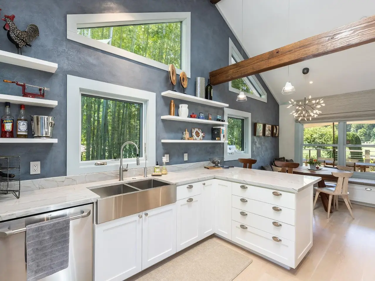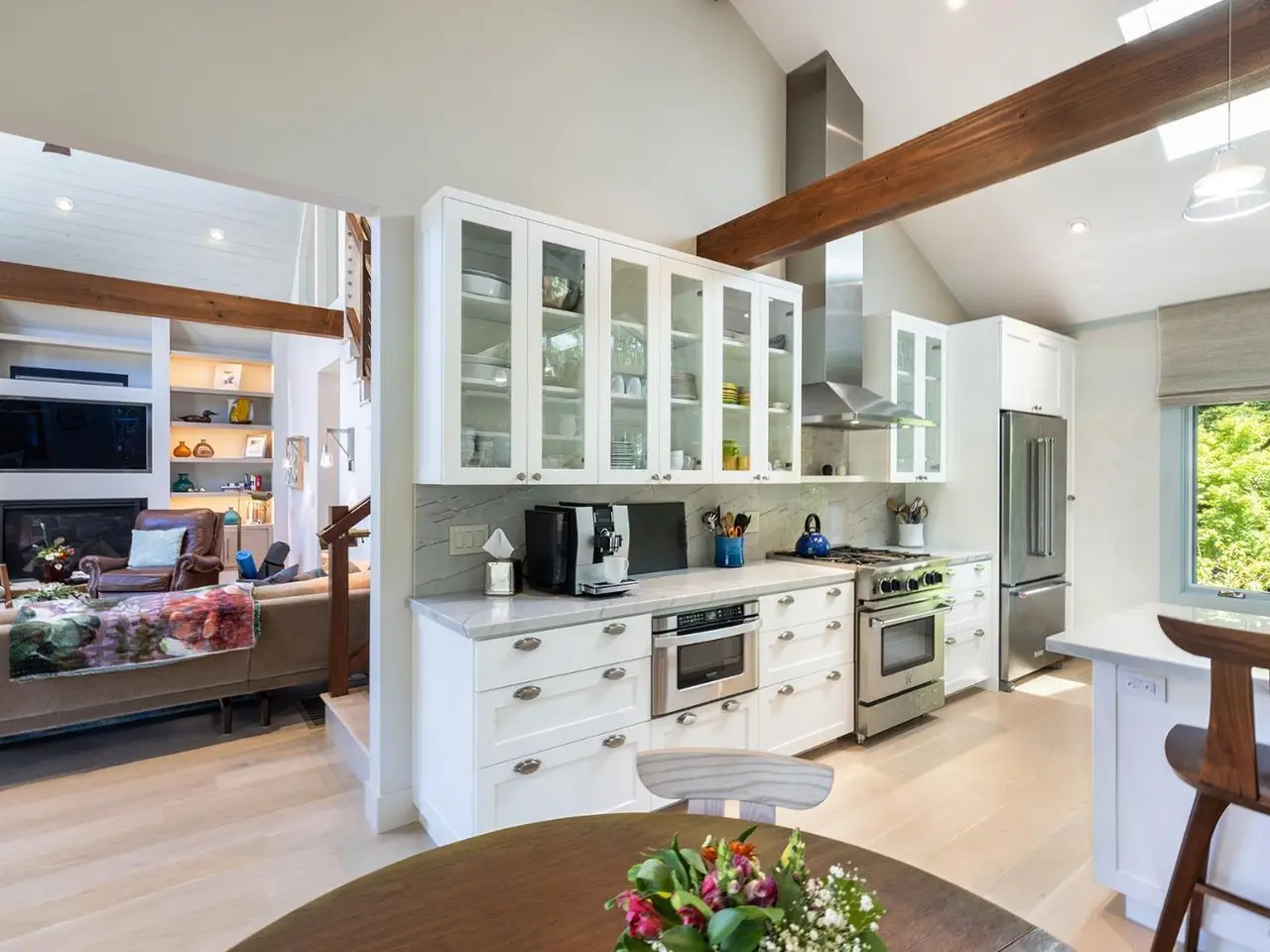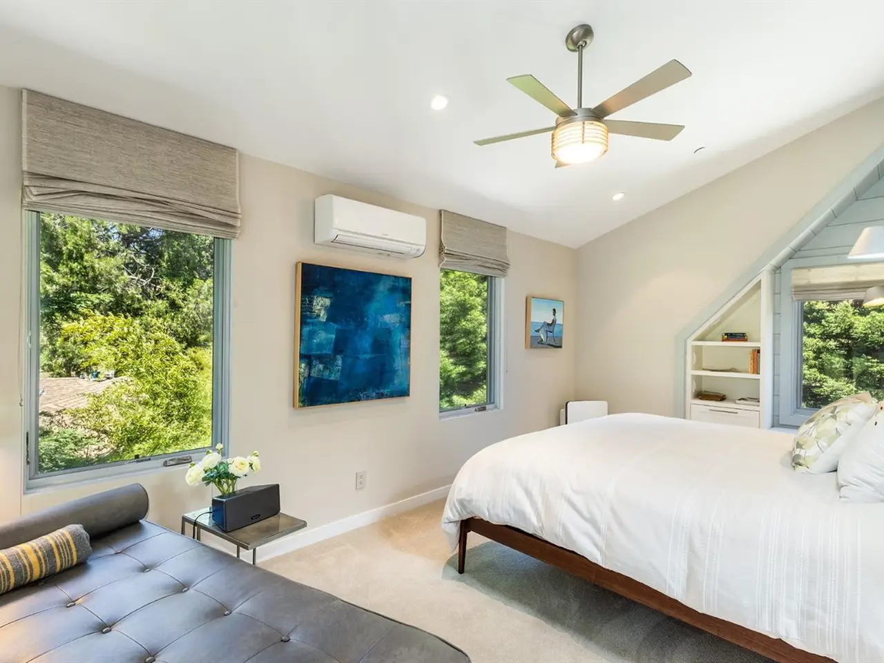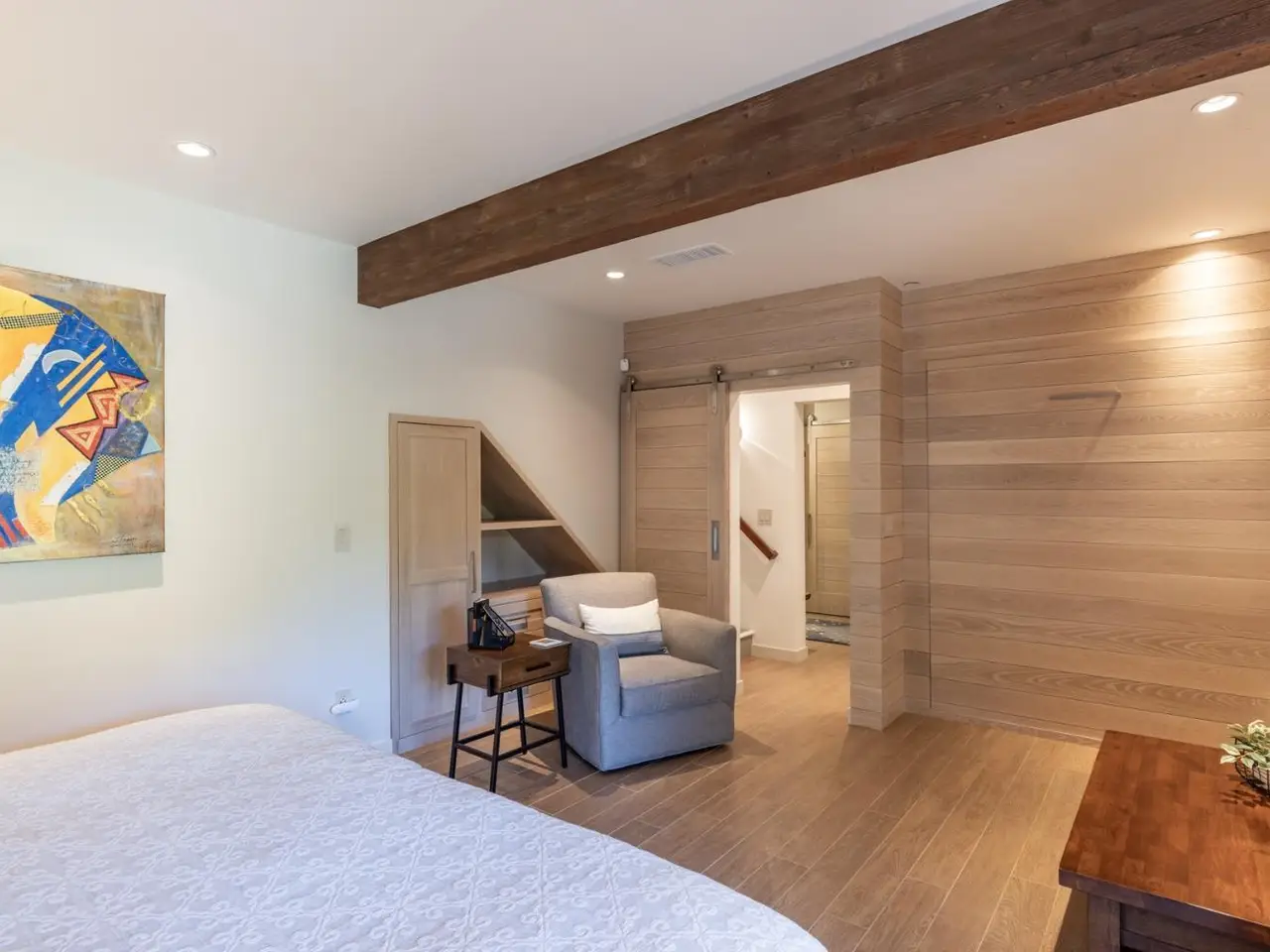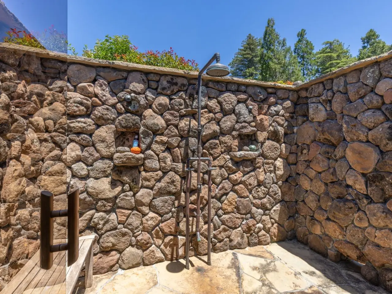 Escape to your own private oasis in this exquisite luxury property, where priceless views of the Korbel vineyard and the majestic mountains of the Russian River Valley set a breathtaking backdrop. Furnished with items meticulously curated by the acclaimed Zeitgeist Sonoma, every detail is expertly coordinated. Custom-built features and high-end finishes adorn every corner, making this home truly unique. The second-floor main level is ideal for entertaining friends or unwinding on the expansive covered deck while taking in the beauty that surrounds you. On the ground floor, a versatile fourth bedroom could be used as a game room or second living space, complete with a built-in Murphy bed and direct garden and spa access. Upstairs, the primary suite boasts a resort-like bath and walk-in closet. Outside, explore an expansive garden featuring artfully arranged garden beds, lush lawn, generous shaded patio, a firepit, craft studio, sauna with stone-walled shower, various fruit trees, and thriving olive orchard. From energy-efficient upgrades to advanced water filtration systems, no detail has been overlooked. Just a short walk from downtown Guerneville, yet nestled away from the hustle and bustle, this property offers a vacation-like setting you can cherish every day.