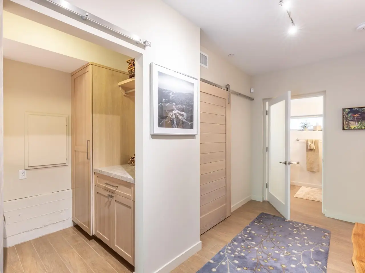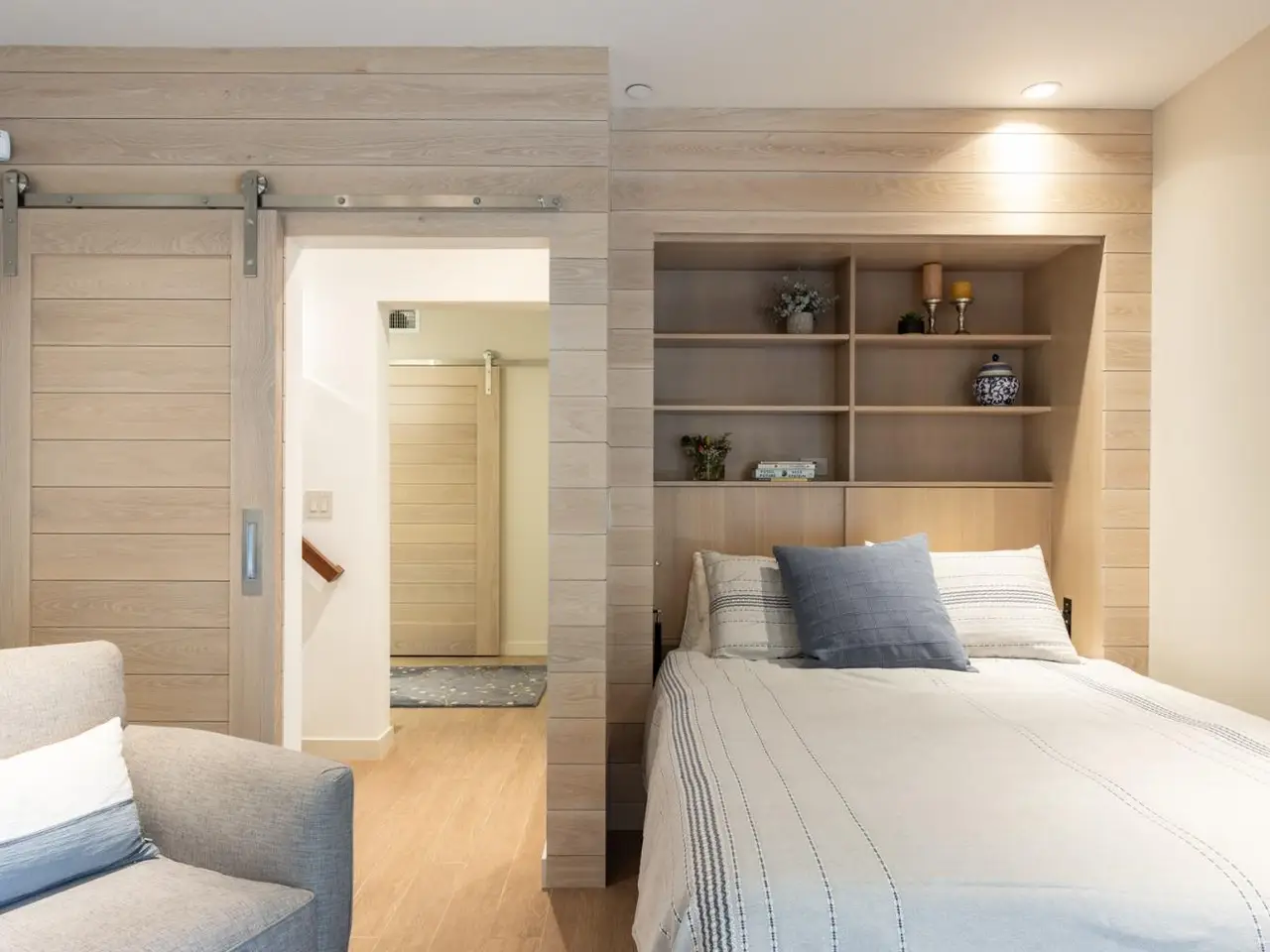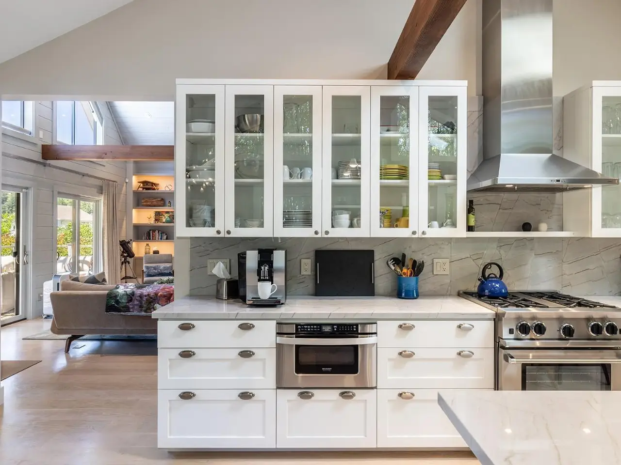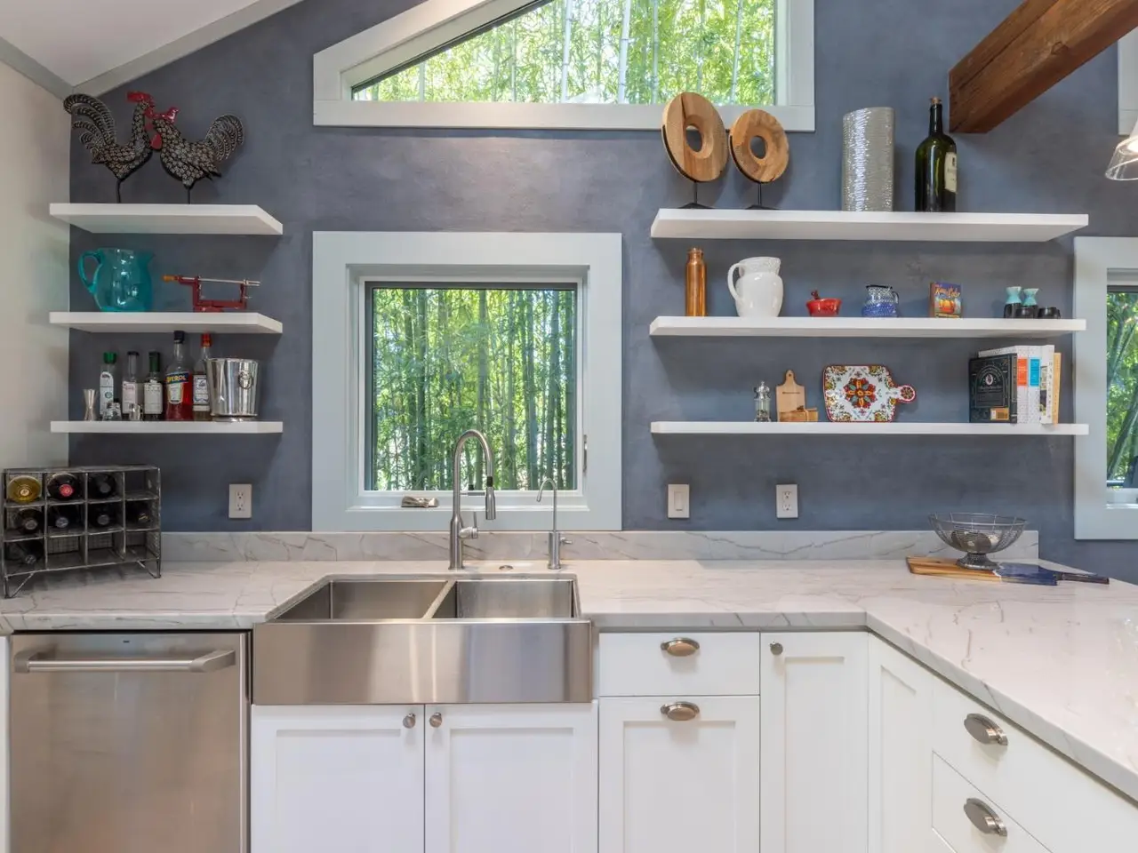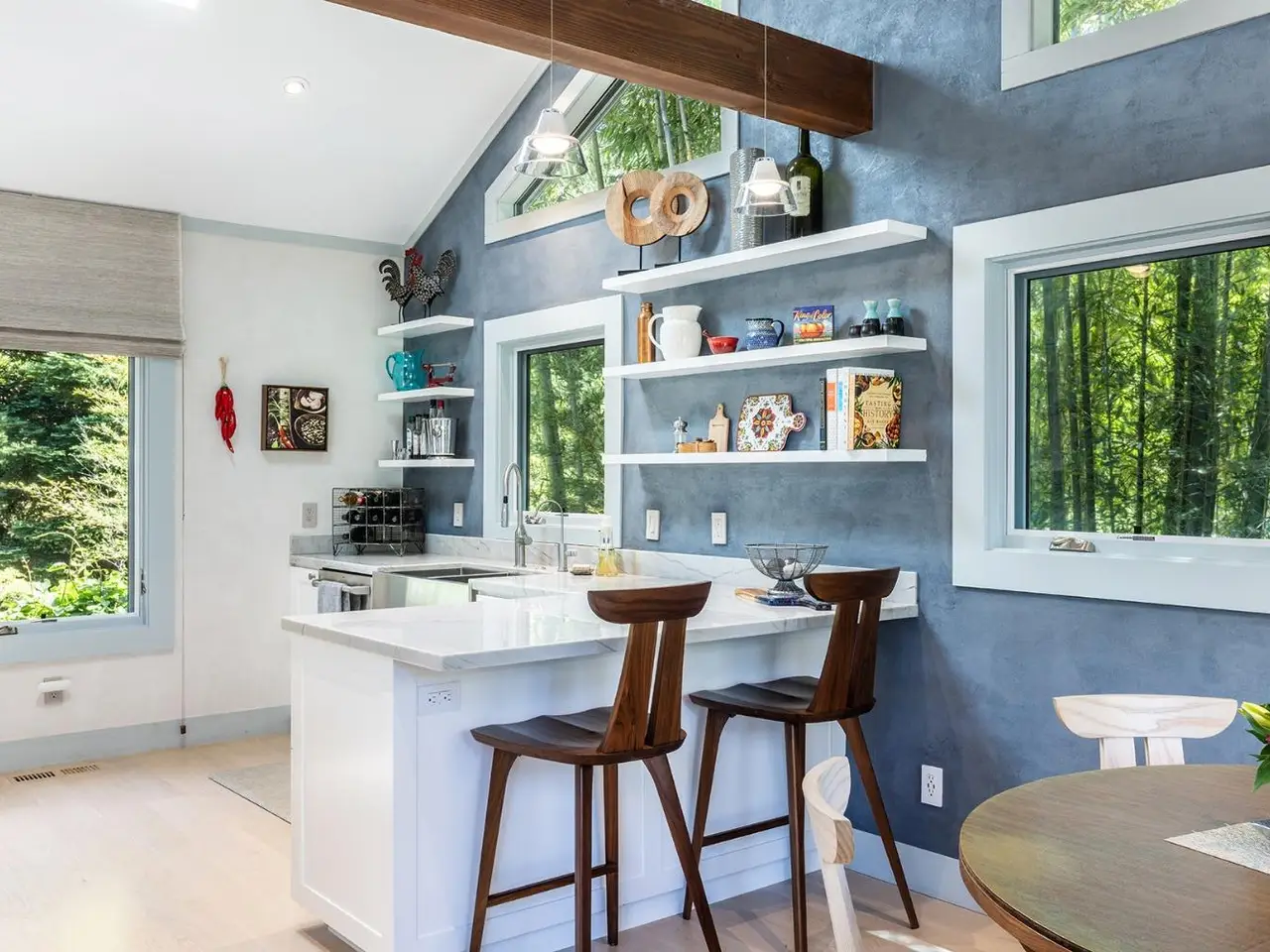 Escape to your own private oasis in this exquisite luxury property, where priceless views of the Korbel vineyard and the majestic mountains of the Russian River Valley set a breathtaking backdrop. Furnished with items meticulously curated by the acclaimed Zeitgeist Sonoma, every detail is expertly coordinated. Custom-built features and high-end finishes adorn every corner, making this home truly unique. The second-floor main level is ideal for entertaining friends or unwinding on the expansive covered deck while taking in the beauty that surrounds you. On the ground floor, a versatile fourth bedroom could be used as a game room or second living space, complete with a built-in Murphy bed and direct garden and spa access. Upstairs, the primary suite boasts a resort-like bath and walk-in closet. Outside, explore an expansive garden featuring artfully arranged garden beds, lush lawn, generous shaded patio, a firepit, craft studio, sauna with stone-walled shower, various fruit trees, and thriving olive orchard. From energy-efficient upgrades to advanced water filtration systems, no detail has been overlooked. Just a short walk from downtown Guerneville, yet nestled away from the hustle and bustle, this property offers a vacation-like setting you can cherish every day.