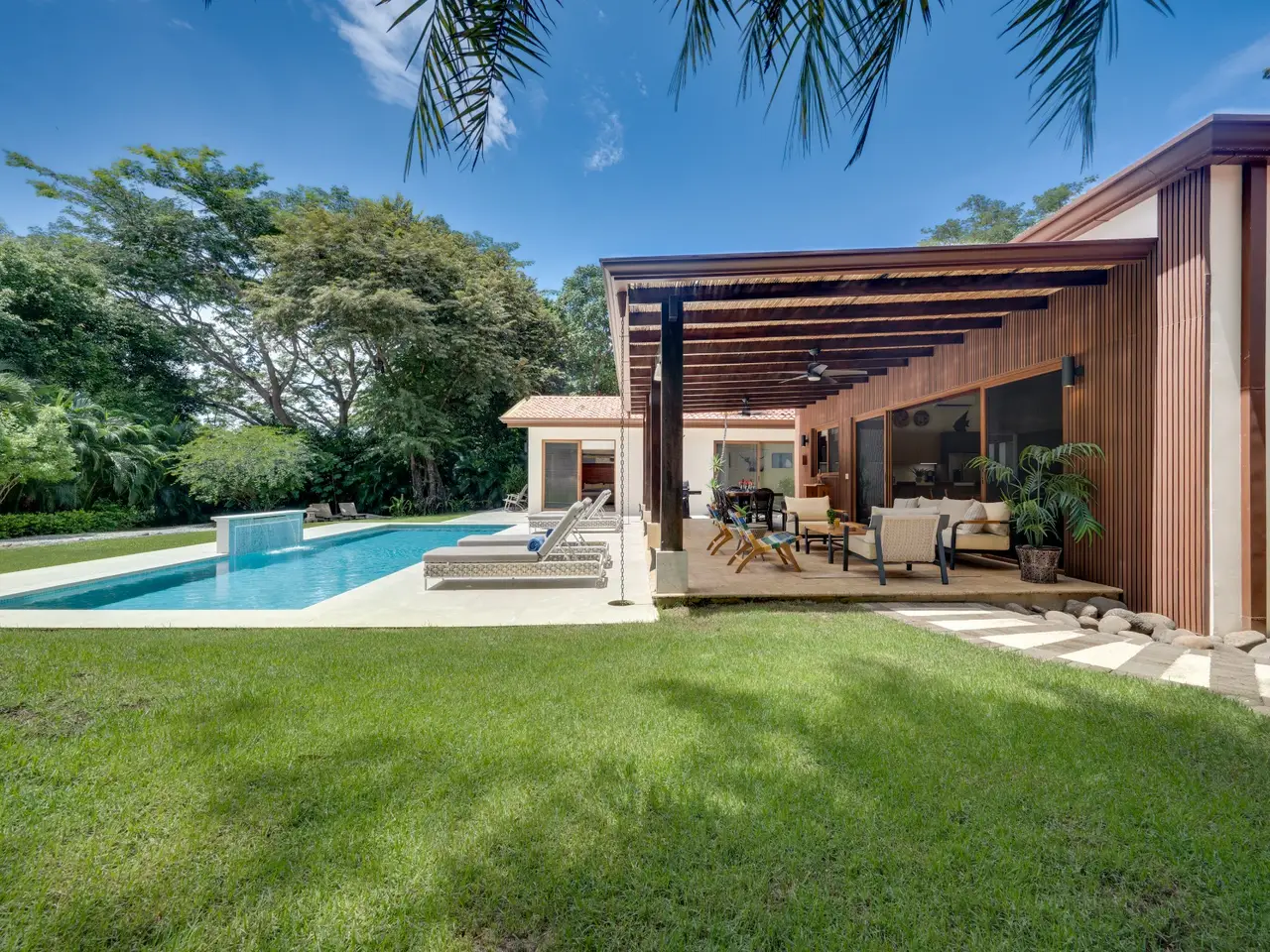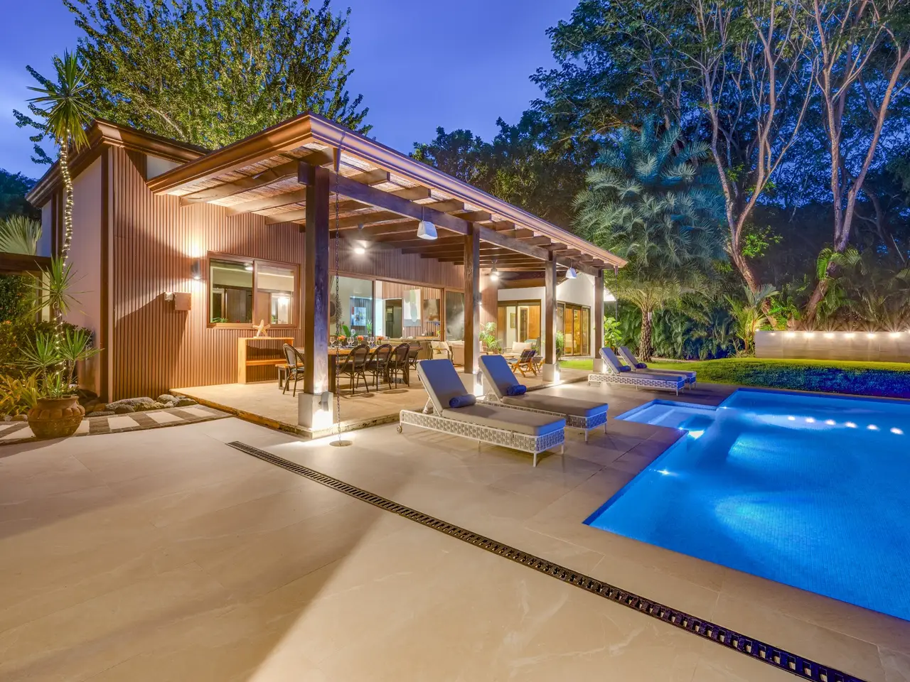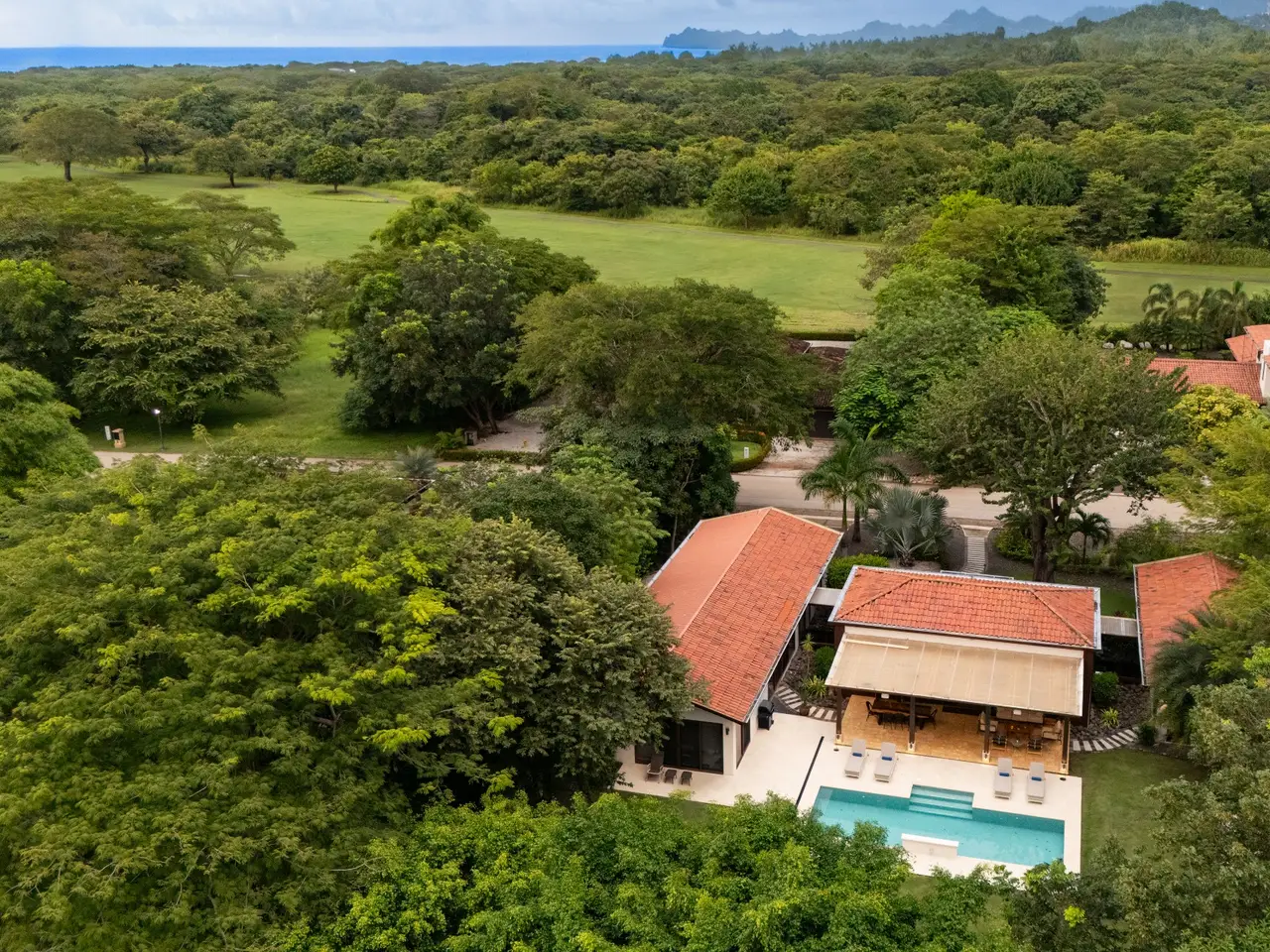 Casa Pachote – Luxury Living in Hacienda PinillaWelcome to Casa Pachote, an exquisite 4-bedroom, 4.5-bath luxury home in the prestigious Reserva de Golf community of Hacienda Pinilla. Recently refreshed with an $80,000 remodel, this residence blends contemporary sophistication with the inviting warmth of tropical living.Step inside and you’ll immediately feel the home’s open, airy ambiance. The living room radiates a welcoming, homey charm, framed by large patio doors that seamlessly connect indoor and outdoor spaces. Whether you’re relaxing with family or entertaining guests, the flow between the indoor living and outdoor dining areas creates an effortless sense of comfort and connection to nature.At the heart of the home is a chef’s kitchen, featuring elegant built-in appliances, a waterfall porcelain island, and matching counters and backsplash. A convenient pass-through window opens to the covered patio - perfect for serving meals al fresco or enjoying morning coffee by the pool.Designed in a distinctive “H” shape, the home’s layout balances privacy and harmony. Each wing hosts a master suite and guest bedroom, connected by a softly lit glass walkway that glows beautifully at night. This architectural touch highlights the home’s modern aesthetic.Every bedroom offers its own en-suite bathroom, ensuring privacy and comfort for family and guests alike. The two grand master suites are true sanctuaries: each with indoor sitting areas, King beds, and patio doors opening directly to the sparkling pool terrace. One master bedroom features an indoor and outdoor shower for a serene, spa-like experience.Step outside to your private tropical oasis. The expansive 11’ x 33’ pool with a tranquil waterfall and color-changing Pentair Glo lights becomes the centerpiece of the backyard as it is surrounded by lush landscaping, mature palms, and vibrant greenery that ensure total privacy. Thoughtfully placed landscape lighting creates a magical atmosphere after sunset, making the evenings just as beautiful as the days.The property is as practical as it is beautiful. Enjoy the convenience of an AstroTurf front lawn, in-ground sprinkler and drip irrigation systems, a whole-house water filtration and softening system, six-zone AC, and automatic blinds. The new outdoor deck space, new décor, and select furnishings complete the remodel, enhancing the home’s refined style.Additional highlights include:Spacious two-car garage with ample storageNew outdoor furniture and pool loungersExtensive exterior lighting on all sidesGolf cart charging outletFive TVs includedFully furnished and move-in ready, with all kitchenware includedFreshly painted exteriorAccess to all the amenities of Hacienda Pinilla including: golf, tennis, world-class surfing, beach club, miles of biking and hiking trails, restaurants, gym, etc Casa Pachote, Reserva de Golf 75 isn’t just a home—it’s a lifestyle. Offering a rare combination of luxury, comfort, and tranquility, it’s perfect as a full-time residence or high-end vacation retreat.? Experience the beauty of Hacienda Pinilla living, where every detail invites you to slow down, breathe, and feel at home.Contact us today to schedule your private showing.