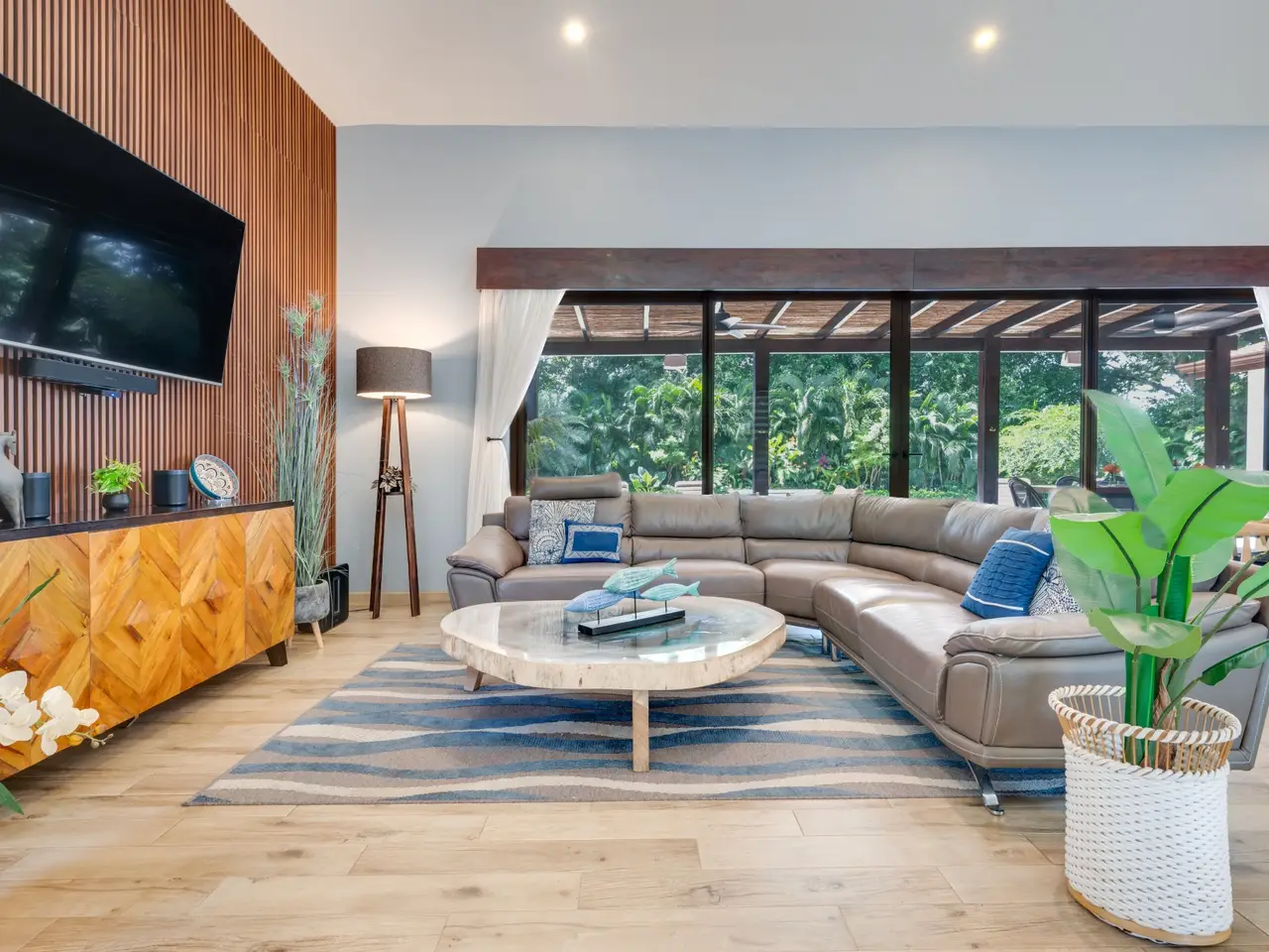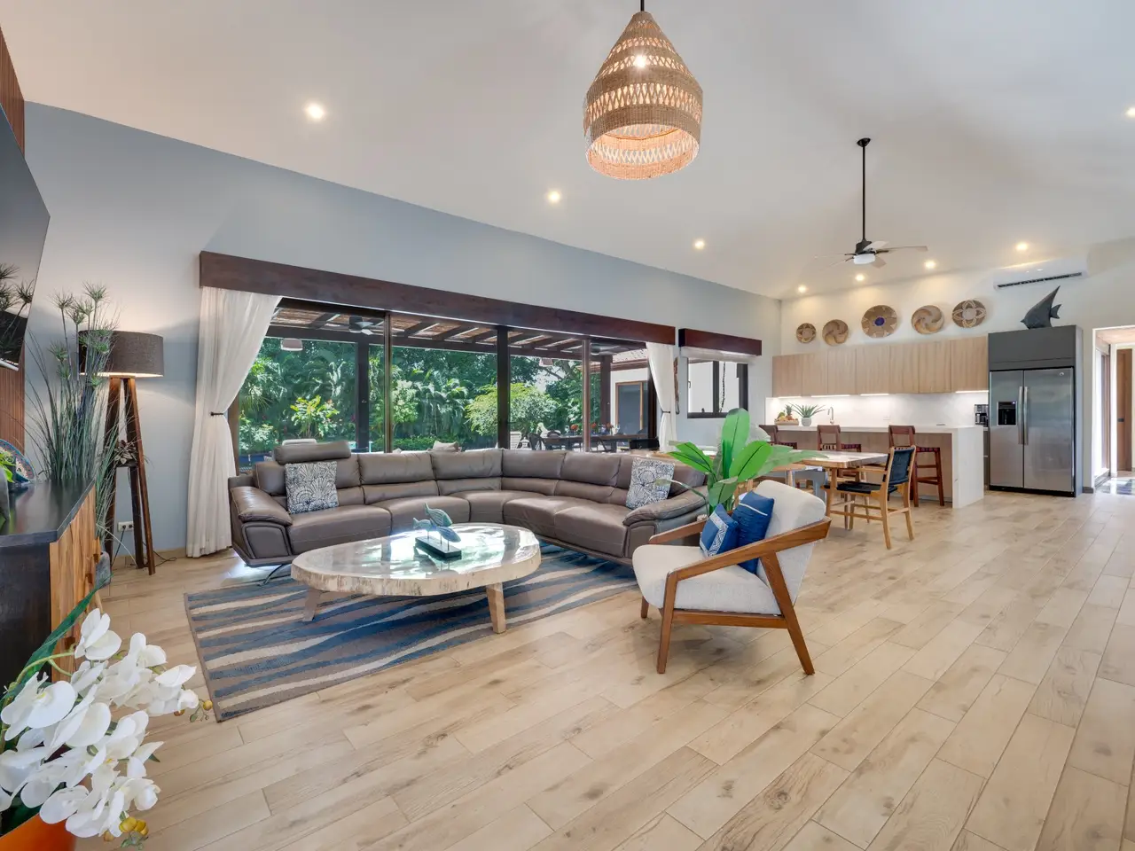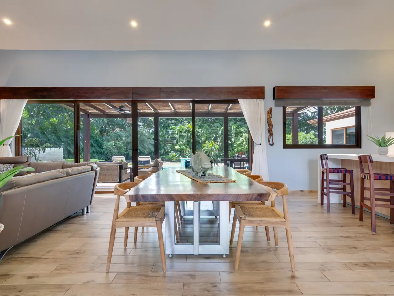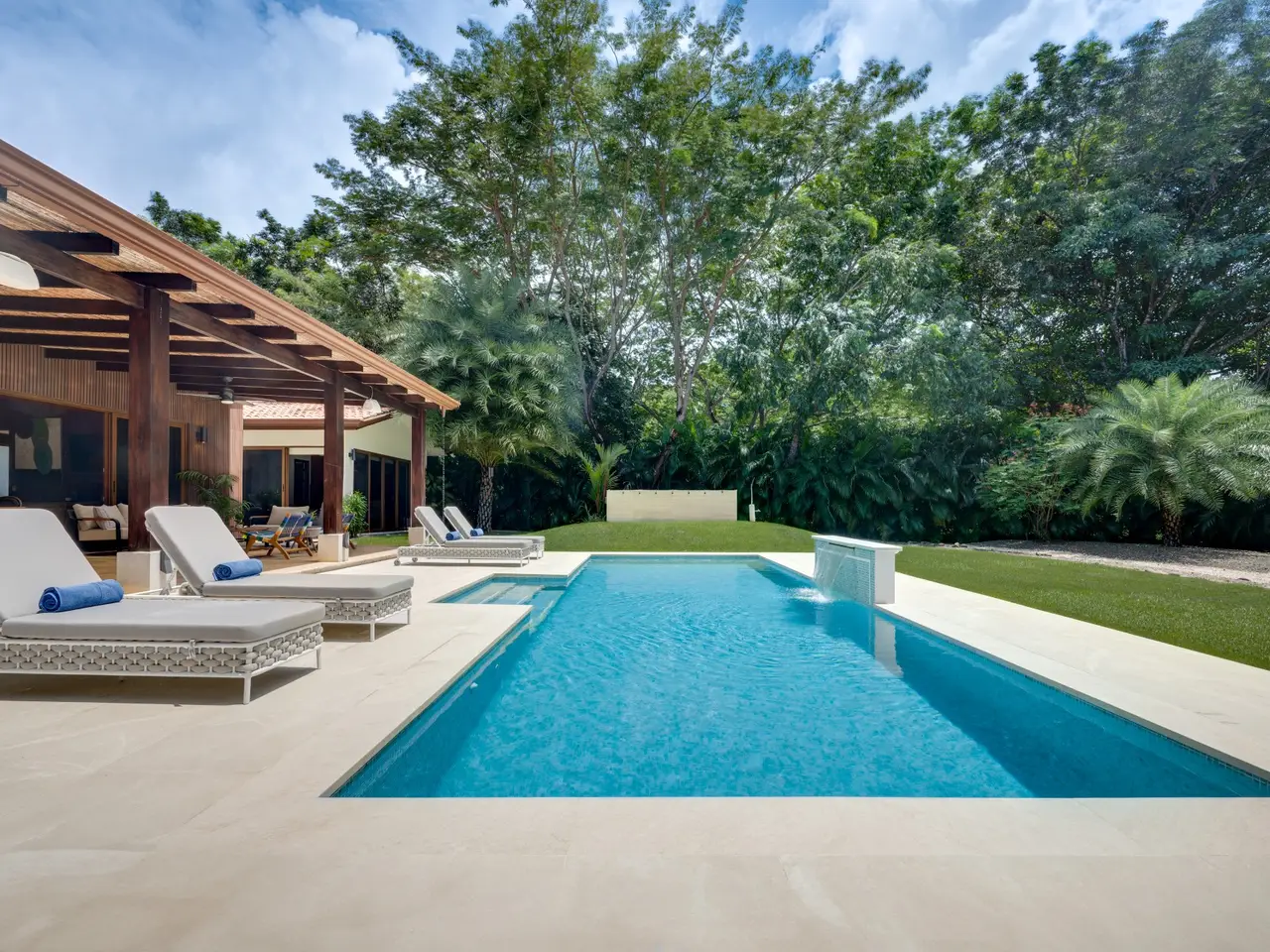 Casa Pachote – Luxury Living in Hacienda PinillaWelcome to Casa Pachote, an exquisite 4-bedroom, 4.5-bath luxury home in the prestigious Reserva de Golf community of Hacienda Pinilla. Recently refreshed with an $80,000 remodel, this residence blends contemporary sophistication with the inviting warmth of tropical living.Step inside and you’ll immediately feel the home’s open, airy ambiance. The living room radiates a welcoming, homey charm, framed by large patio doors that seamlessly connect indoor and outdoor spaces. Whether you’re relaxing with family or entertaining guests, the flow between the indoor living and outdoor dining areas creates an effortless sense of comfort and connection to nature.At the heart of the home is a chef’s kitchen, featuring elegant built-in appliances, a waterfall porcelain island, and matching counters and backsplash. A convenient pass-through window opens to the covered patio - perfect for serving meals al fresco or enjoying morning coffee by the pool.Designed in a distinctive “H” shape, the home’s layout balances privacy and harmony. Each wing hosts a master suite and guest bedroom, connected by a softly lit glass walkway that glows beautifully at night. This architectural touch highlights the home’s modern aesthetic.Every bedroom offers its own en-suite bathroom, ensuring privacy and comfort for family and guests alike. The two grand master suites are true sanctuaries: each with indoor sitting areas, King beds, and patio doors opening directly to the sparkling pool terrace. One master bedroom features an indoor and outdoor shower for a serene, spa-like experience.Step outside to your private tropical oasis. The expansive 11’ x 33’ pool with a tranquil waterfall and color-changing Pentair Glo lights becomes the centerpiece of the backyard as it is surrounded by lush landscaping, mature palms, and vibrant greenery that ensure total privacy. Thoughtfully placed landscape lighting creates a magical atmosphere after sunset, making the evenings just as beautiful as the days.The property is as practical as it is beautiful. Enjoy the convenience of an AstroTurf front lawn, in-ground sprinkler and drip irrigation systems, a whole-house water filtration and softening system, six-zone AC, and automatic blinds. The new outdoor deck space, new décor, and select furnishings complete the remodel, enhancing the home’s refined style.Additional highlights include:Spacious two-car garage with ample storageNew outdoor furniture and pool loungersExtensive exterior lighting on all sidesGolf cart charging outletFive TVs includedFully furnished and move-in ready, with all kitchenware includedFreshly painted exteriorAccess to all the amenities of Hacienda Pinilla including: golf, tennis, world-class surfing, beach club, miles of biking and hiking trails, restaurants, gym, etc Casa Pachote, Reserva de Golf 75 isn’t just a home—it’s a lifestyle. Offering a rare combination of luxury, comfort, and tranquility, it’s perfect as a full-time residence or high-end vacation retreat.? Experience the beauty of Hacienda Pinilla living, where every detail invites you to slow down, breathe, and feel at home.Contact us today to schedule your private showing.