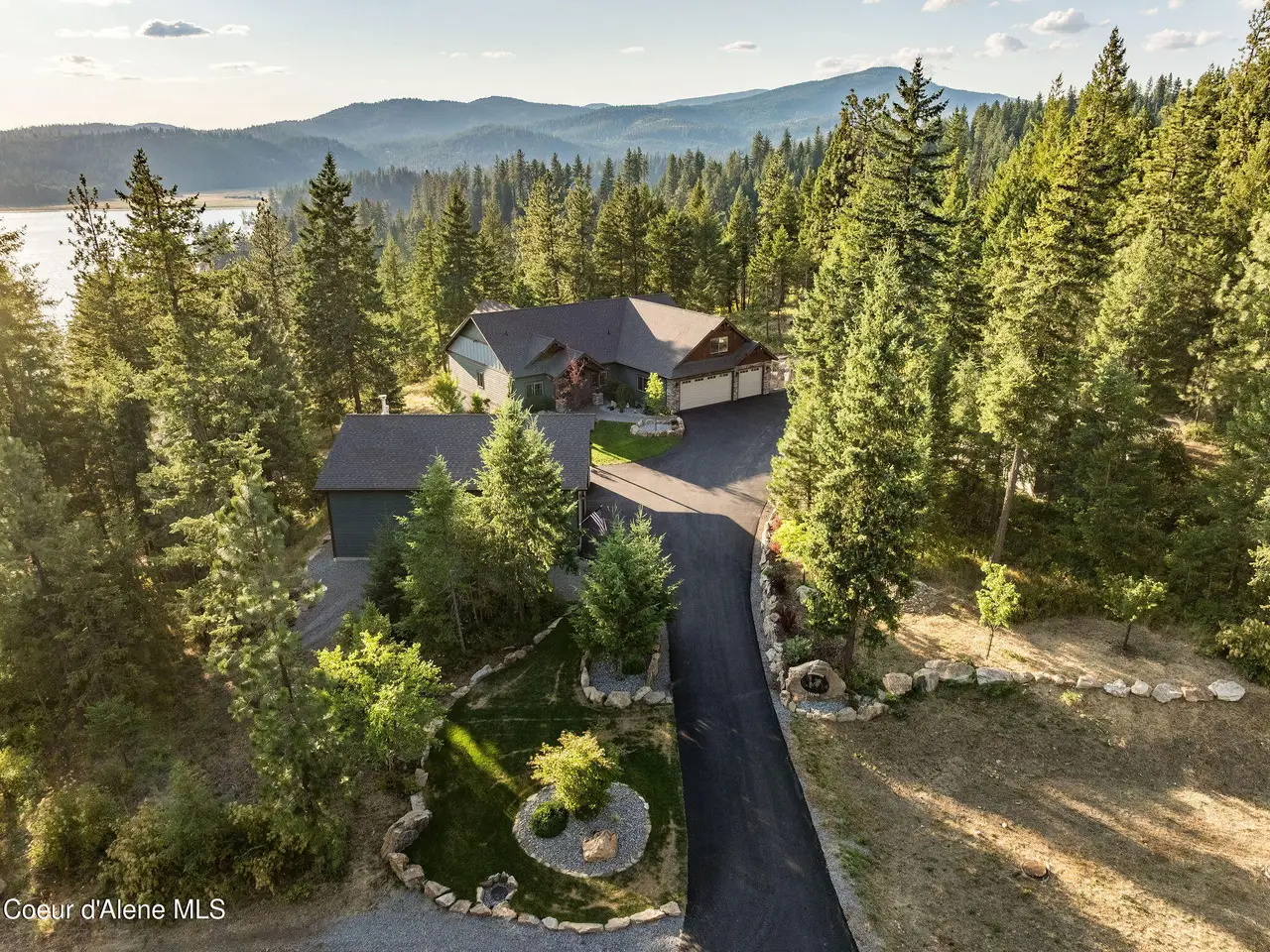 Peaceful Hauser Lake property with refined living await you in this custom 2625 square foot home with 3 bedrooms + bonus rm(4th bedroom), 2 full baths, & 2 half baths. Enjoy lake views from the kitchen, living room, and bedrooms, or relax on the covered deck that faces the Lake - perfect for morning coffee or evening sunsets. The gourmet kitchen features granite countertops, a large island, and opens to a spacious living area with a cozy fireplace. The primary suite includes a private deck & serene views. Outdoors, enjoy wooded privacy, a fenced garden, and dog run on 3.37 acres within a gated community, plus access to a private beach with dock. The heated/cooled bunkhouse is ideal for guests or workspace. A standout 36x40 finished shop features a wood stove, heat, and half bath - an absolute dream for hobbyists or storage. Located just blocks from Embers Pizza, this home combines elegance, comfort, and lifestyle.
