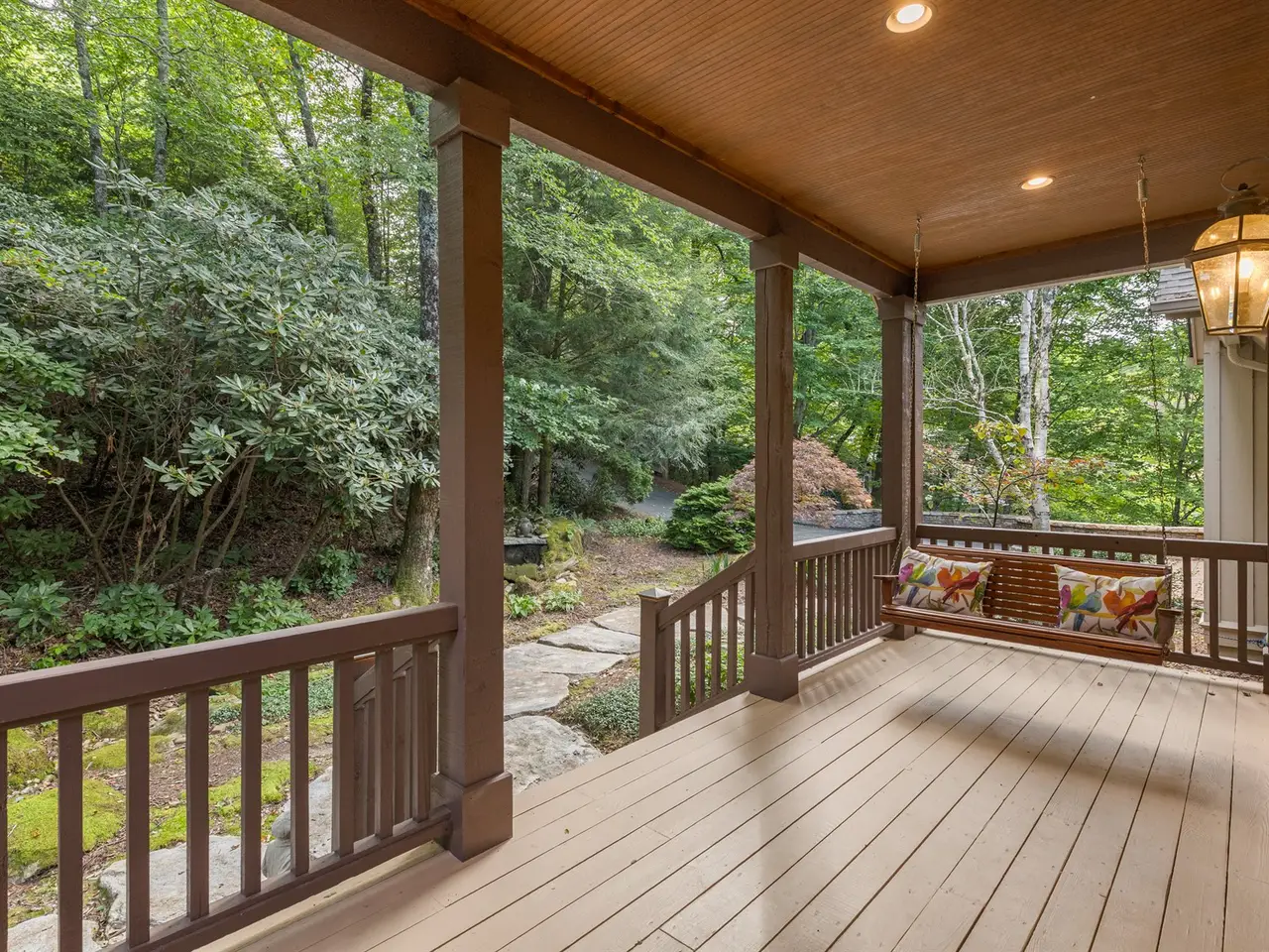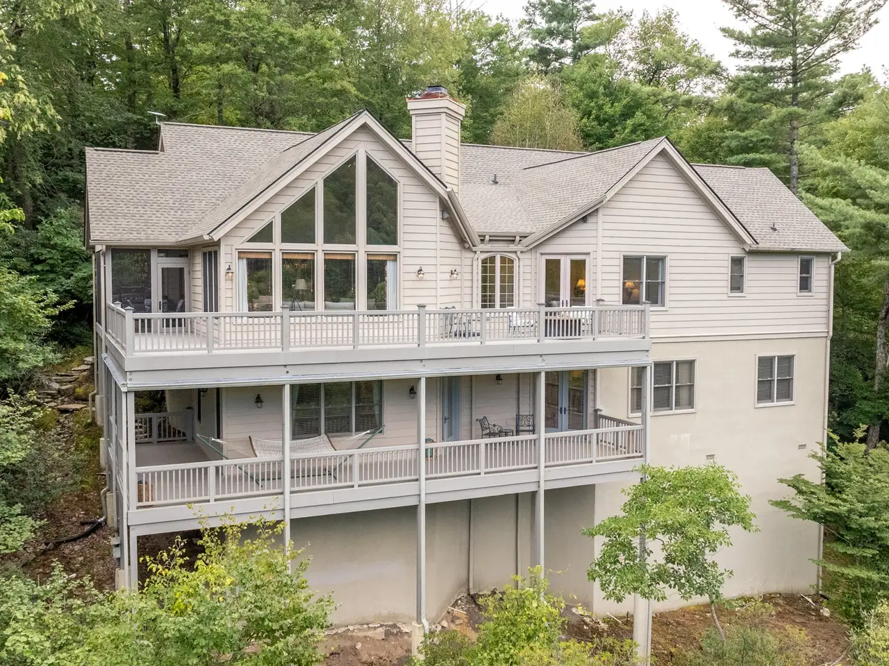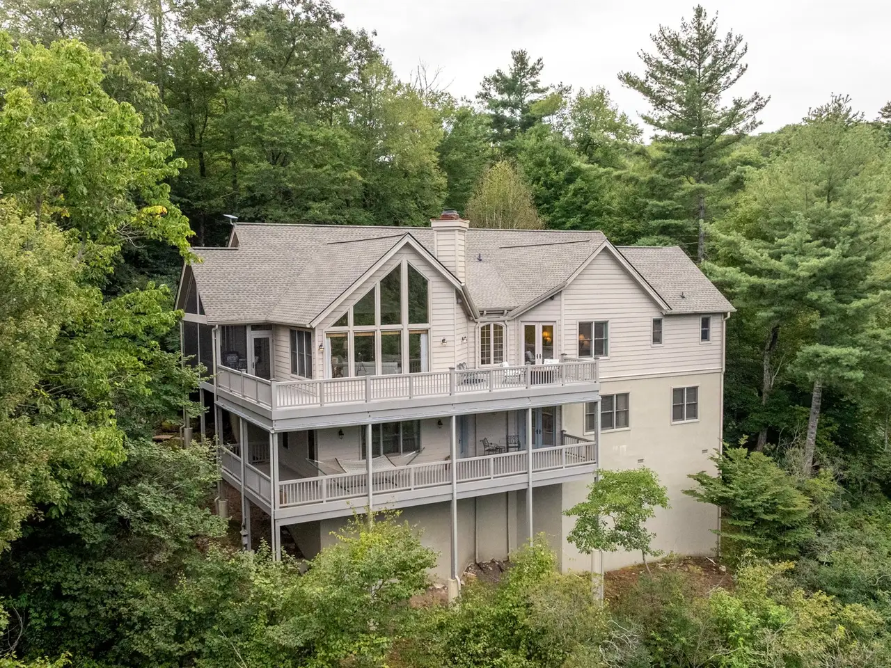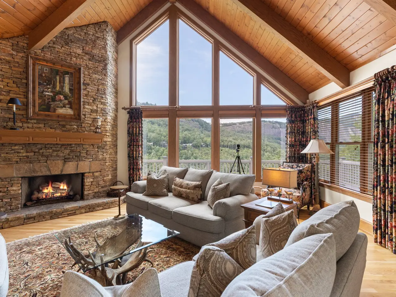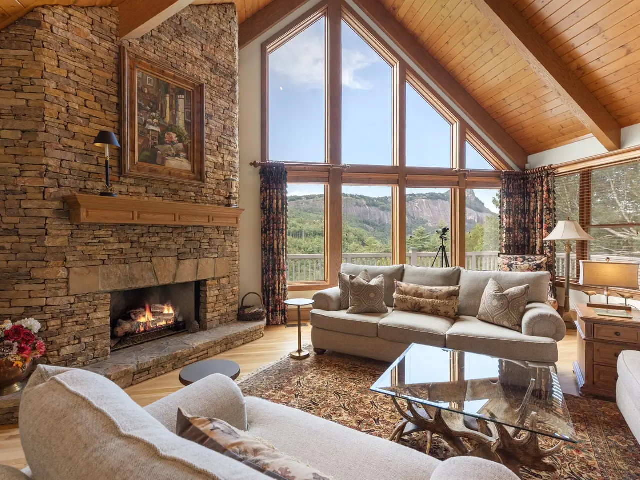 This is the panoramic BIG VIEW! Prepare to be captivated by sweeping, unobstructed views of iconic Whiteside Mountain from this stunning Highlands Falls Falcon Ridge residence, a home so remarkable it has been featured twice in Architectural Digest. Designed with generous proportions and effortless flow, the home offers main-level living with the primary suite conveniently located on the entry level. Architectural details abound, highlighted by custom wormy chestnut and oak features throughout, including an impressive 3? solid wormy chestnut entry door. The primary suite commands breathtaking mountain views and sunrises and boasts a lavish Italian marble bath with soaking tub, oversized shower, dual lighted mirrors, hidden lighted vanity, Kohler fixtures, custom walk-in closets, and a private wet bar with sink and mini-fridge. The open-concept living, dining, and kitchen spaces flow seamlessly onto a screened porch with a fully outfitted grilling station featuring a Blaze grill?an entertainer's dream with Whiteside Mountain as the backdrop. The main level also conveniently includes a guest bedroom, full bath, office/den with custom glass paned wormy chestnut and oak door, and a full laundry room with sink. The lower level provides for guest privacy with a second living area with fireplace, private deck, two spacious en-suite bedrooms, powder room, bonus/flex room with gym/playroom potential, and a secondary laundry area. Recent upgrades are extensive, including a remodeled kitchen, refinished hardwood floors, 27 new windows, new roof, gutters with guards, encapsulated crawlspace, repaved driveway with focal pavers, updated HVAC systems, new water heaters with recirculation pump, blown-in attic insulation, new gas logs in main level fireplace, and view clearing to fully showcase dramatic views of Whiteside Mountain, Wildcat Ridge, and Cullasaja Club beyond. A drainage system beneath the upper deck ensures protection for the lower-level outdoor living area. Peace of mind comes with a 500-gallon fresh water reserve tank and a whole-house generator. A two-car garage with workshop, along with a welcoming exterior accented by a serene water feature, completes this mountain sanctuary. This Highlands Falls home is more than a residence?it is a retreat of timeless architecture, meticulous updates, and awe-inspiring views. Membership to Highlands Falls CC is not mandatory but the amenities are tremendous and the club is vibrant.