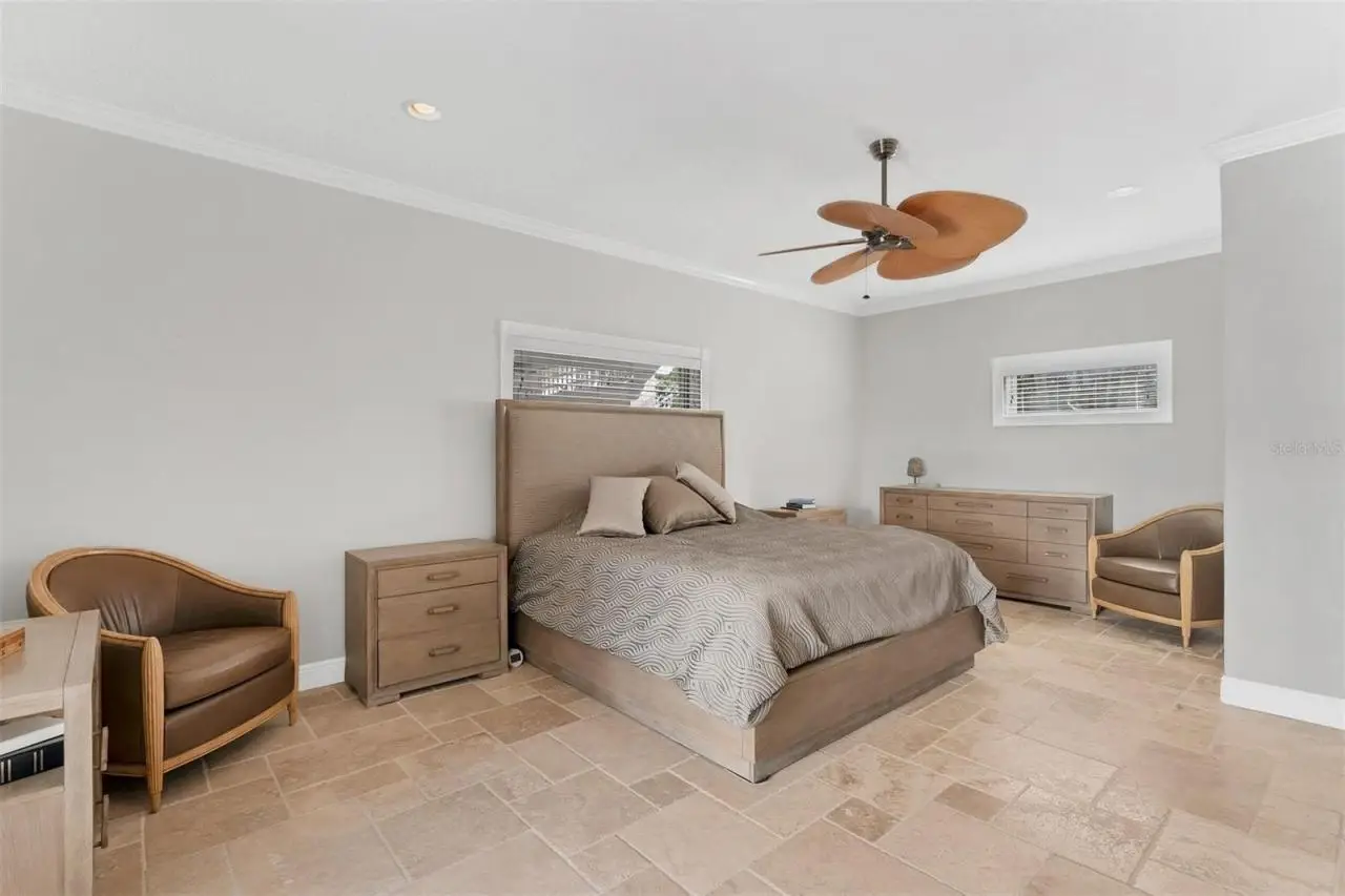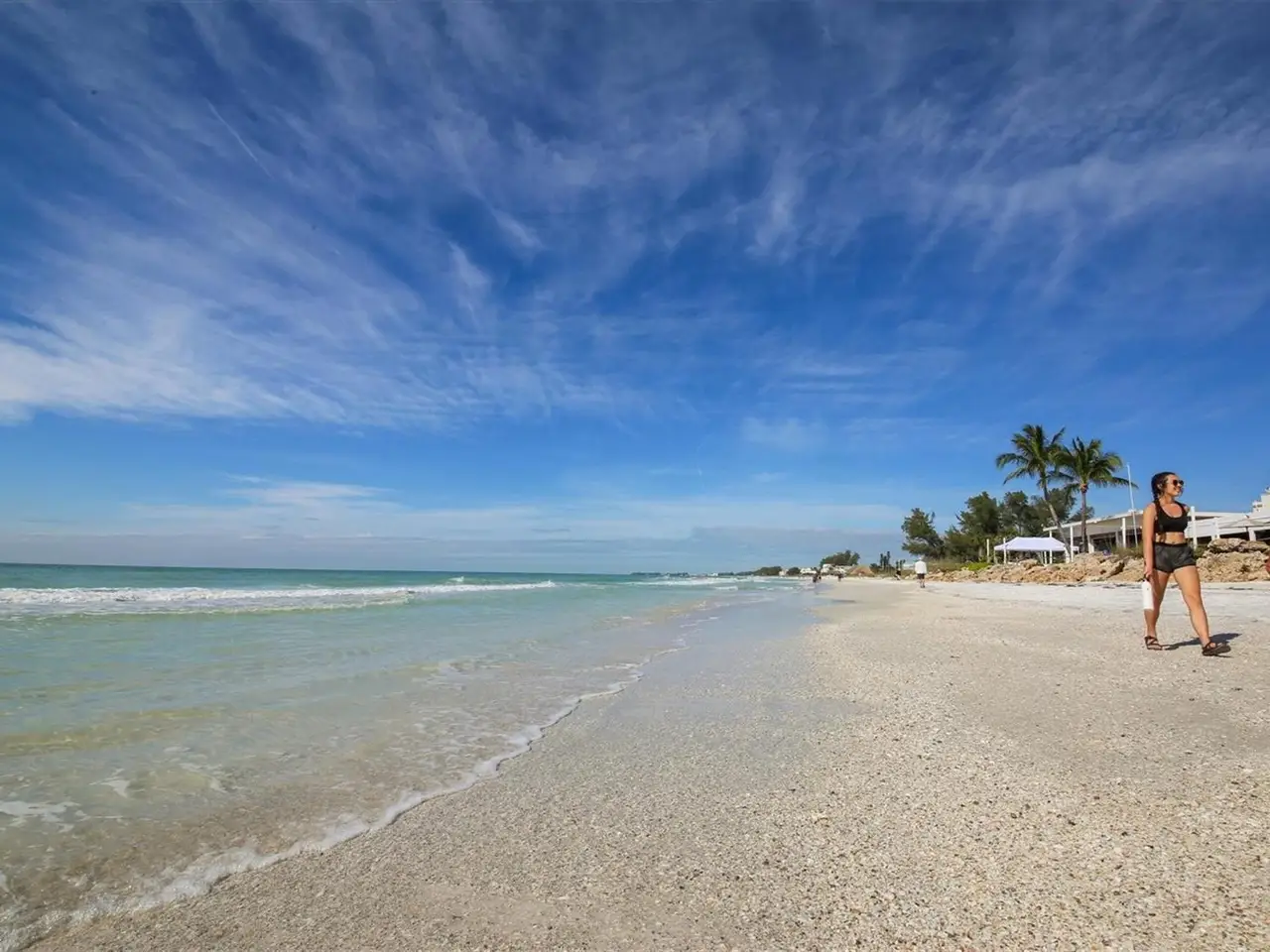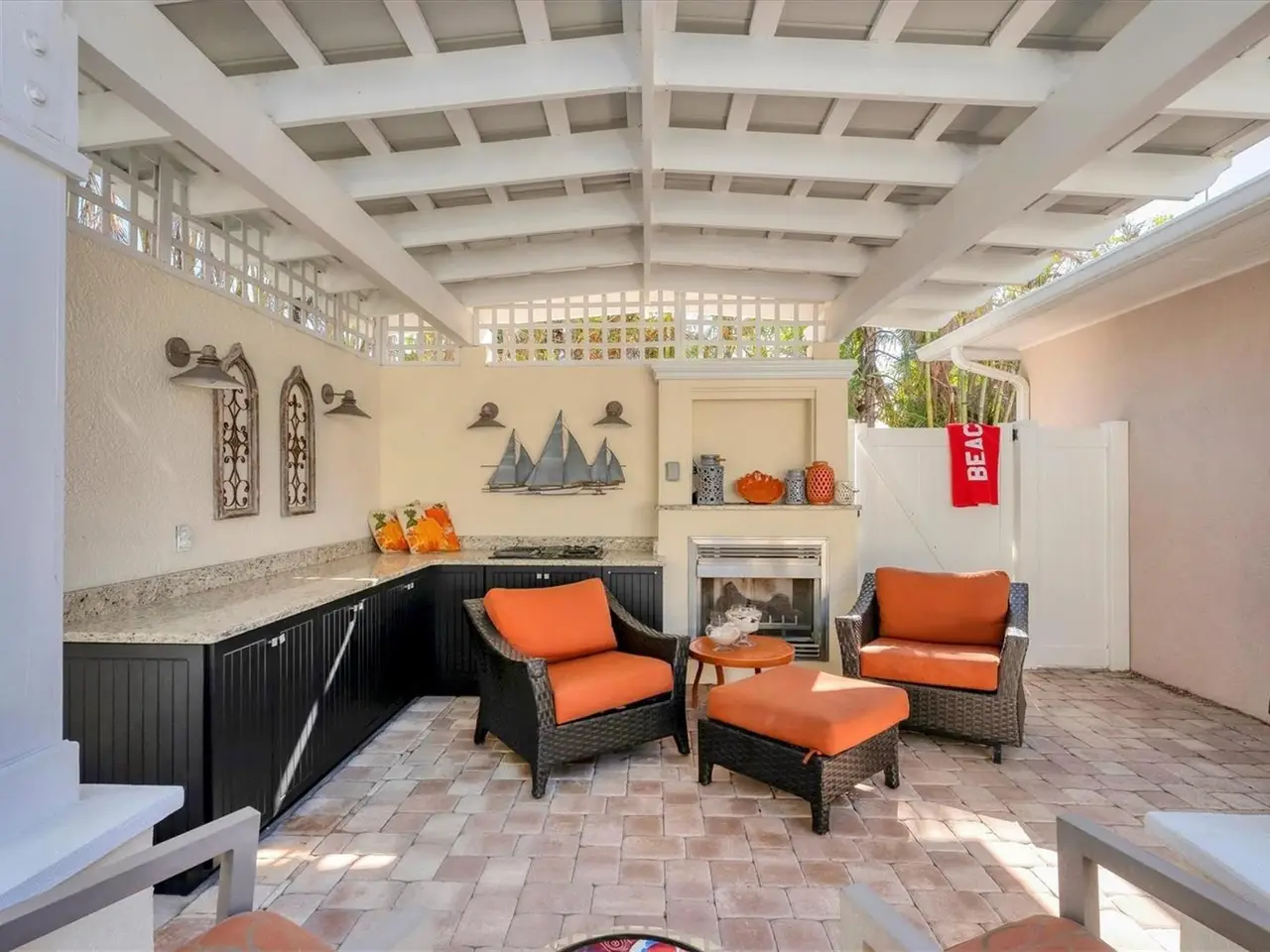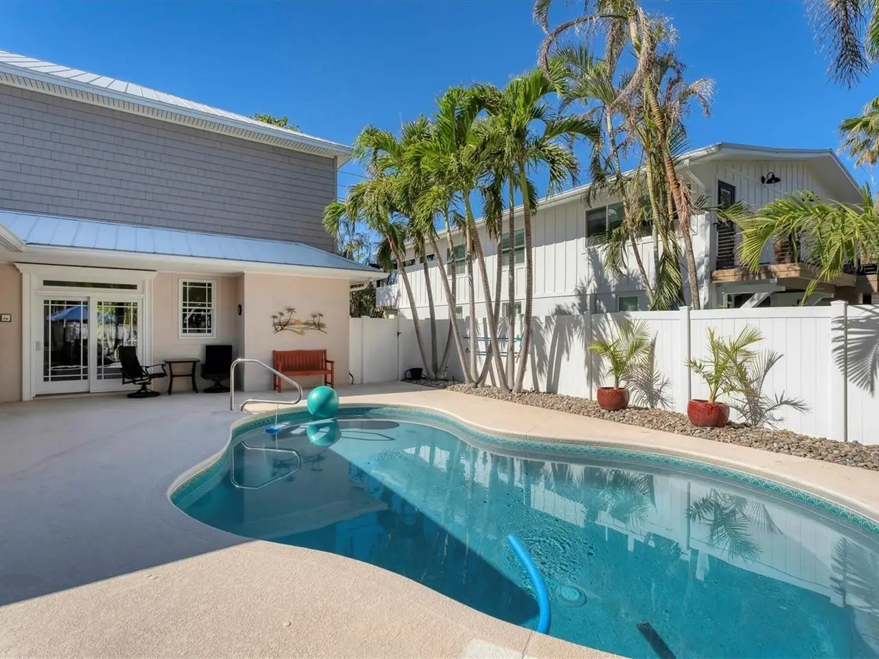Location, location, location! This beautiful custom home in West Wind Shores is just across the street from the beach and minutes from Anna Maria Island. With an oasis-like backyard and swimming pool, this property offers the ultimate coastal lifestyle. Custom features abound, including high ceilings, arched entryways, travertine flooring, plantation shutters, 5-inch baseboards, recessed lighting, and large walk-in closets. As you enter through the front French doors, you're greeted by a cozy main living area complete with a gas fireplace. To the right, a versatile bonus space awaits, ideal for a dining area or hobby room. The thoughtfully designed split floor plan flows seamlessly, offering two primary bedrooms-one on each floor. The kitchen is a chef's delight, featuring granite countertops, custom cabinetry, newer Bosch appliances, including a Wolf gas stovetop with electric Wolf oven (rare on the island), a breakfast bar with pendant lighting, a glass-tiled backsplash, a wine refrigerator, and elegant travertine flooring. The downstairs primary suite overlooks the pool and offers ample space and luxurious details, including an oversized marble-tiled shower with a glass enclosure, dual sinks, extra storage, and a makeup/dressing table. Upstairs, the second primary suite boasts a large walk-in closet, an ensuite bath, and double doors leading to a loft area with large, picturesque windows that invite you to relax with a book in the afternoon light. The third bedroom is currently being used as an office, complete with built-in bookshelves and a Murphy bed for added flexibility. Sliding glass doors lead to a backyard oasis featuring palm trees, a pergola, a partially covered paver patio, and a completely fenced-in yard. The heated pool and outdoor kitchen, complete with a gas fireplace, create the perfect setting for entertaining. The space is wired for cable, allowing you to enjoy your favorite games while lounging or barbecuing. For pet lovers, there is a separate fenced area and a convenient storage shed. This custom home combines luxury, comfort, and an unbeatable location near the beach and Anna Maria Island. Convenient and complimentary trolley across the street. Walk across the street for sunset every night on the other side of a tall building complex. Don't miss your chance to own this coastal retreat