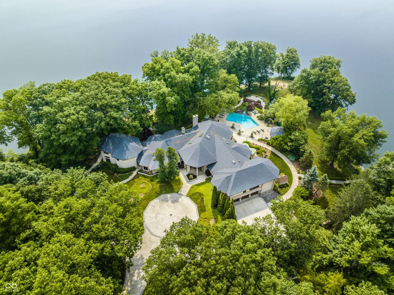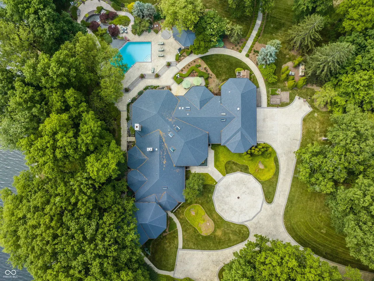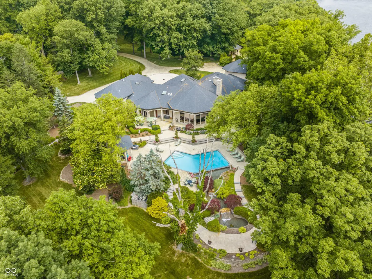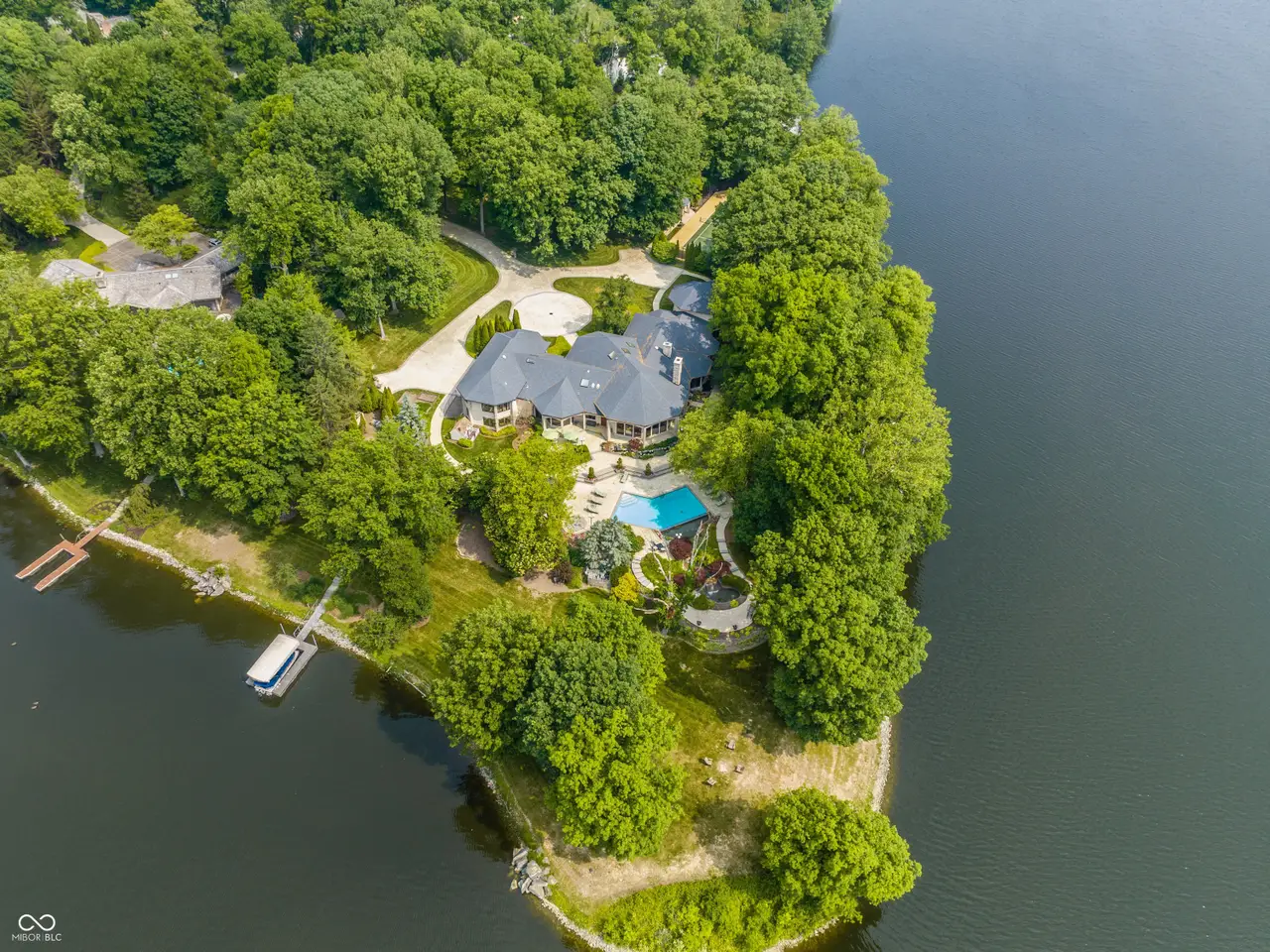 Exclusivity at its finest, this gated estate expands over 5.5 acres and is perfectly situated to capture breathtaking, panoramic views with 1,250 feet of water frontage on Eagle Creek Reservoir. The lush oasis creates the feeling of a serene, private sanctuary featuring a koi pond that spans the back of the home, Gunite swimming pool & spa w/cabana & tennis court w/cabana. A spacious great room welcomes guests w/expansive bay windows that brighten the room, which also features a vaulted ceiling w/exposed wooden beams, built-in aquarium, fireplace & adjoining bar area with access to the backyard retreat. Cozy den embellished with wood-paneled walls, built-ins & marble fireplace. Gourmet kitchen boats upscale appliances and a sun-washed breakfast area.