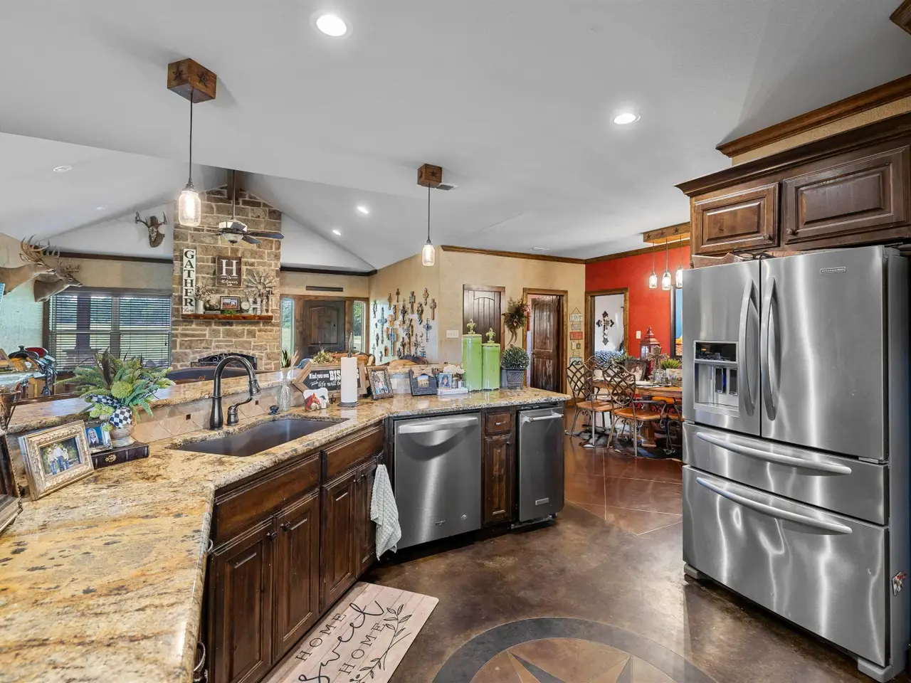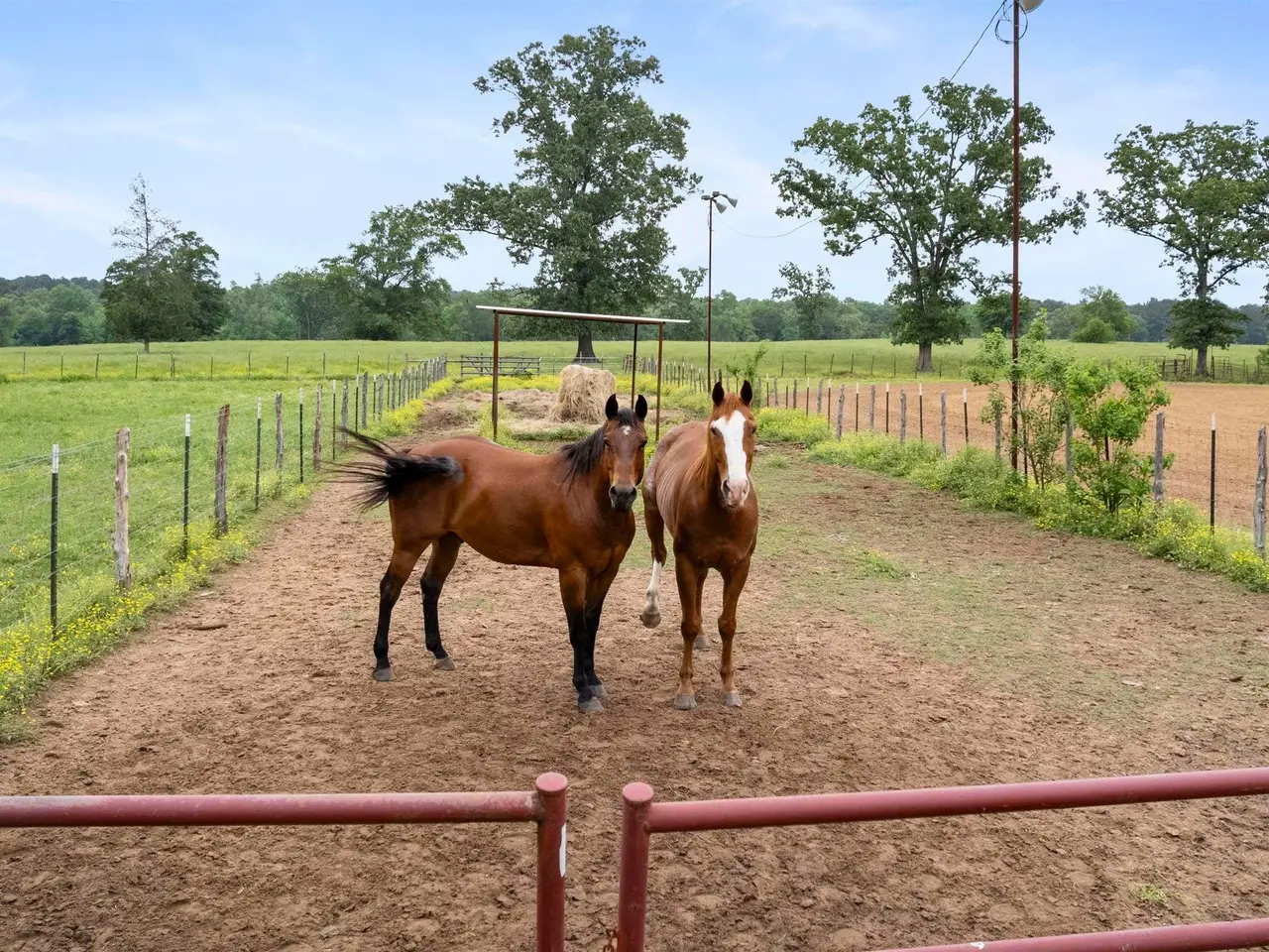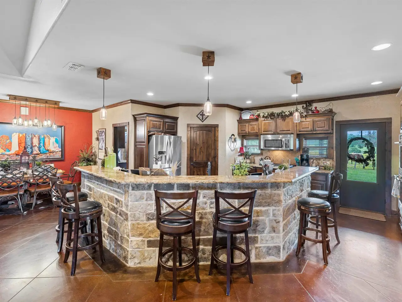 Nestled on an expansive 81.77 acres, this stunning custom ranch-style home features an inviting open concept layout with a split bedroom arrangement offering the perfect blend of elegance and rustic charm with 3 spacious bedrooms, 2 bathrooms, a dining room and an office. You'll find beautiful stone accents throughout including a cozy wood-burning and gas fireplace that serves as a focal point in the living area. Stained concrete floors flow seamlessly throughout providing a modern yet warm feel. The spacious kitchen is equipped with stainless steel appliances, including an icemaker, double ovens, and a convenient coffee bar. The mudroom and dedicated laundry area offer a convenient entry point from just behind the kitchen, providing an ideal space for transitioning from outdoors. The master suite includes 2 separate walk-in closets and a generous sized bathroom space with an oversized shower. The second and third bedrooms are joined with a jack-in-jill bath including separate vanities for better functionality. Outside, the vast acreage is a true paradise, featuring 3 stocked ponds that invite relaxation and recreation. The landscape features improved pasture with high quality grasses including 4 separate grazing pastures with cross fencing and small traps with cover. A small creek gracefully runs through the landscape, adding to its natural beauty and providing additional water for the livestock. A well-equipped barn and lighted roping arena cater to equestrian enthusiasts offering 3 stalls, working pens and a wide alley. The barn also has an RV hookup for your guests and a well nearby that provides water for your animals. This place is horse and cattle ready! Located just 6.5 miles from town, this ranch-style home combines tranquility with accessibility, making it a perfect retreat for those seeking a serene lifestyle. Don't miss out on this incredible opportunity to live the ranch life you've always dreamed of!