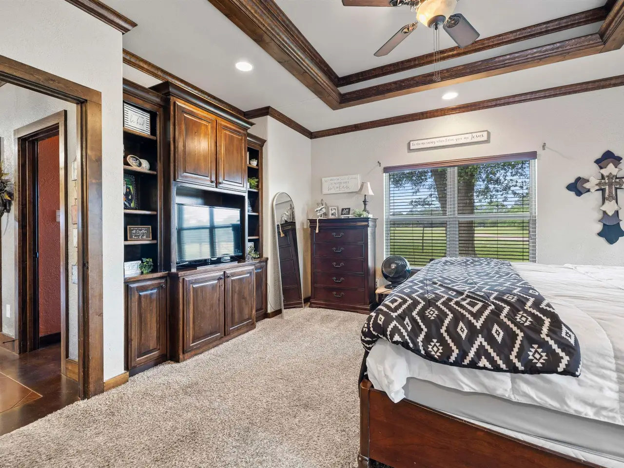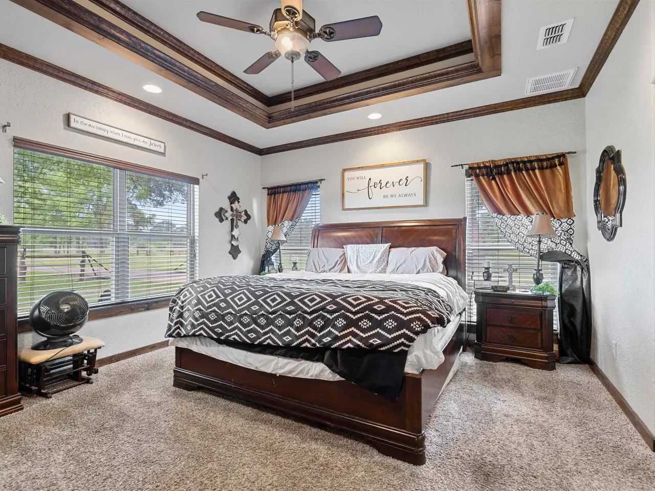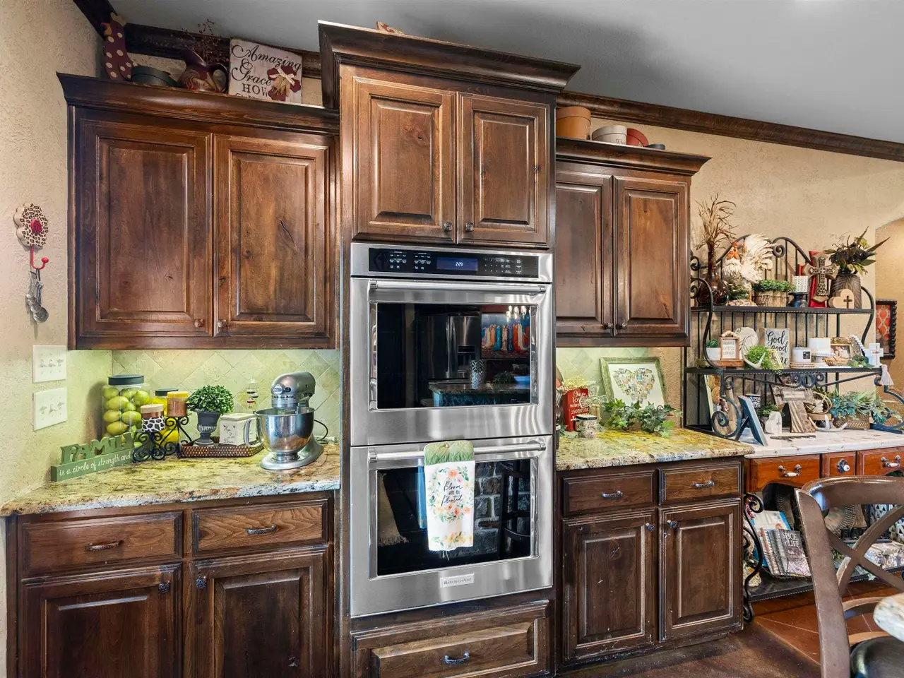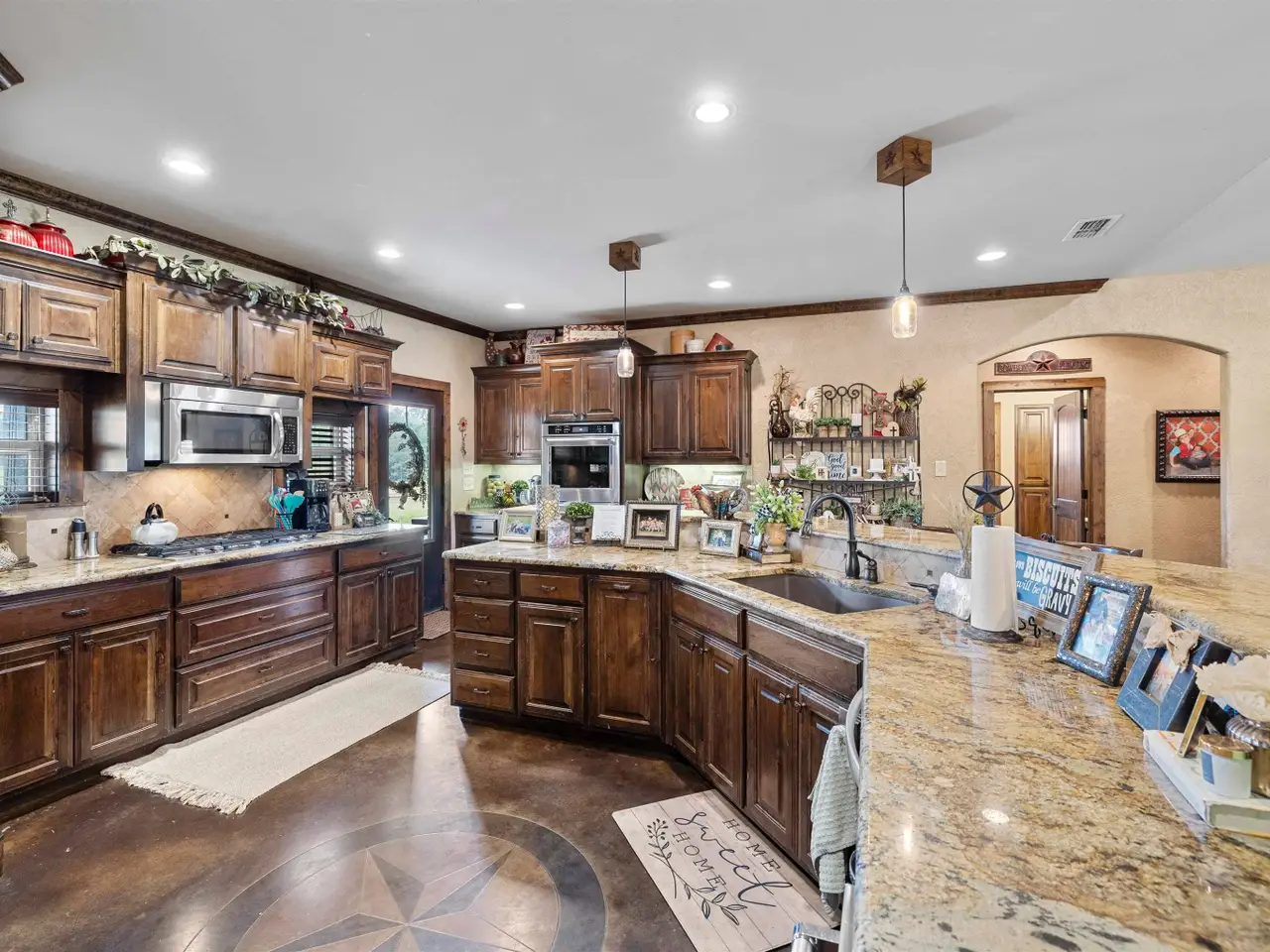 Nestled on an expansive 81.77 acres, this stunning custom ranch-style home features an inviting open concept layout with a split bedroom arrangement offering the perfect blend of elegance and rustic charm with 3 spacious bedrooms, 2 bathrooms, a dining room and an office. You'll find beautiful stone accents throughout including a cozy wood-burning and gas fireplace that serves as a focal point in the living area. Stained concrete floors flow seamlessly throughout providing a modern yet warm feel. The spacious kitchen is equipped with stainless steel appliances, including an icemaker, double ovens, and a convenient coffee bar. The mudroom and dedicated laundry area offer a convenient entry point from just behind the kitchen, providing an ideal space for transitioning from outdoors. The master suite includes 2 separate walk-in closets and a generous sized bathroom space with an oversized shower. The second and third bedrooms are joined with a jack-in-jill bath including separate vanities for better functionality. Outside, the vast acreage is a true paradise, featuring 3 stocked ponds that invite relaxation and recreation. The landscape features improved pasture with high quality grasses including 4 separate grazing pastures with cross fencing and small traps with cover. A small creek gracefully runs through the landscape, adding to its natural beauty and providing additional water for the livestock. A well-equipped barn and lighted roping arena cater to equestrian enthusiasts offering 3 stalls, working pens and a wide alley. The barn also has an RV hookup for your guests and a well nearby that provides water for your animals. This place is horse and cattle ready! Located just 6.5 miles from town, this ranch-style home combines tranquility with accessibility, making it a perfect retreat for those seeking a serene lifestyle. Don't miss out on this incredible opportunity to live the ranch life you've always dreamed of!