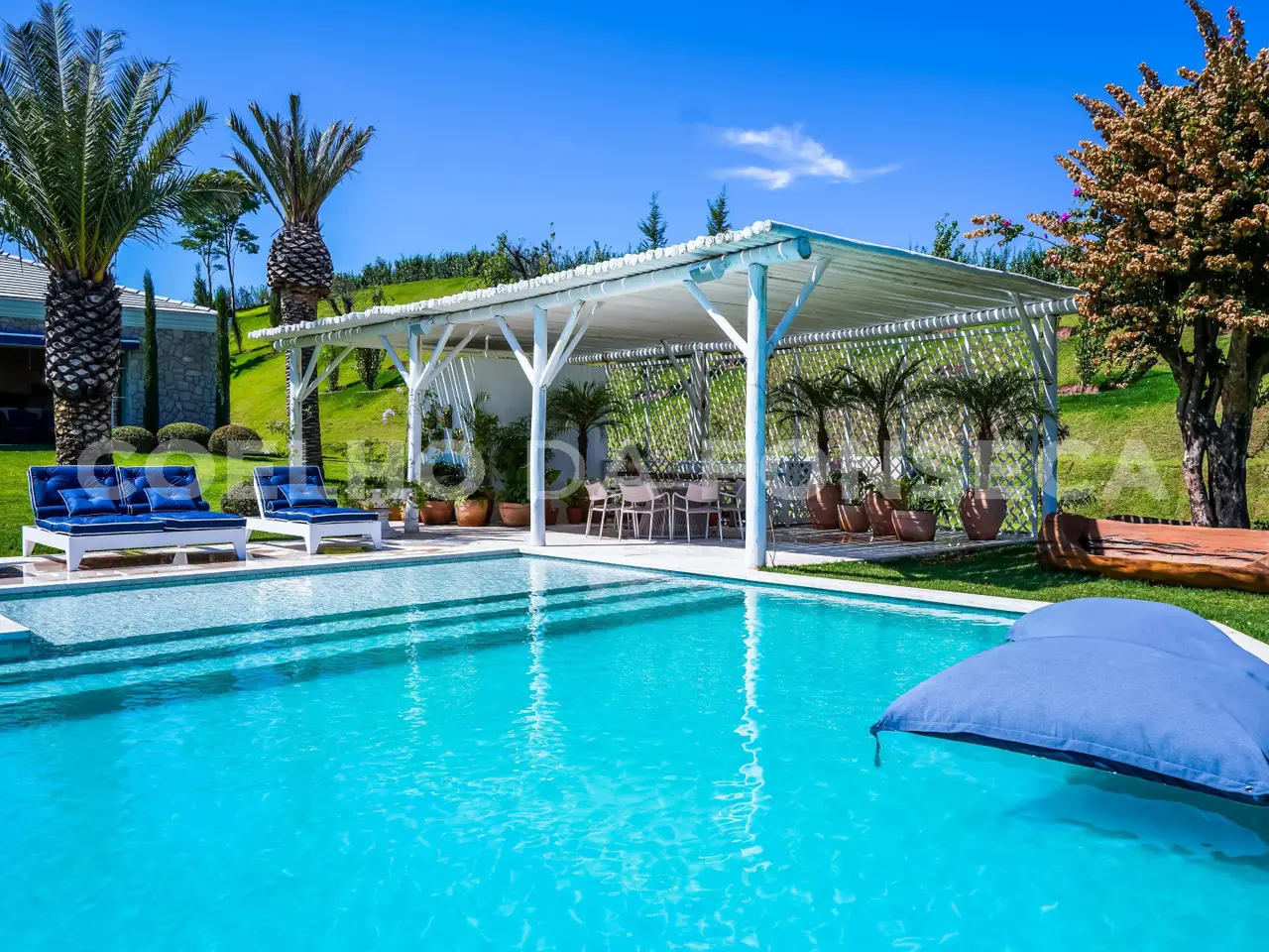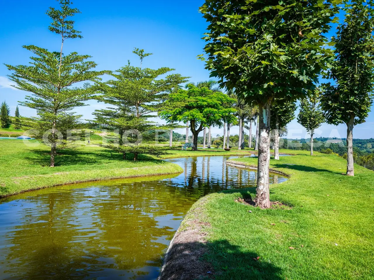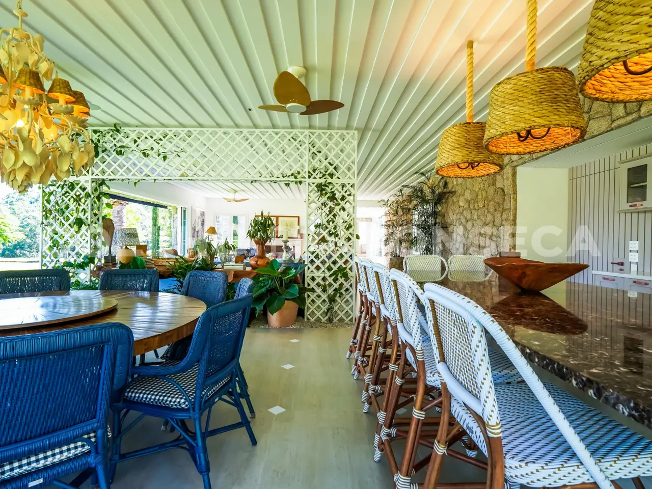 Where Nature Meets Sophistication. There are places that are not just homes, but settings for stories, unforgettable moments and a connection with what really matters. This house was born from this dream: a refuge amidst lush nature, where comfort, exclusivity and well-being come together. From the choice of the land - one of the most privileged in the condominium, elevated, with a long view and indescribable sunsets - to the smallest details of the landscaping and architecture, everything was thought out to provide a unique experience. More than 110 adult trees were carefully planted, creating a garden that blends in with the native forest, with a stream, waterfall and a lake that make the environment even more special. The grand 16x8 meter swimming pool, flanked by a raw travertine marble deck, becomes an invitation for moments of relaxation. Next to it, a pergola with space for snacks complements this perfect setting for entertaining friends and family. Inspired by classic European elegance with a contemporary touch of modern barn houses, it brings a timeless aesthetic. The soft off-white tones harmonize with the rustic stones, creating a welcoming and sophisticated atmosphere. Inside, the coziness comes to life with exclusive wicker and wood furniture, custom-designed with references to the Ralph Lauren Home style. The balcony connects the living room to the garden, providing a view worthy of a painting. The travertine marble fireplace, accompanied by sofas and armchairs for up to 16 people, creates a perfect space for moments of contemplation. Separated by a trellis with climbing plants, the gourmet dining room, pizza oven, barbecue and all the necessary equipment for unforgettable gastronomic experiences.