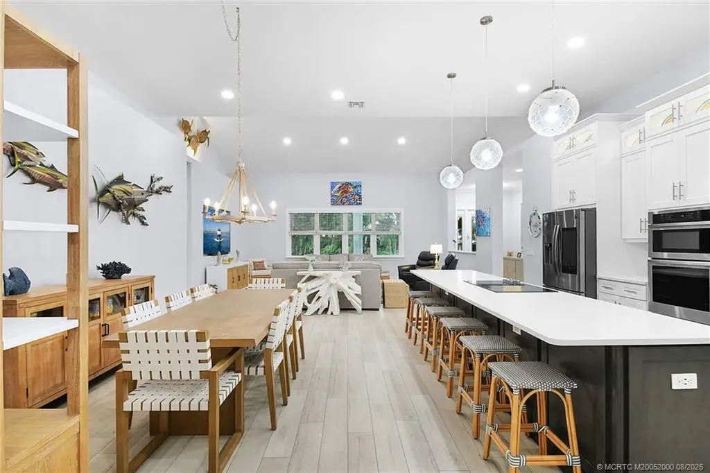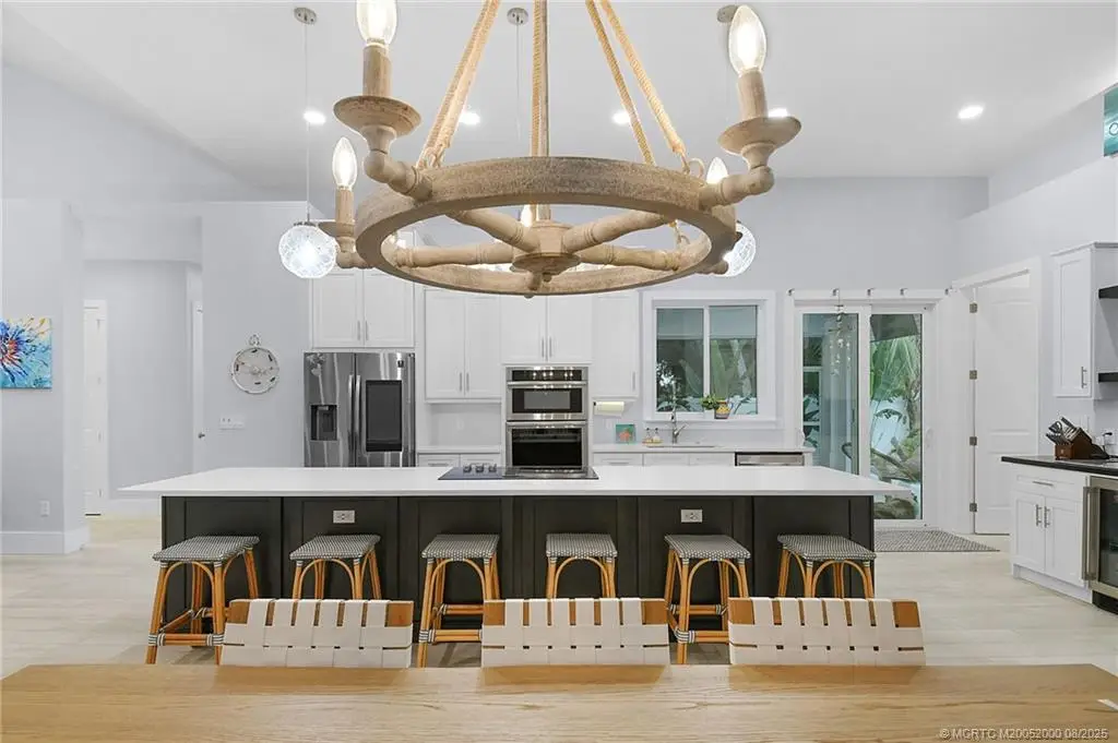 Step inside th?s ?e? We?t–?t?le, custom-built c?ncr?te block home, complete with a full-length front porch and timeless curb appeal. This 3-bedroom, 2.5-bath home sits on a half-acre lot and is built with quality in mind, featuring soaring 12-foot ceilings, 9-foot doors, and luxury plank flooring throughout, spray foam insulation and impact glass. The chef’s kitchen showcases white shaker cabinetry, an expansive island, coffee bar, and quartz countertops—perfect for both entertaining and everyday living. The primary suite is a true retreat with oversized walk-in closets, a sauna, and an impressive spa-style shower. Step outside to a screened-in porch with retractable screen overlooking a brand-new saltwater pool and spa. The outdoor living area includes a full summer kitchen with pizza oven, bar, outdoor shower, and lush professional landscaping—creating a serene, private oasis. With room to store your boat or RV, residents also enjoy access to a private day dock with fishing pier.