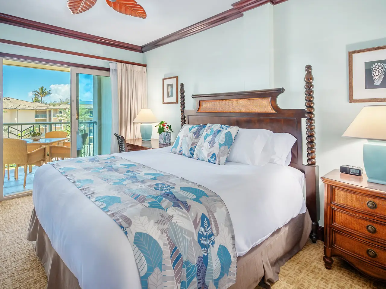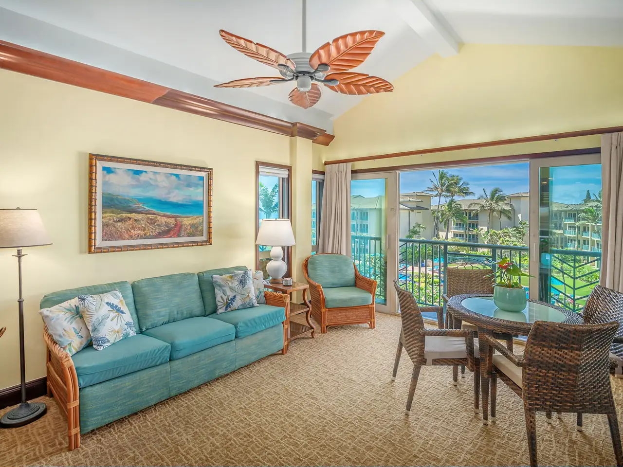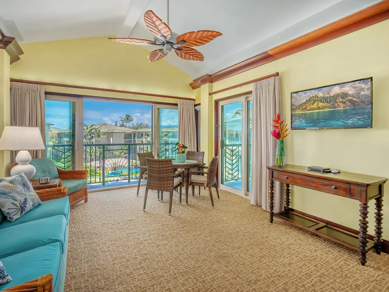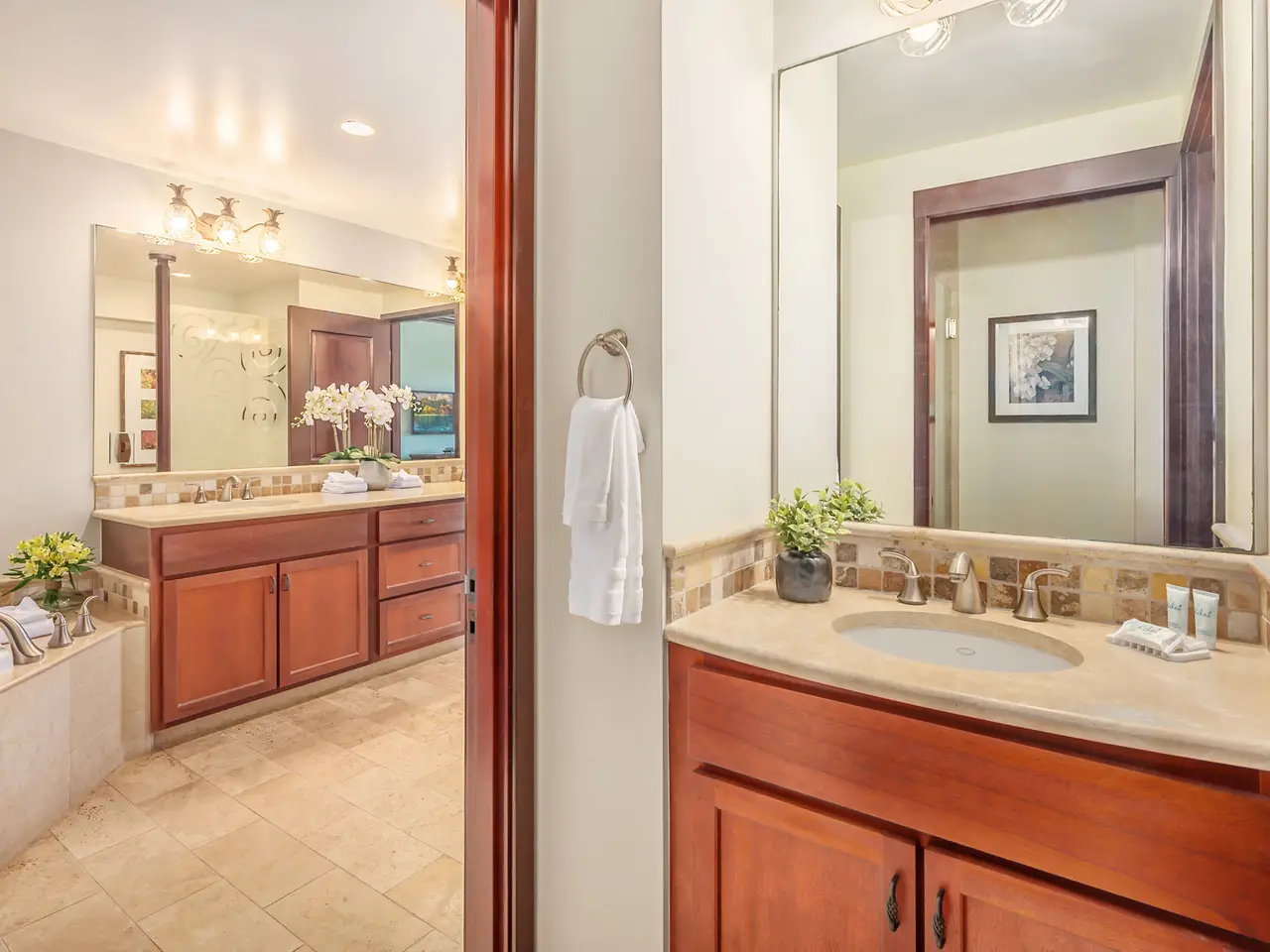 Beautiful two bedroom, three bathroom, pool and ocean view penthouse unit at the Waipouli Beach Resort. This top floor unit is one of twelve two bed/three bath penthouse units with an interior facing view of the lazy river pool to enjoy beautiful water views by day, as well as a romantic view of the lit pool and grounds by night. This 1,158 square foot unit features a chef’s kitchen with top-of-the-line appliances including a Sub-Zero refrigerator, Wolf glass cook top, oven, dishwasher, granite counter tops, African Mahogany cabinets, and Peruvian travertine stone floors. Enjoy the comfort of central air conditioning, a large living/dining area with a flat-panel screen television, recessed accent lighting, a pull-out queen sofa, a comfortable lanai space for your morning coffee and outdoor dining, a full-size stacked washer and dryer, and the convenience of being a short distance from the elevator. The primary suite offers a king bed, a mounted flat-panel screen television, and an ensuite featuring double sinks, a soaking tub with folding shutters for a pass through view of the pool, and a separate shower. The guest suite offers a queen bed, a mounted flat-panel screen television, and an ensuite with double sinks, and a soaking tub. The third guest bathroom features a shower. Waipouli Beach Resort is a luxury oceanfront resort on the Coconut Coast of Kauai, featuring a two-acre pool with lazy river, 2-water slides, waterfalls, and a sandy bottom hot tub. Enjoy the morning sunrise, walks on the beach, the beautifully landscaped grounds, an onsite concierge, a fitness center, and Oasis on the Beach for oceanfront dining. Area conveniences includes Starbucks and Safeway across the street, and within close proximity to many great shops, dining, and activities. Enjoy as your primary or secondary residence, or as an active Vacation Rental.