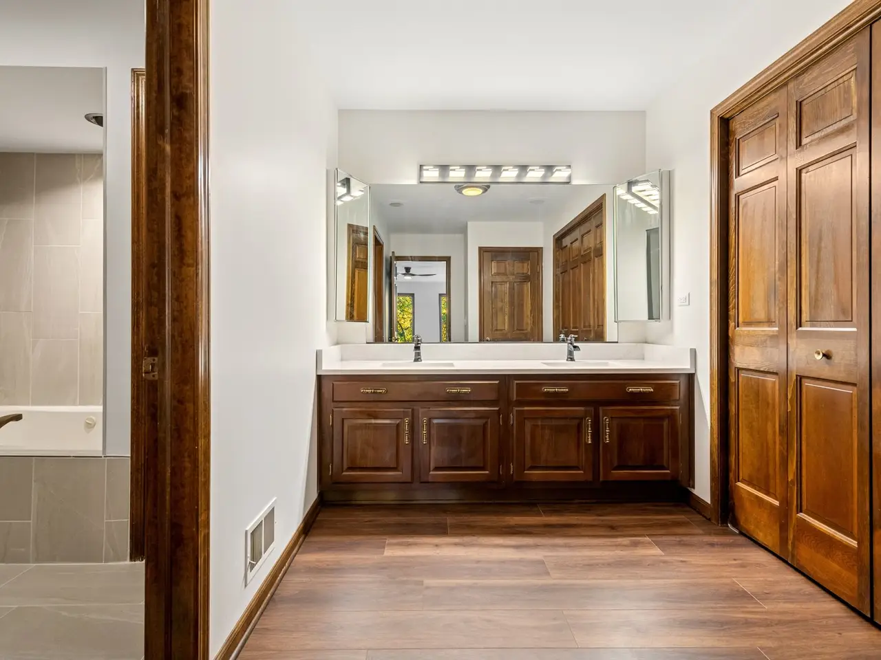 Staycation never got better! Spacious Tudor home with 6 bedrooms, 4.1 baths plus a bonus room over the garage including pinball machines pool table and jute box. All the bedrooms have ceiling fans. The 6th bedroom is on the main floor with it own bath and shower. Could be an office as well. Step into an incredible enclosed indoor addition with heated pool. 7.6 feet at the deep. Soaring cedar planked ceilings, hot tub and big screen TV. separate bath and shower. Plus a workout room with walkout to a covered patio. 3 car garage. New roof and gutter and recently painted. Exterior trim and cedar stained. Interior has new rich upgraded waterproof vinyl planked floor on the entire first floor for easy care. Beautiful walnut kitchen cabinets with new quartz counter and recessed lighting. New double convention oven and gas five burner cooktop. New dishwasher, and 2 year old refrigerator. The family room opens to the kitchen with gas start fireplace and full wet bar. The entire interior is recently painted. Baths upgraded with modern tiles. 3 zoned heating 2 years old. Pool room has it own furnace and heat pump for the pool and hot tub. Basement has a half bath, freshly painted with table tennis and game watching area. additional features include a gas generator and upgraded 200 amp electric service. Wonderful yard with cedar deck and patio over looking raised gardens. If you love an active lifestyle, makes plans to see this home! Great schools and Bishop Ridge neighborhood is welcoming!
