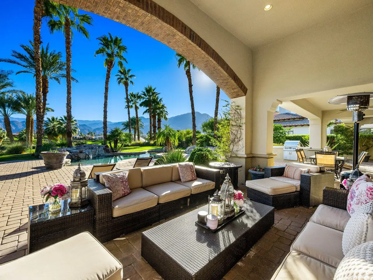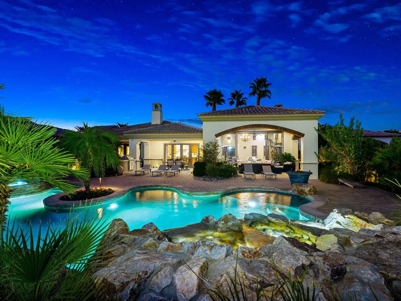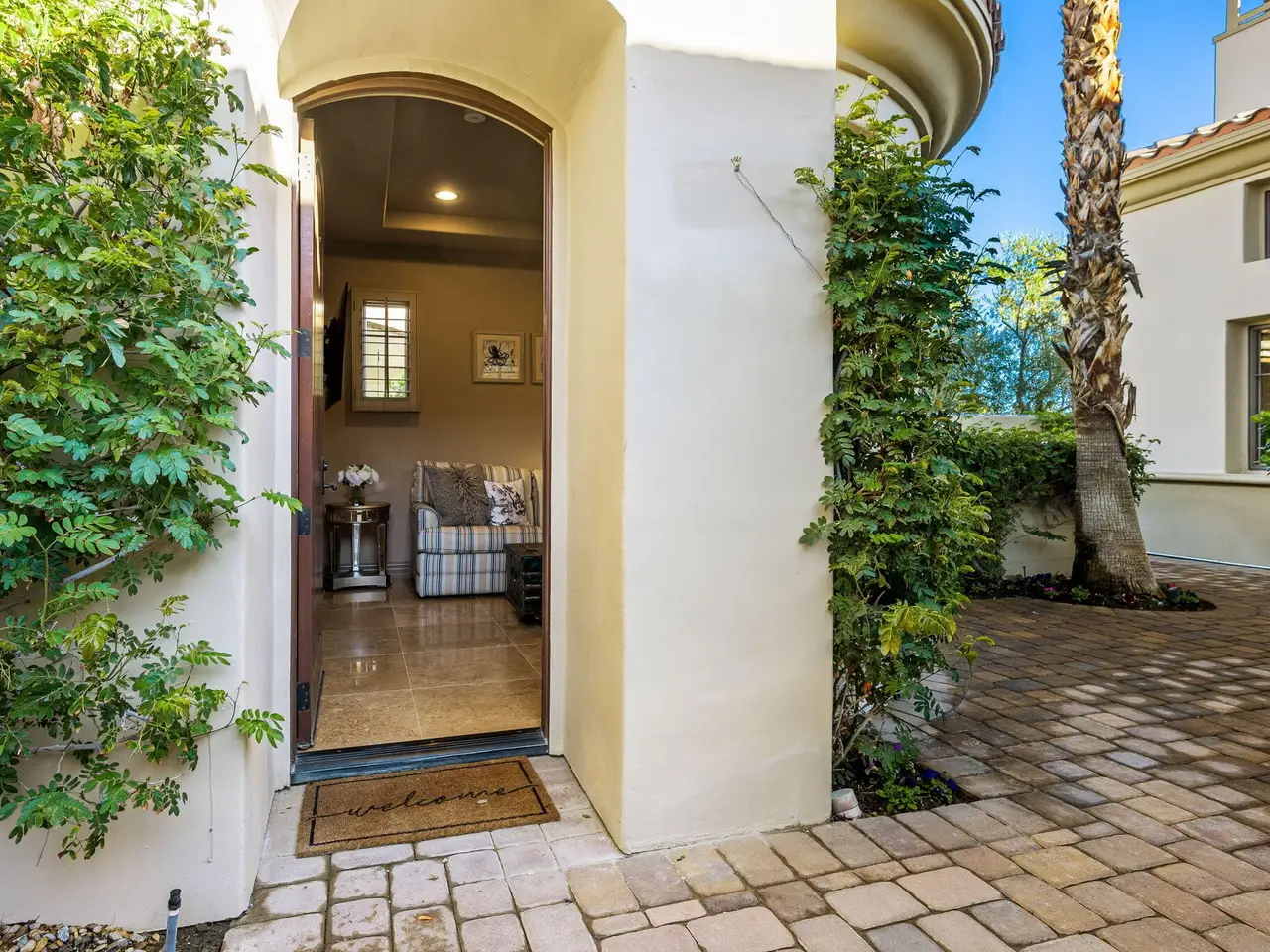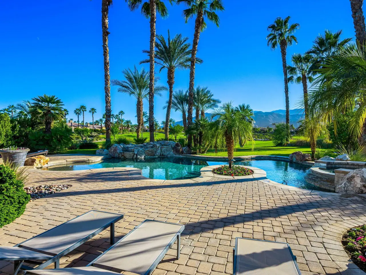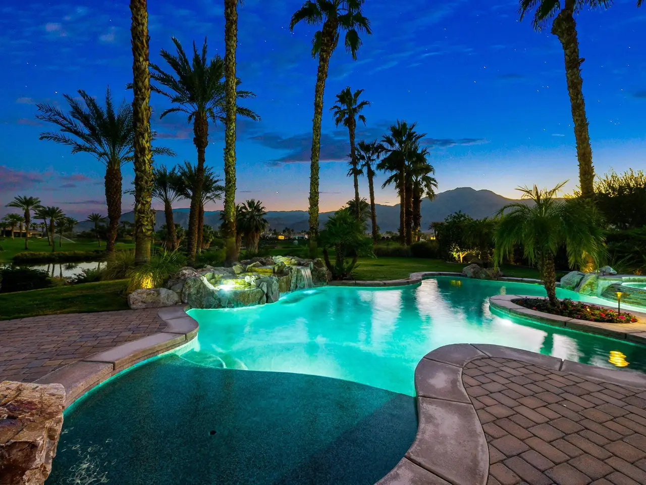 Live every day like a luxury vacation in the prestigious guard-gated community of Andalusia at Coral Mountain, where resort comforts, serene desert beauty, and first-class club amenities blend into an exceptional way of life. Nestled against the dramatic Santa Rosa & Coral Mountains, this private residence offers a peaceful sanctuary with unforgettable natural surroundings and seamless indoor-outdoor living designed to inspire relaxation and connection.Wake to quiet mornings framed by panoramic mountain views, and take in the soft glow of sunrise over the fairway. Enjoy coffee on your patio as the sun warms the peaks, then step out your door and embrace a lifestyle tailored to wellness, leisure, and social connection. With full social membership included in the HOA, residents enjoy access to the clubhouse, dining venues, state-of-the-art fitness & wellness facilities, racquet sports, resort pool, spa services, dog park, and miles of scenic walking and biking trails. A stunning 18-hole Rees Jones championship golf course winds through the community, with optional golf memberships available.Inside the home, tall ceilings, abundant natural light, and large view windows create a refined yet relaxed atmosphere ideal for everyday comfort and entertaining. The kitchen serves as the heart of the home, flowing into generous great-room and dining spaces perfect for gathering with friends after a day on the courts, links, or trails. The private primary retreat offers a peaceful haven for unwinding, complete with spa-inspired bath and dual walk-in closets. Two additional ensuite guest rooms in the main house ensure comfort for visitors, while the two-room casita with living room and bedroom offers the perfect space for extended stays or private work/wellness use.Step outside to your own personal resort environment. A sparkling pool and spa with cascading waterfalls create a tranquil backdrop for sun-soaked afternoons, while the built-in BBQ and covered patio areas set the stage for evening dining under glowing mountain silhouettes. Lush landscaping, open skies, and breathtaking views create a sense of calm and escape that defines life at Andalusia.Whether lounging poolside, enjoying a fitness class, connecting with neighbors at community events, or ending the day with golden mountain sunsets, this is desert luxury living at its finest a home where every moment feels like a retreat.