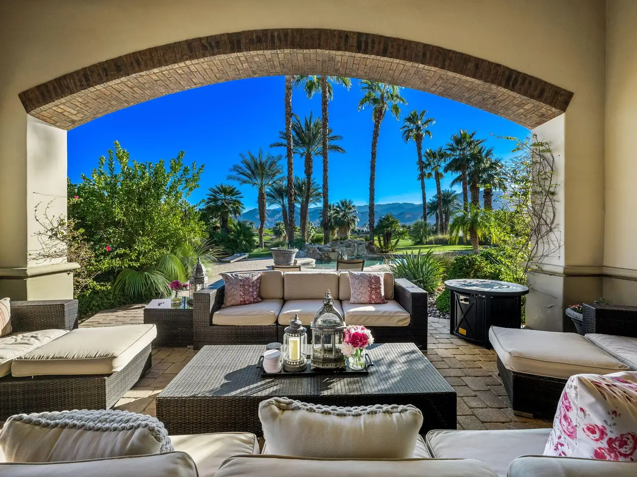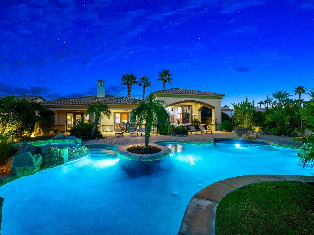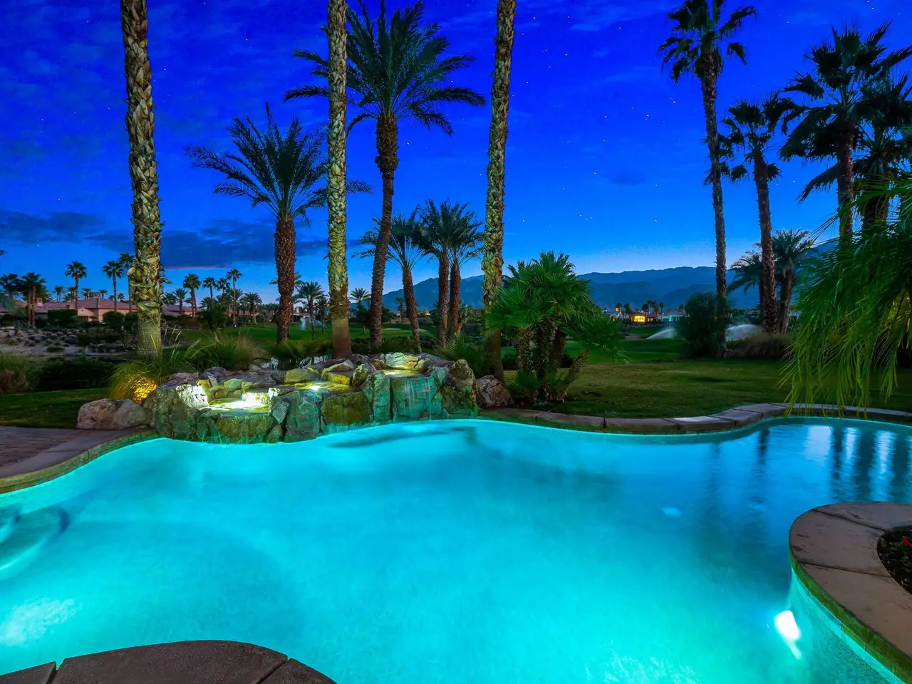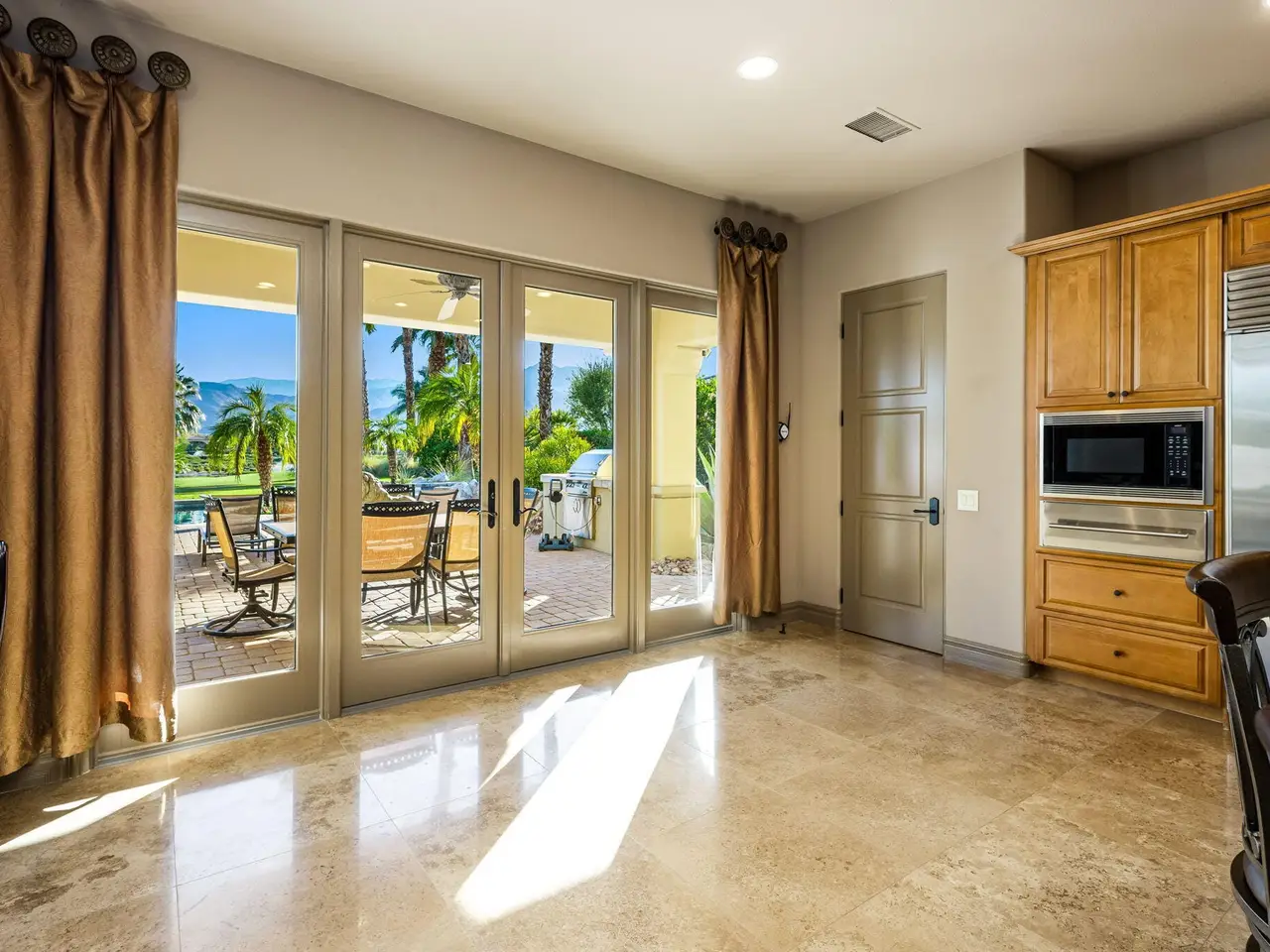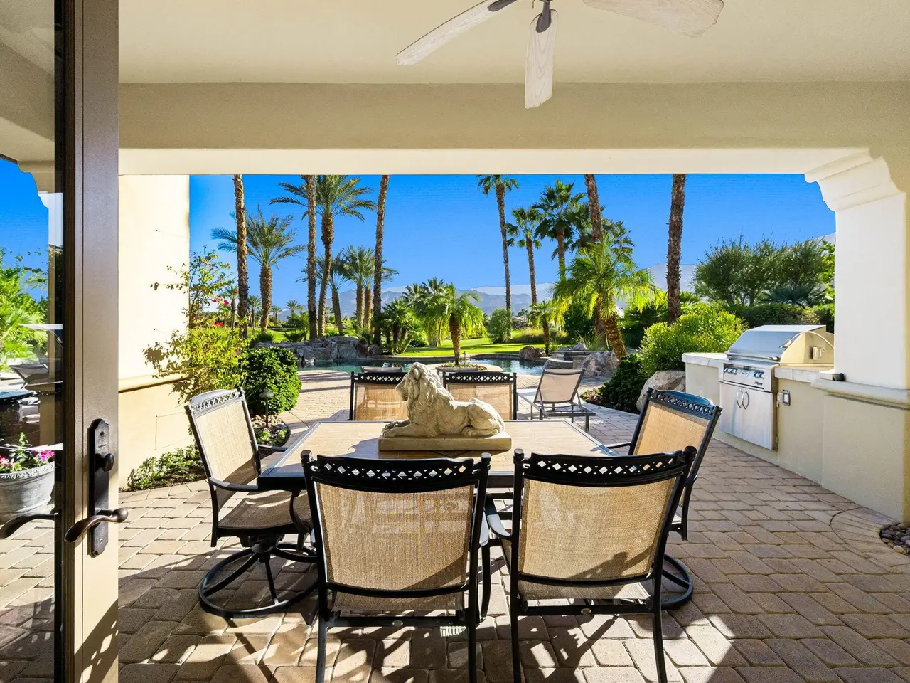 Live every day like a luxury vacation in the prestigious guard-gated community of Andalusia at Coral Mountain, where resort comforts, serene desert beauty, and first-class club amenities blend into an exceptional way of life. Nestled against the dramatic Santa Rosa & Coral Mountains, this private residence offers a peaceful sanctuary with unforgettable natural surroundings and seamless indoor-outdoor living designed to inspire relaxation and connection.Wake to quiet mornings framed by panoramic mountain views, and take in the soft glow of sunrise over the fairway. Enjoy coffee on your patio as the sun warms the peaks, then step out your door and embrace a lifestyle tailored to wellness, leisure, and social connection. With full social membership included in the HOA, residents enjoy access to the clubhouse, dining venues, state-of-the-art fitness & wellness facilities, racquet sports, resort pool, spa services, dog park, and miles of scenic walking and biking trails. A stunning 18-hole Rees Jones championship golf course winds through the community, with optional golf memberships available.Inside the home, tall ceilings, abundant natural light, and large view windows create a refined yet relaxed atmosphere ideal for everyday comfort and entertaining. The kitchen serves as the heart of the home, flowing into generous great-room and dining spaces perfect for gathering with friends after a day on the courts, links, or trails. The private primary retreat offers a peaceful haven for unwinding, complete with spa-inspired bath and dual walk-in closets. Two additional ensuite guest rooms in the main house ensure comfort for visitors, while the two-room casita with living room and bedroom offers the perfect space for extended stays or private work/wellness use.Step outside to your own personal resort environment. A sparkling pool and spa with cascading waterfalls create a tranquil backdrop for sun-soaked afternoons, while the built-in BBQ and covered patio areas set the stage for evening dining under glowing mountain silhouettes. Lush landscaping, open skies, and breathtaking views create a sense of calm and escape that defines life at Andalusia.Whether lounging poolside, enjoying a fitness class, connecting with neighbors at community events, or ending the day with golden mountain sunsets, this is desert luxury living at its finest a home where every moment feels like a retreat.