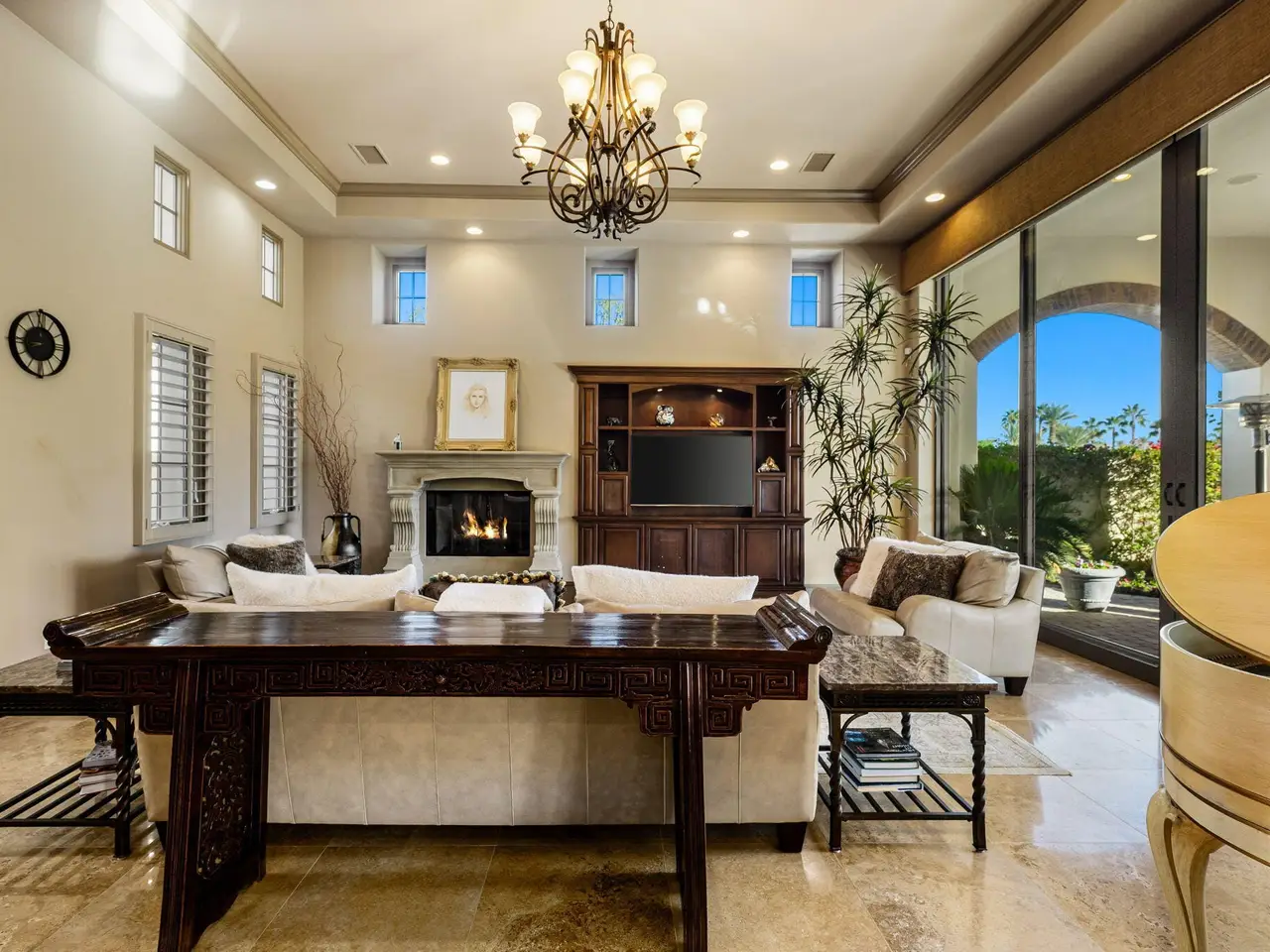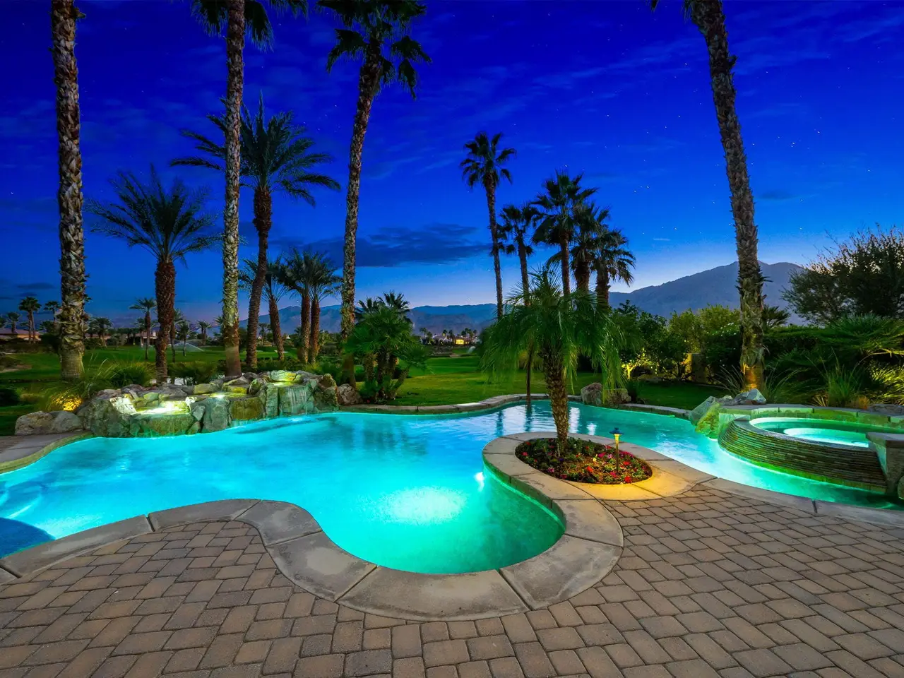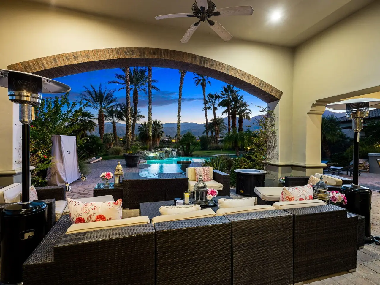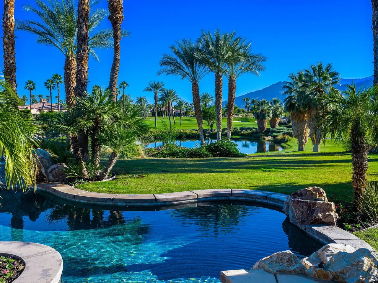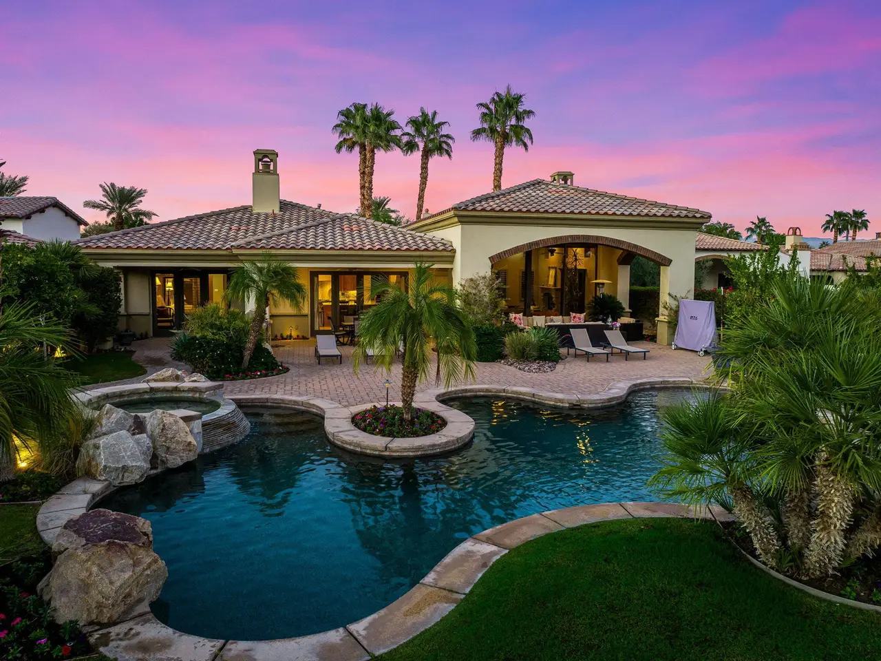 Live every day like a luxury vacation in the prestigious guard-gated community of Andalusia at Coral Mountain, where resort comforts, serene desert beauty, and first-class club amenities blend into an exceptional way of life. Nestled against the dramatic Santa Rosa & Coral Mountains, this private residence offers a peaceful sanctuary with unforgettable natural surroundings and seamless indoor-outdoor living designed to inspire relaxation and connection.Wake to quiet mornings framed by panoramic mountain views, and take in the soft glow of sunrise over the fairway. Enjoy coffee on your patio as the sun warms the peaks, then step out your door and embrace a lifestyle tailored to wellness, leisure, and social connection. With full social membership included in the HOA, residents enjoy access to the clubhouse, dining venues, state-of-the-art fitness & wellness facilities, racquet sports, resort pool, spa services, dog park, and miles of scenic walking and biking trails. A stunning 18-hole Rees Jones championship golf course winds through the community, with optional golf memberships available.Inside the home, tall ceilings, abundant natural light, and large view windows create a refined yet relaxed atmosphere ideal for everyday comfort and entertaining. The kitchen serves as the heart of the home, flowing into generous great-room and dining spaces perfect for gathering with friends after a day on the courts, links, or trails. The private primary retreat offers a peaceful haven for unwinding, complete with spa-inspired bath and dual walk-in closets. Two additional ensuite guest rooms in the main house ensure comfort for visitors, while the two-room casita with living room and bedroom offers the perfect space for extended stays or private work/wellness use.Step outside to your own personal resort environment. A sparkling pool and spa with cascading waterfalls create a tranquil backdrop for sun-soaked afternoons, while the built-in BBQ and covered patio areas set the stage for evening dining under glowing mountain silhouettes. Lush landscaping, open skies, and breathtaking views create a sense of calm and escape that defines life at Andalusia.Whether lounging poolside, enjoying a fitness class, connecting with neighbors at community events, or ending the day with golden mountain sunsets, this is desert luxury living at its finest a home where every moment feels like a retreat.