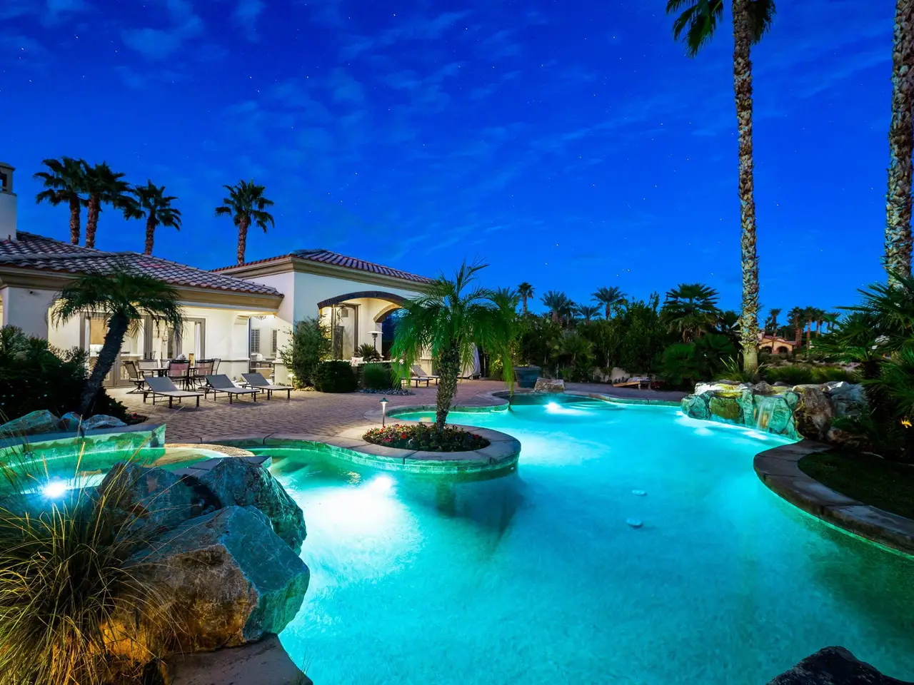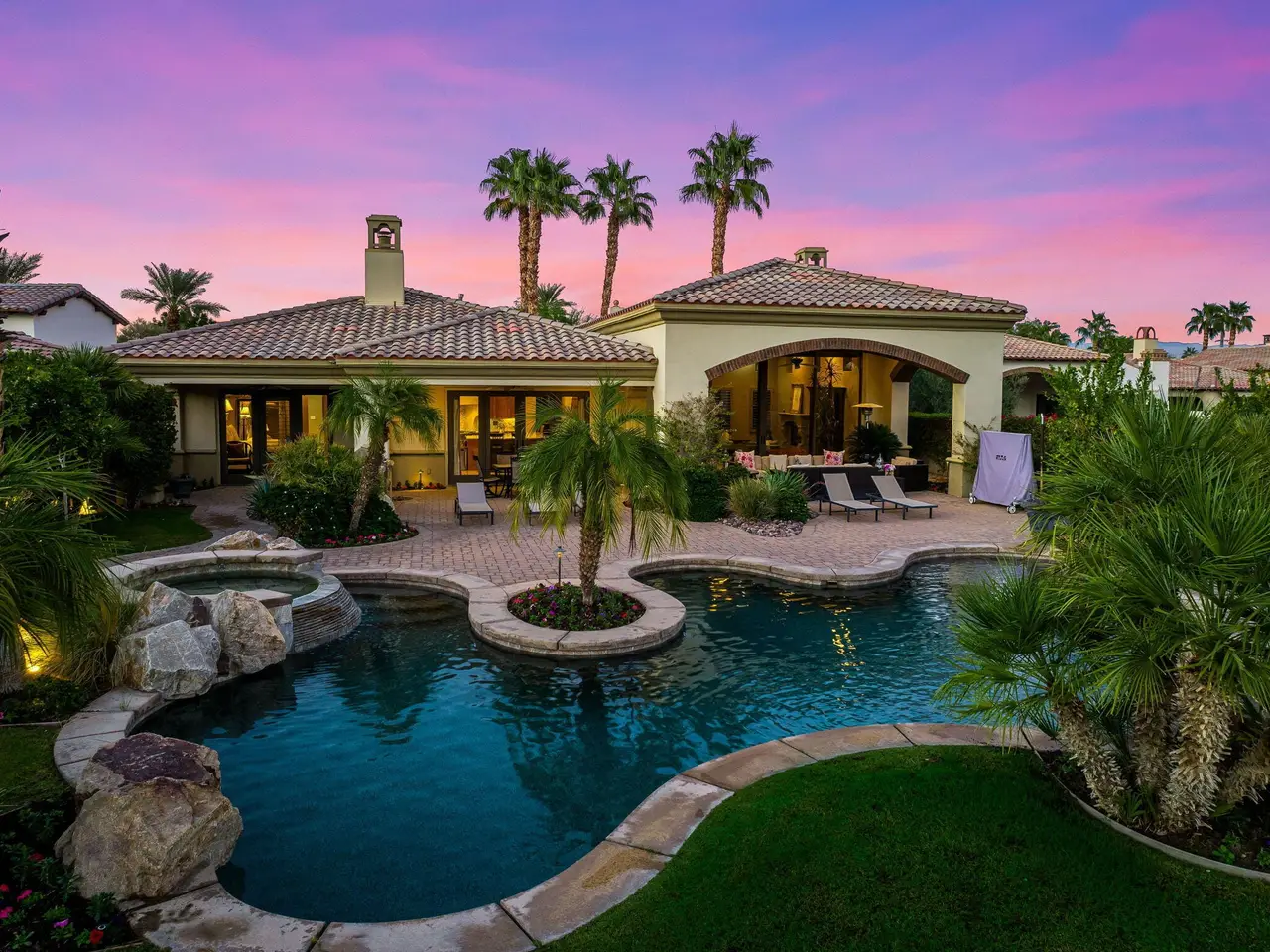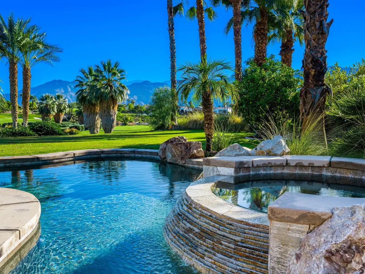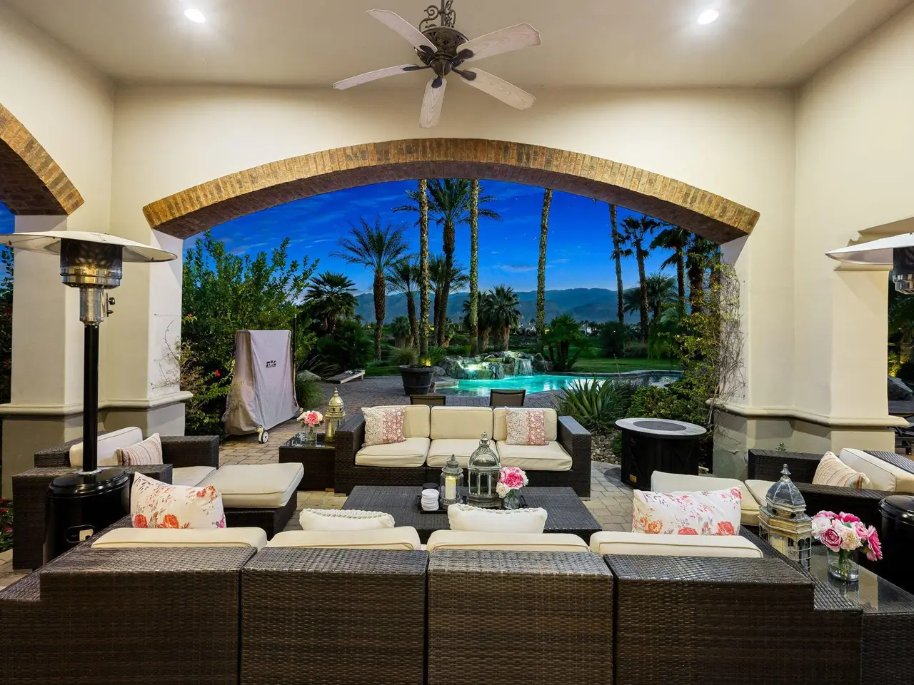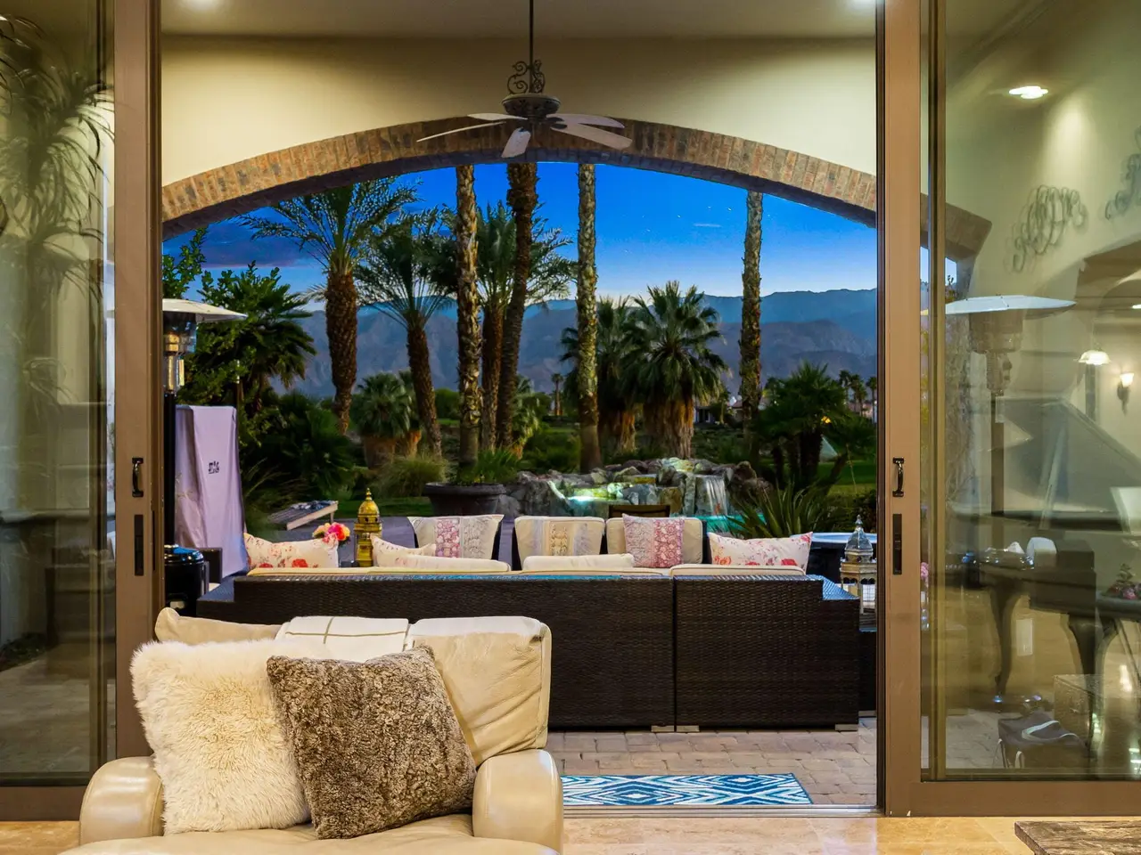 Live every day like a luxury vacation in the prestigious guard-gated community of Andalusia at Coral Mountain, where resort comforts, serene desert beauty, and first-class club amenities blend into an exceptional way of life. Nestled against the dramatic Santa Rosa & Coral Mountains, this private residence offers a peaceful sanctuary with unforgettable natural surroundings and seamless indoor-outdoor living designed to inspire relaxation and connection.Wake to quiet mornings framed by panoramic mountain views, and take in the soft glow of sunrise over the fairway. Enjoy coffee on your patio as the sun warms the peaks, then step out your door and embrace a lifestyle tailored to wellness, leisure, and social connection. With full social membership included in the HOA, residents enjoy access to the clubhouse, dining venues, state-of-the-art fitness & wellness facilities, racquet sports, resort pool, spa services, dog park, and miles of scenic walking and biking trails. A stunning 18-hole Rees Jones championship golf course winds through the community, with optional golf memberships available.Inside the home, tall ceilings, abundant natural light, and large view windows create a refined yet relaxed atmosphere ideal for everyday comfort and entertaining. The kitchen serves as the heart of the home, flowing into generous great-room and dining spaces perfect for gathering with friends after a day on the courts, links, or trails. The private primary retreat offers a peaceful haven for unwinding, complete with spa-inspired bath and dual walk-in closets. Two additional ensuite guest rooms in the main house ensure comfort for visitors, while the two-room casita with living room and bedroom offers the perfect space for extended stays or private work/wellness use.Step outside to your own personal resort environment. A sparkling pool and spa with cascading waterfalls create a tranquil backdrop for sun-soaked afternoons, while the built-in BBQ and covered patio areas set the stage for evening dining under glowing mountain silhouettes. Lush landscaping, open skies, and breathtaking views create a sense of calm and escape that defines life at Andalusia.Whether lounging poolside, enjoying a fitness class, connecting with neighbors at community events, or ending the day with golden mountain sunsets, this is desert luxury living at its finest a home where every moment feels like a retreat.