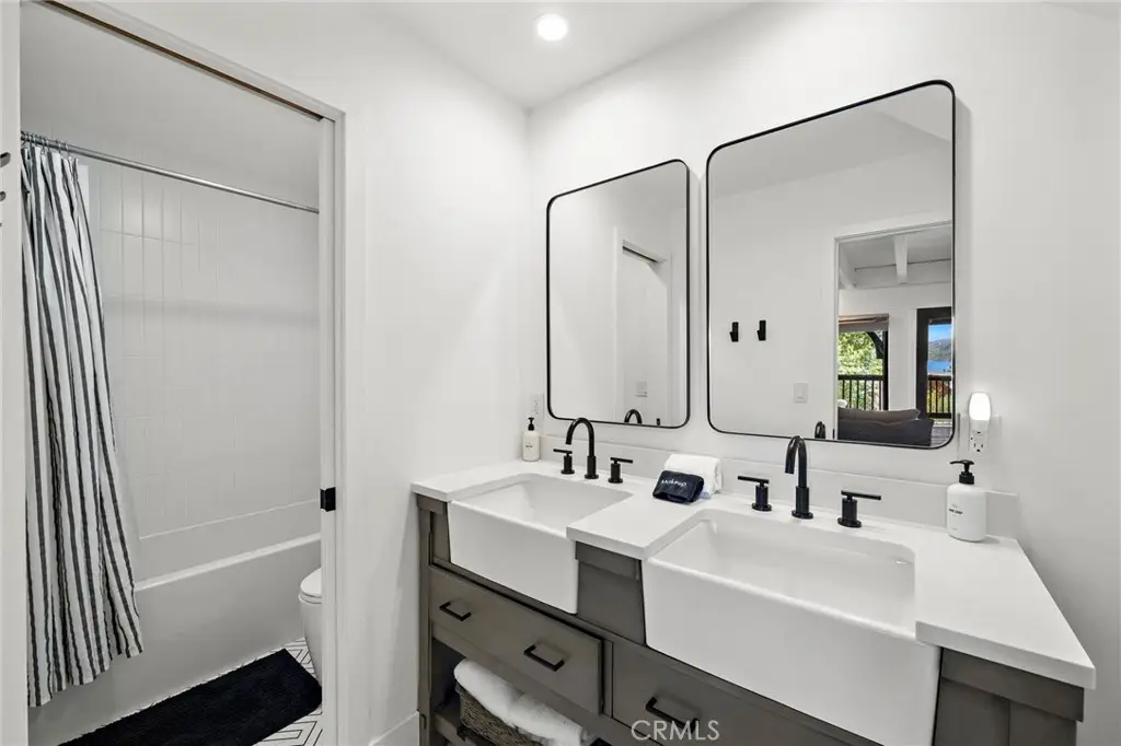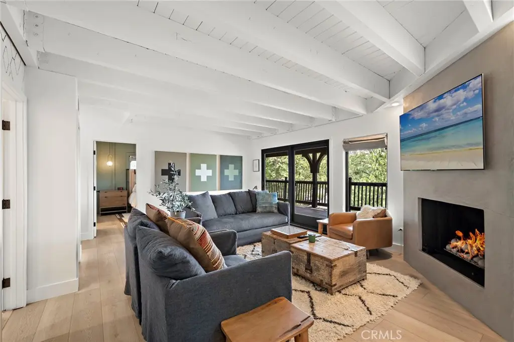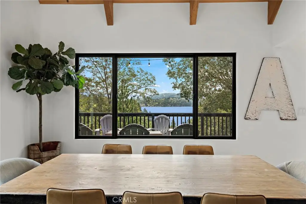 This stunning 4-bedroom, 3.5-bath mountain retreat combines modern upgrades with timeless lodge-style charm, offering captivating lake views from nearly every window. Thoughtfully remodeled in 2020-2021, the home features a bright open floor plan perfect for both comfort and entertaining. The main level showcases a dramatic great room with vaulted ceilings, expansive windows, recessed lighting, and a cozy gas fireplace that opens to a large entertainer's deck. The remodeled kitchen is a chef's dream with stainless steel appliances including a refrigerator, shaker-style cabinetry, pantry with pullout shelves, granite counters, peninsula with seating, and large windows framing the view. Two primary suites with spa-inspired baths--one on the main level and another on the lower level--provide privacy and flexibility, while two additional bedrooms and a spacious family room with a second fireplace and walk-out access to the lower deck with a swinging bench create the perfect retreat for family and guests. Outdoor living shines with two expansive decks crafted in durable Trek decking, ideal for gatherings, dining, or simply enjoying the mountain air and lake views. Additional highlights include dual HVAC and A/C systems with split thermostats, vinyl flooring throughout, inside laundry with washer and dryer, a finished pull-through two-car garage with automatic doors on both sides, and ample guest parking. Sold mostly furnished for a true move-in ready experience, this home is ideally located just above the trails of North Bay Cove with lake rights, peaceful morning walks, sunset strolls, and easy access off Bay Road with level parking. Just minutes from Blue Jay and Lake Arrowhead Village shops and dining, this exceptional property offers the perfect blend of modern amenities, mountain appeal, and lake lifestyle--whether as a primary residence, weekend escape.