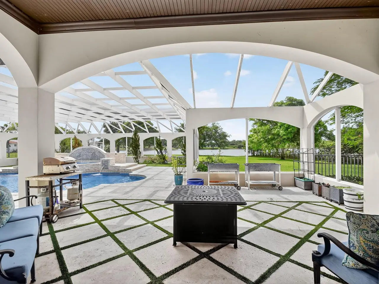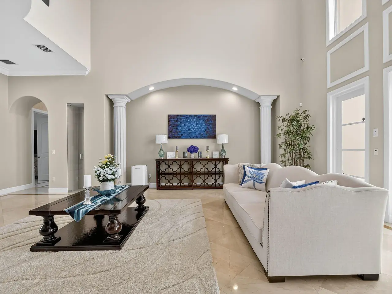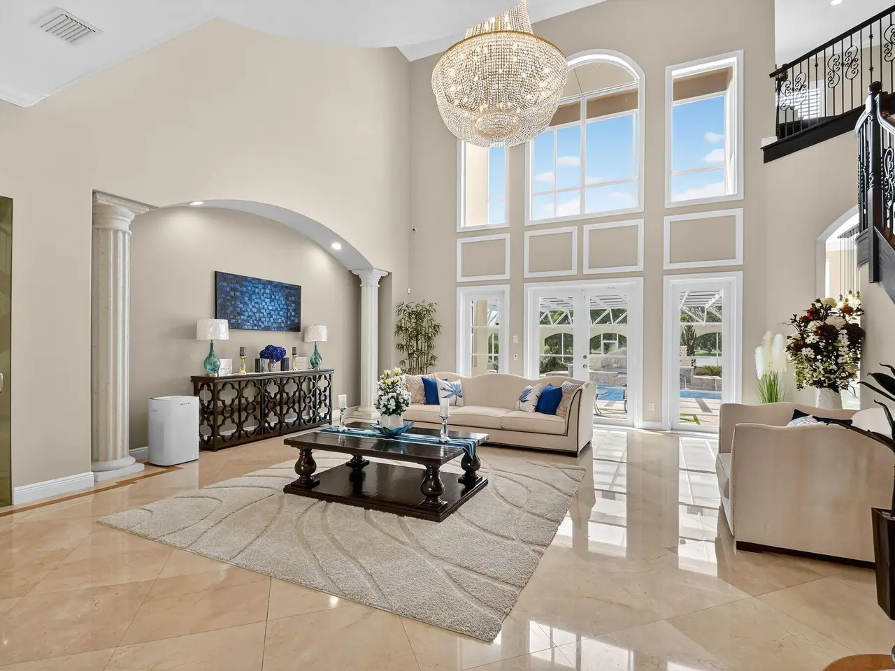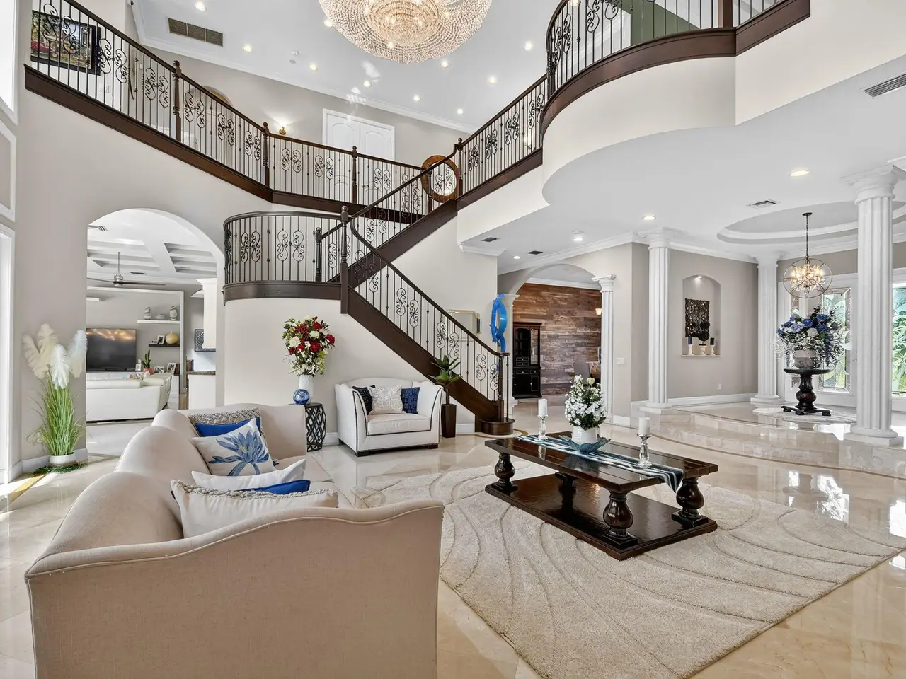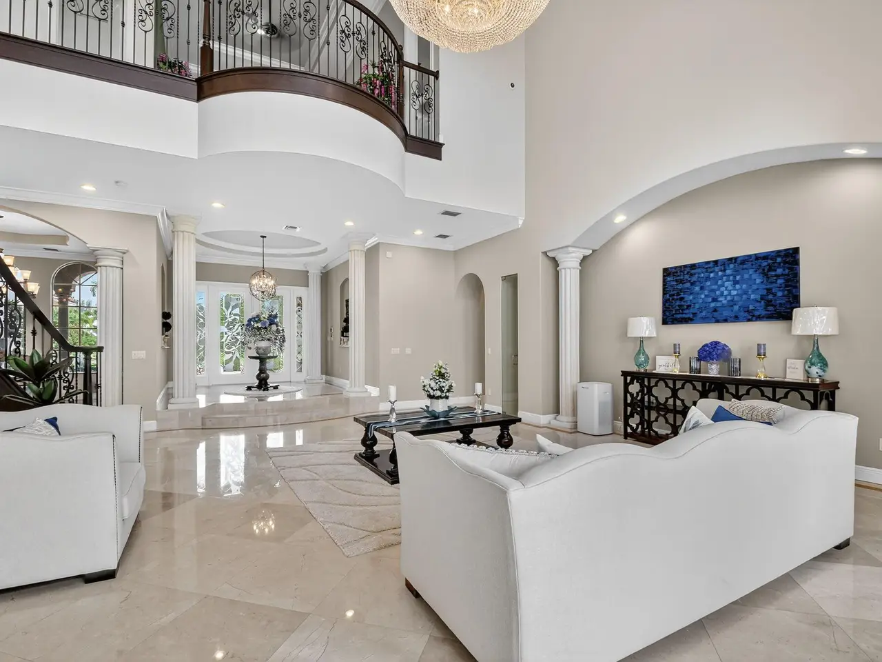 Casual elegance & exquisite craftsmanship define this magnificent custom-built home featuring 6 bedrooms, 7.5 bathrooms & 4 car garage. Situated on over 2 acres, the estate welcomes you with a wide circular driveway & fountain centerpiece. In the grand foyer, gleaming marble floors, a dazzling crystal chandelier & soaring ceilings create an unforgettable first impression. A breathtaking winding staircase sets the tone for the sophisticated design found throughout. The chef's island kitchen is a culinary dream, with 2 wall ovens, a Sub-Zero refrigerator & gas stove- perfect for entertaining or everyday luxury. Nearly every main room showcases a unique ceiling design, adding character & charm at every turn! Outside is your resort-style oasis. The pool/spa area is framed by elegant walled arches, creating a serene Mediterranean retreat. Multiple balconies & patios offer the perfect setting for al fresco dining, relaxation or entertaining. Wander down to the peaceful lakeside patio and soak in the views. Equestrians, your horses are welcome! Despite the serene seclusion, this exceptional home is conveniently located near restaurants, shops, cultural venues, & the Palm Beach International Airport. This one-of-a-kind estate is where timeless design meets modern luxury. Come experience it for yourself!