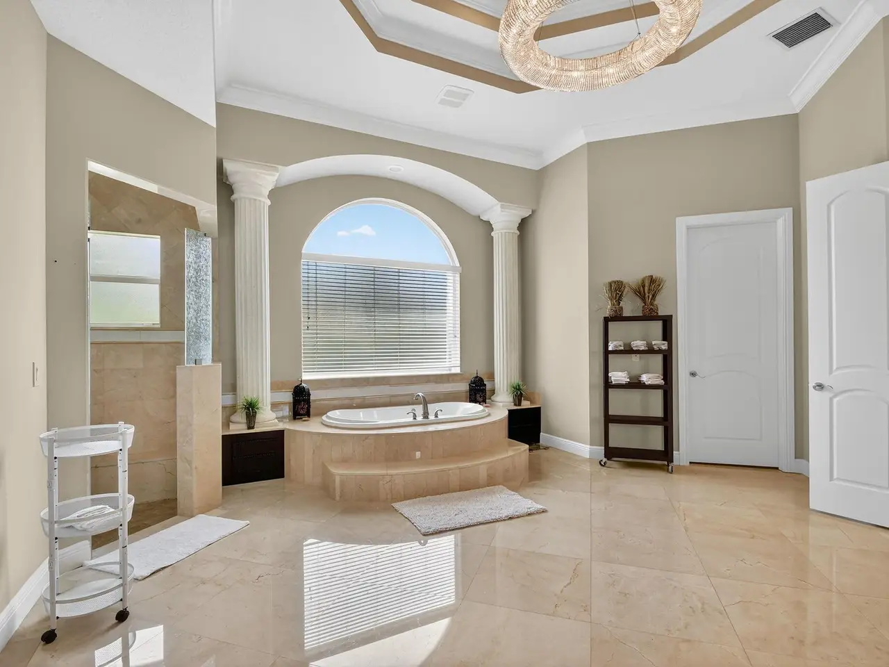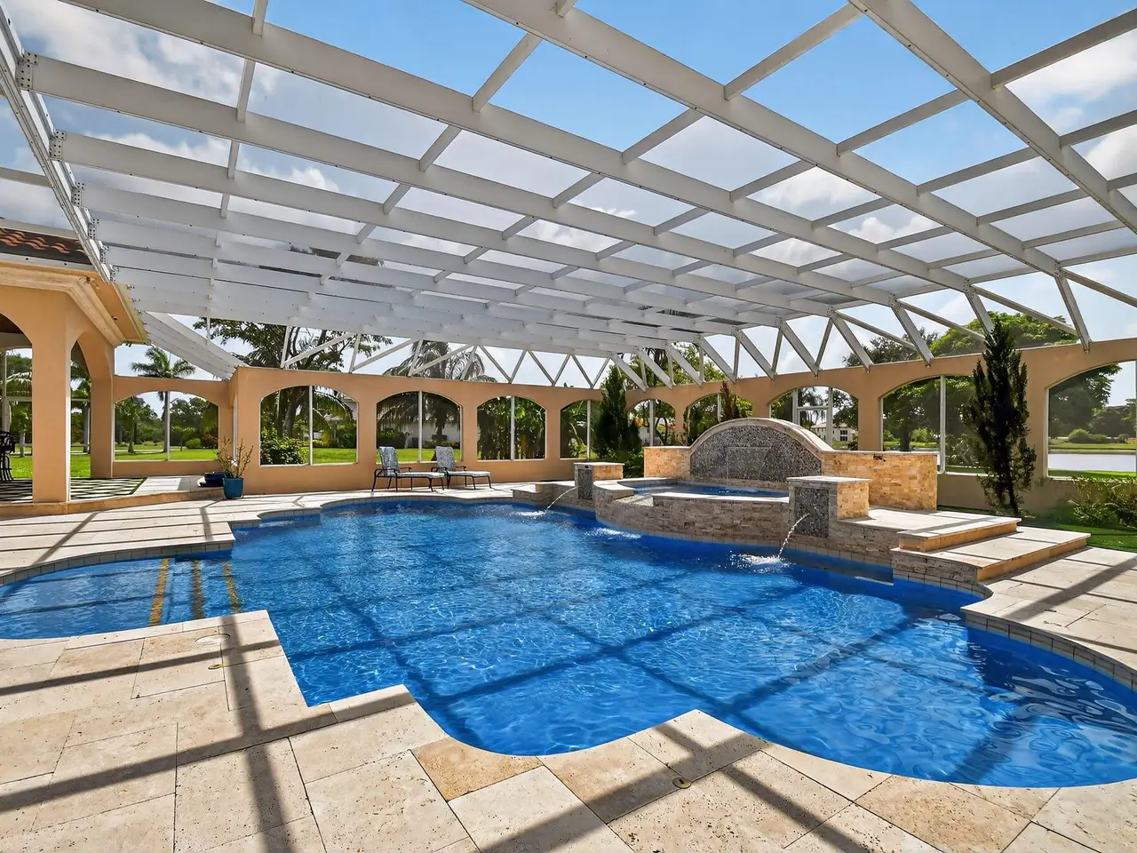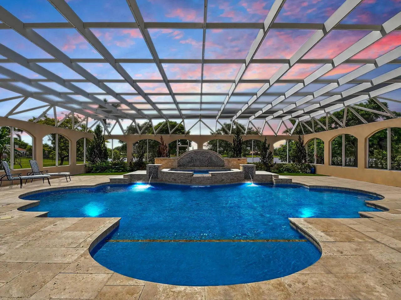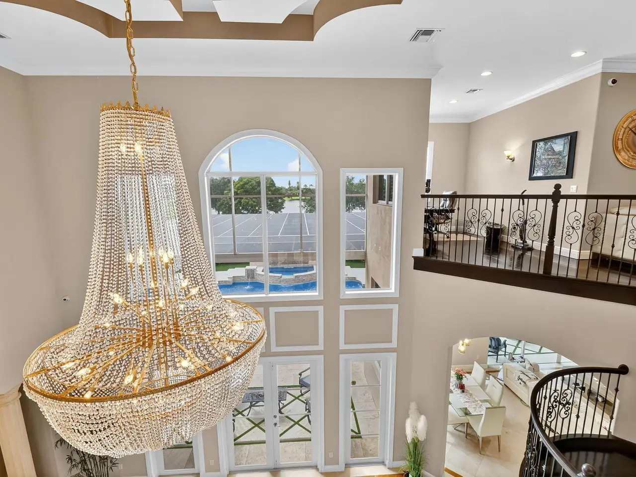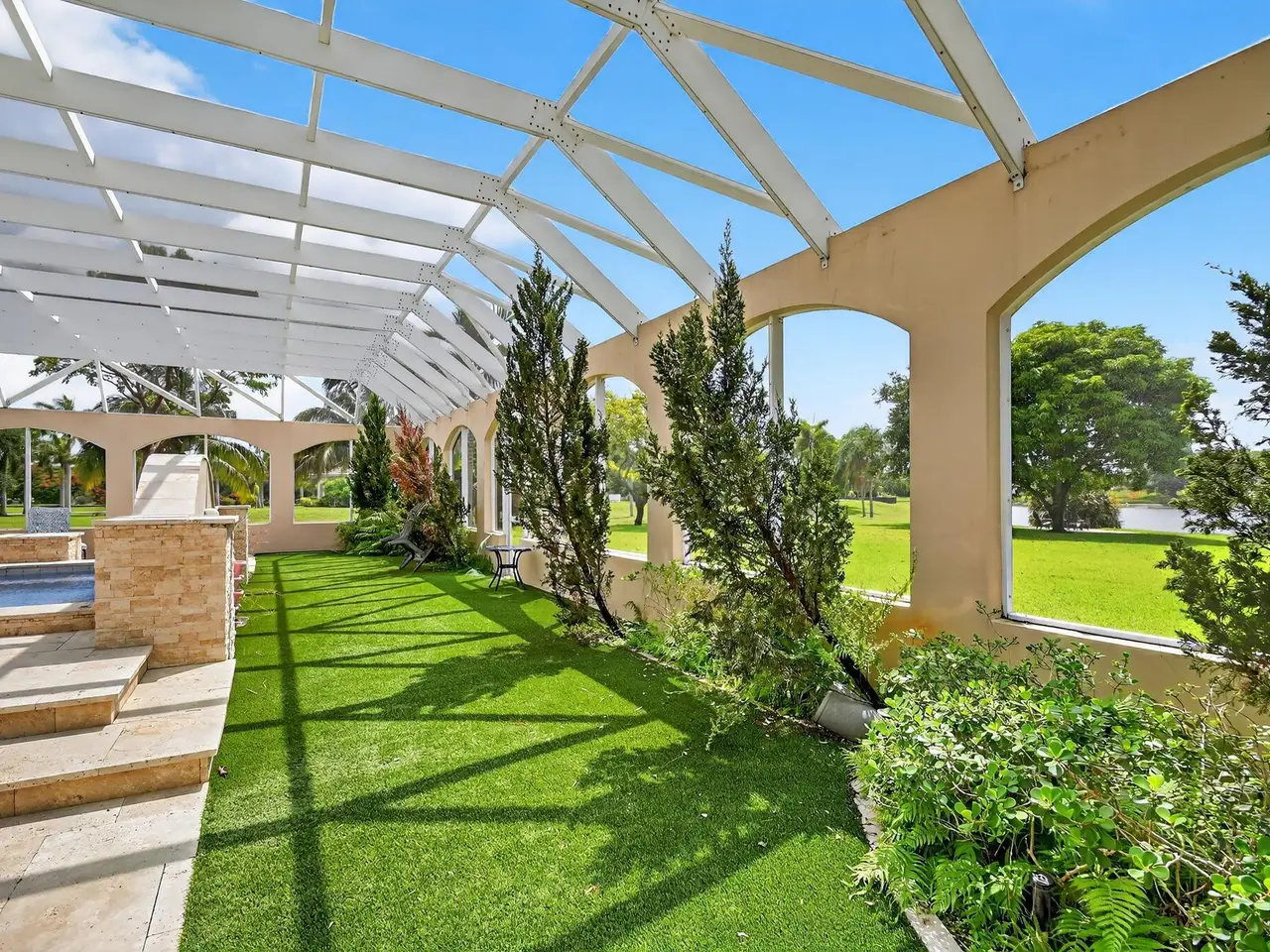 Casual elegance & exquisite craftsmanship define this magnificent custom-built home featuring 6 bedrooms, 7.5 bathrooms & 4 car garage. Situated on over 2 acres, the estate welcomes you with a wide circular driveway & fountain centerpiece. In the grand foyer, gleaming marble floors, a dazzling crystal chandelier & soaring ceilings create an unforgettable first impression. A breathtaking winding staircase sets the tone for the sophisticated design found throughout. The chef's island kitchen is a culinary dream, with 2 wall ovens, a Sub-Zero refrigerator & gas stove- perfect for entertaining or everyday luxury. Nearly every main room showcases a unique ceiling design, adding character & charm at every turn! Outside is your resort-style oasis. The pool/spa area is framed by elegant walled arches, creating a serene Mediterranean retreat. Multiple balconies & patios offer the perfect setting for al fresco dining, relaxation or entertaining. Wander down to the peaceful lakeside patio and soak in the views. Equestrians, your horses are welcome! Despite the serene seclusion, this exceptional home is conveniently located near restaurants, shops, cultural venues, & the Palm Beach International Airport. This one-of-a-kind estate is where timeless design meets modern luxury. Come experience it for yourself!