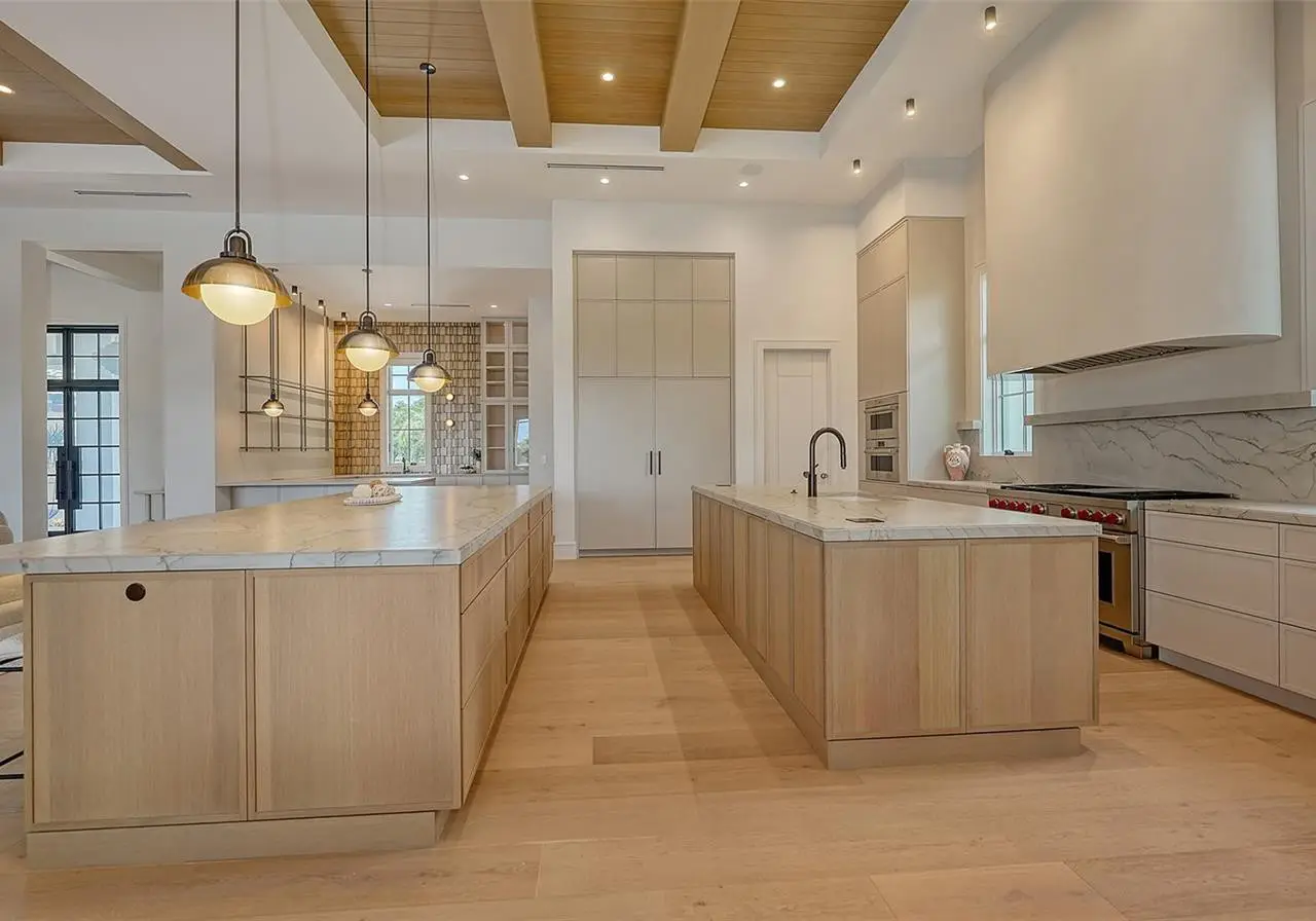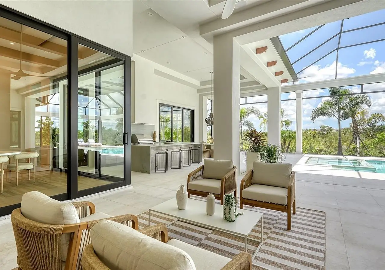 Tucked within the private, gated cul-de-sac enclave of Anchorage Place in The Lake Club, this six-month-old Stock Custom Home is a true architectural masterpiece. Set on two-thirds of an acre with sweeping views of lush natural surroundings, this 5,972 sq. ft., four- bedroom, five-and-a-half bath estate blends modern sophistication with serene, Florida resort-style living. Professionally decorated and fully furnished with new furnishings ($350K furniture package and $100K in recent upgrades), this stunning home embodies “organic modern” elegance—defined by earthy hues, layered textures, and refined finishes. The thoughtful design is evident from the moment you arrive, beginning with a smart glass iron front door with switchable privacy feature, intricate inlay flooring, and 15-foot tongue-and-groove rift-cut white oak ceilings that match the wood flooring throughout. The light-filled great room is anchored by a curved stucco wall with a 72” three-sided gas fireplace and features 10-foot pocketing sliding glass doors topped with transom windows, seamlessly connecting the indoors to the outdoors. A concealed TV, tucked behind remote-controlled artwork, adds to the room’s sleek, sophisticated design. Across the room, a custom curved kitchen hood echoes the architectural elegance of the fireplace wall. The chef’s kitchen is a showstopper with leathered quartzite countertops and backsplashes, dual islands with hidden storage, a large butler pantry, and luxury-grade appliances—including paneled Sub-Zero refrigeration and two Cove dishwashers, and a Wolf dual gas range with six burners, griddle, and double ovens, and a Wolf steamer oven and speed oven. Just off the kitchen is a stylish wet bar with ceiling-mounted shelving, decorative wall tiling, Sub-Zero wine refrigeration, and built-in ice machine—perfect for effortless entertaining. The open-concept dining area features corner pocket sliding doors for full integration with the lanai and pool area, while a generous and versatile bonus room offers flexible living space. The primary suite is a luxurious private retreat, complete with a cozy sitting area, a separate office with floor-to-ceiling built-ins, a morning bar, two custom walk-in closets, and a spa-inspired bath with integrated travertine wall, countertops and flooring, dual water closets, a walk-through shower, and an oval soaking tub. Each of the three guest suites includes its own full en-suite bath and walk-in closet, offering privacy and comfort for family or guests. Step outside to your own private resort—an expansive screened lanai (3,270 sq ft) featuring covered and open-air seating and dining areas, a full outdoor kitchen with island and bar seating, a 72” TV over a 48” linear vent-free fireplace, a saltwater pool and spa with a swim-up bar, and dramatic fire bowls—all set against the tranquil backdrop of preserved natural beauty. Additional highlights include a spacious laundry room with custom cabinetry, a symmetrical four-car garage, a whole-house gas generator, Lutron and Hunter Douglas shades, and an integrated “Smart Home” which includes house-wide boosted Wi-Fi with system integration for selected lighting and shades, all TVs, music, thermostats, all exterior lighting including the lanai and home security cameras. The home includes Starlink to ensure uninterrupted internet access. Located in Lakewood Ranch, Lake Club amenities include a clubhouse, pools, fitness center, tennis and pickleball courts, scenic trail.