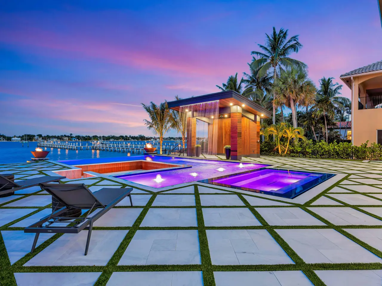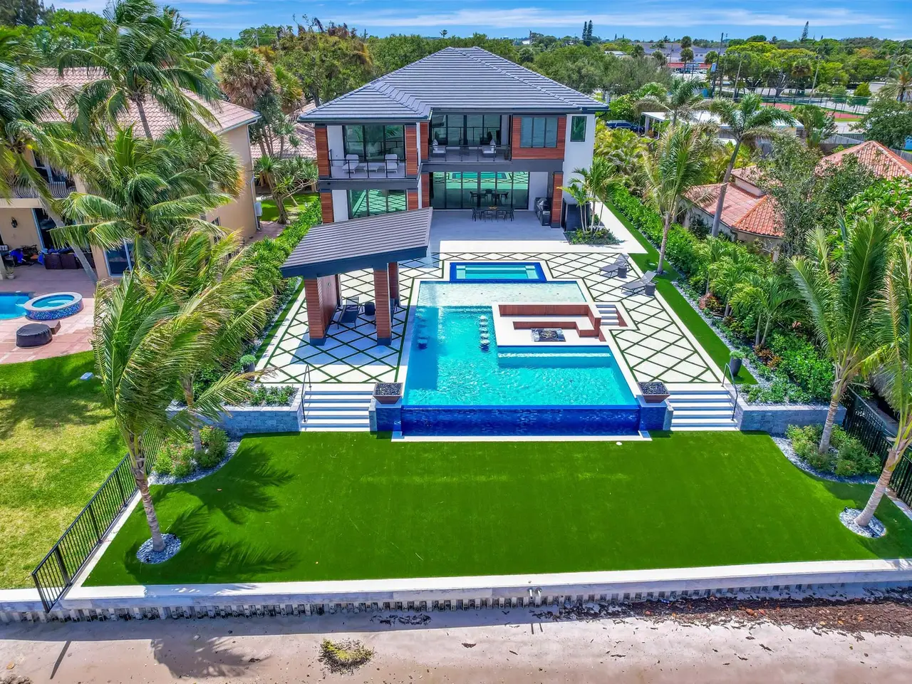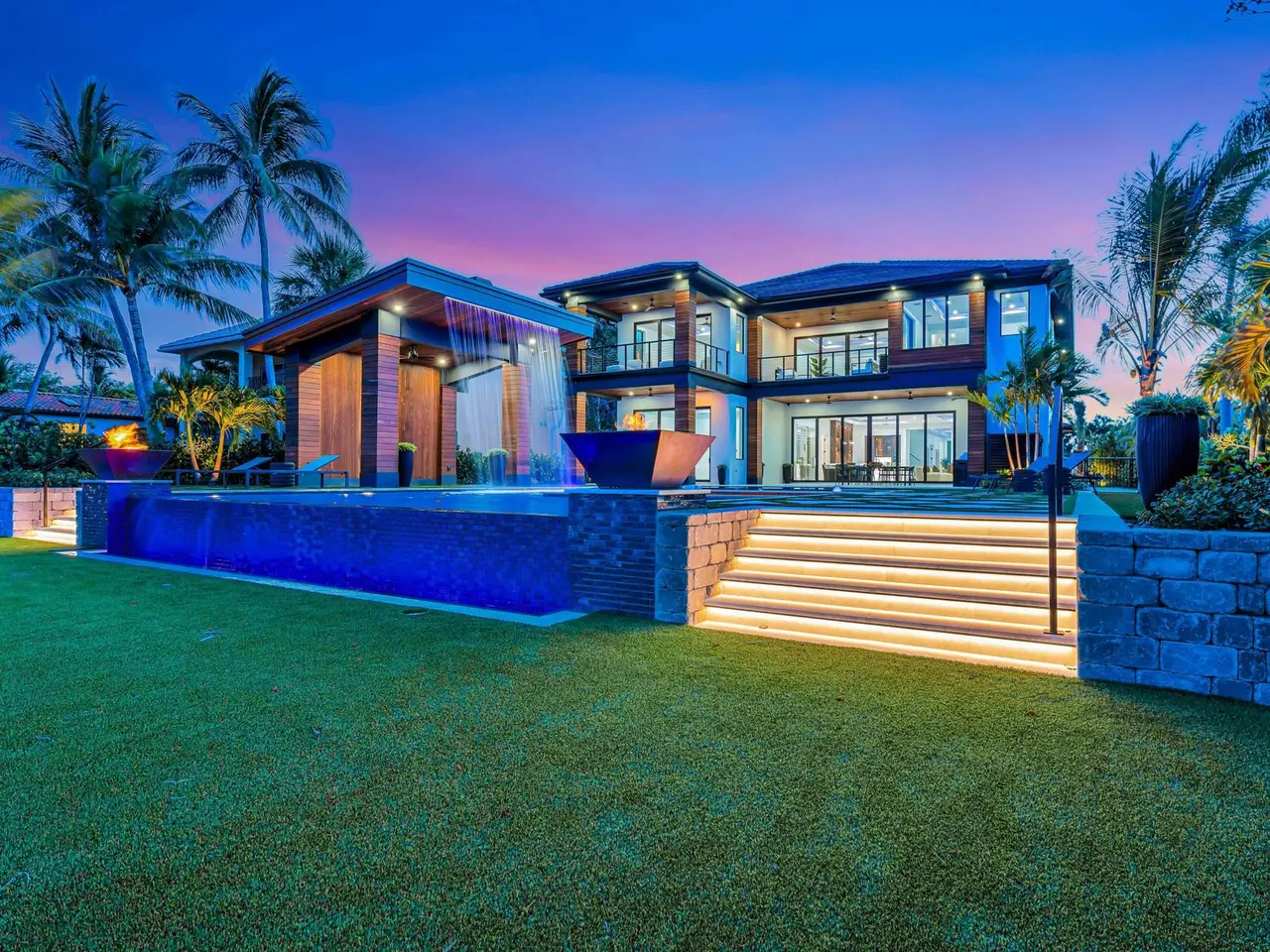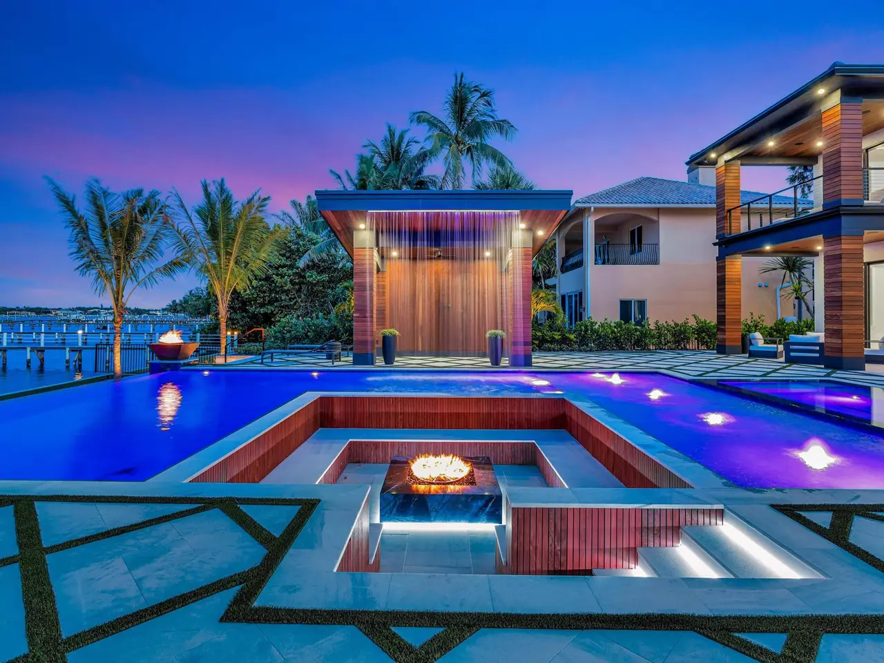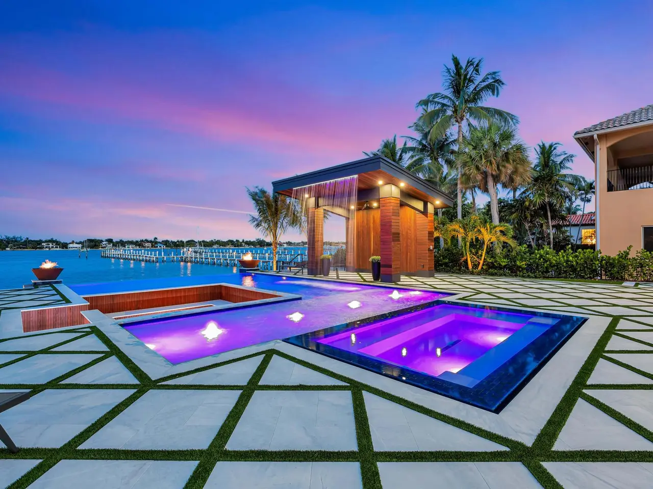Brand-new gated intracoastal estate in prime Lantana location! Brand new 385 foot dock with 32k boat lift and pilings to tie up your very large vessels. This is the lowest price per square foot new construction on the direct intracoastal in Palm Beach County! Walk to the beach, Eau Resort & Spa, and top dining spots. Just 1.5 mi to I-95, minutes to PBI & private jet access. This smart, energy-efficient compound offers ultimate privacy with unobstructed water views, upstairs/downstairs living rooms & master suites. Loaded with upgrades: Sonos, security, landscape lighting. Backyard is a showstoppera"$500K+ resort-style pool, sunken firepit, waterfall gazebo w/ 10 stools, and multiple fire features. Luxury living at its finest!