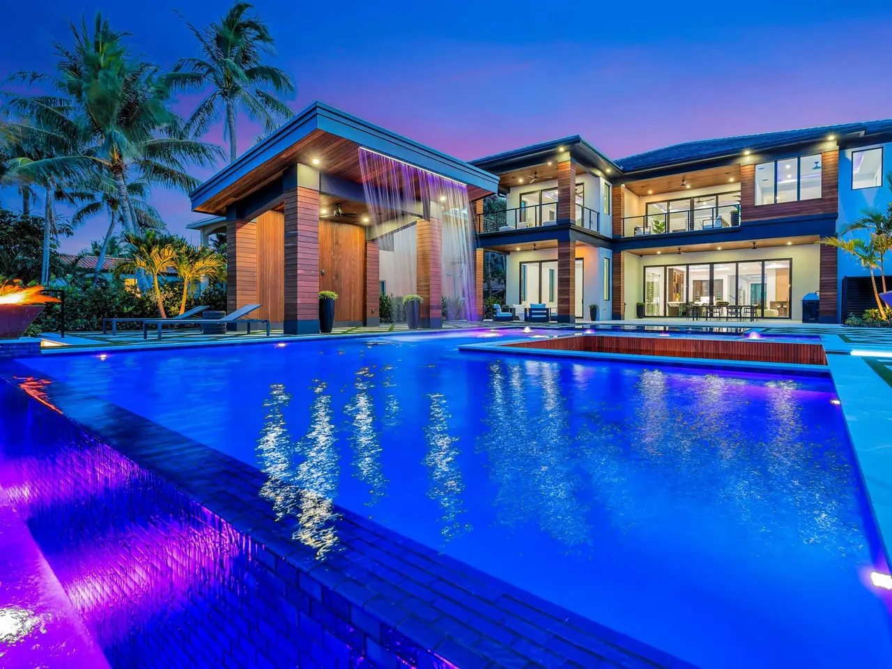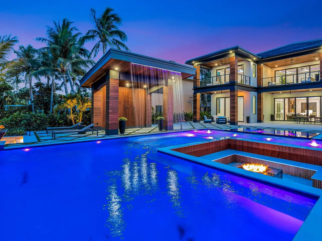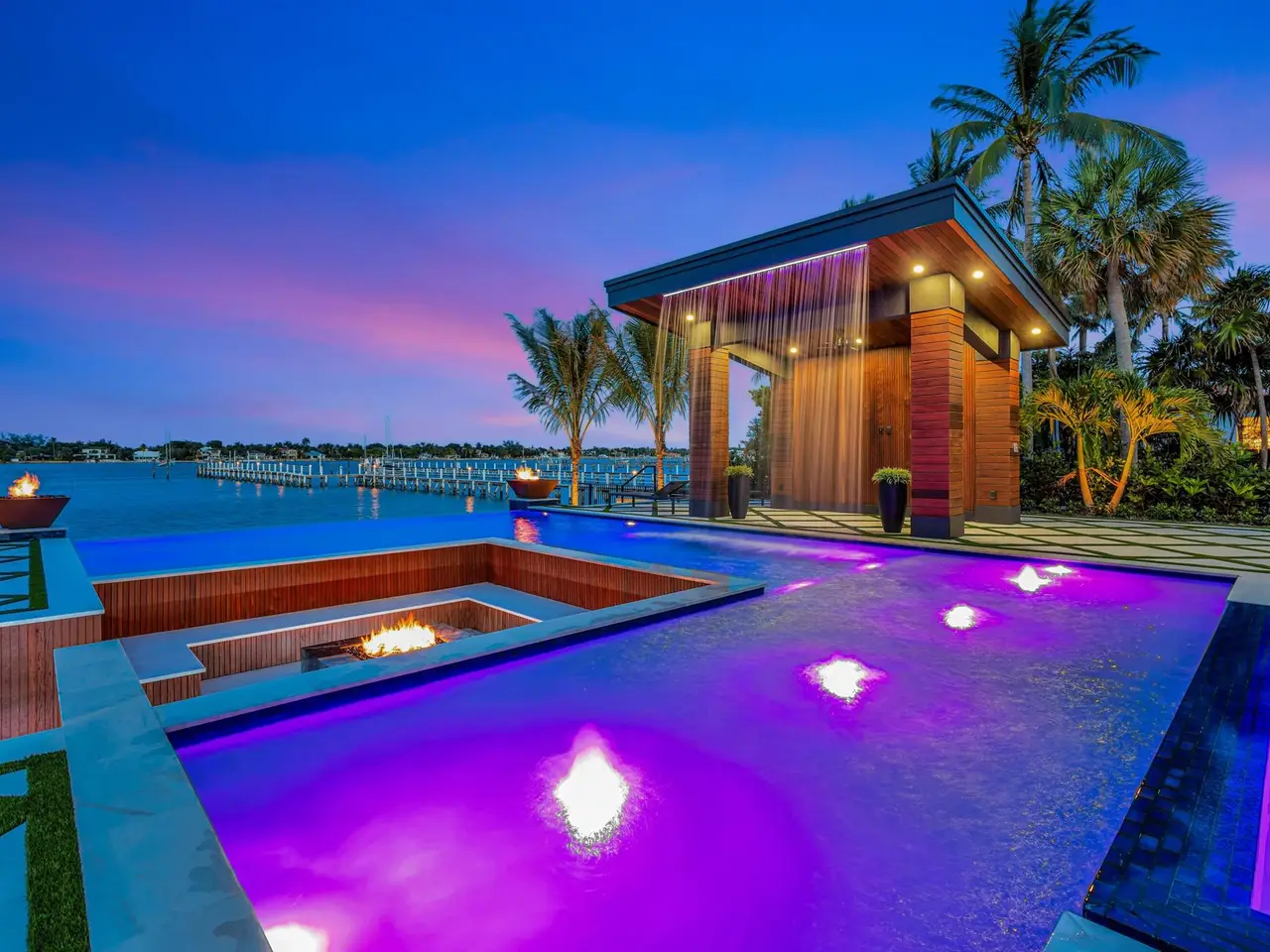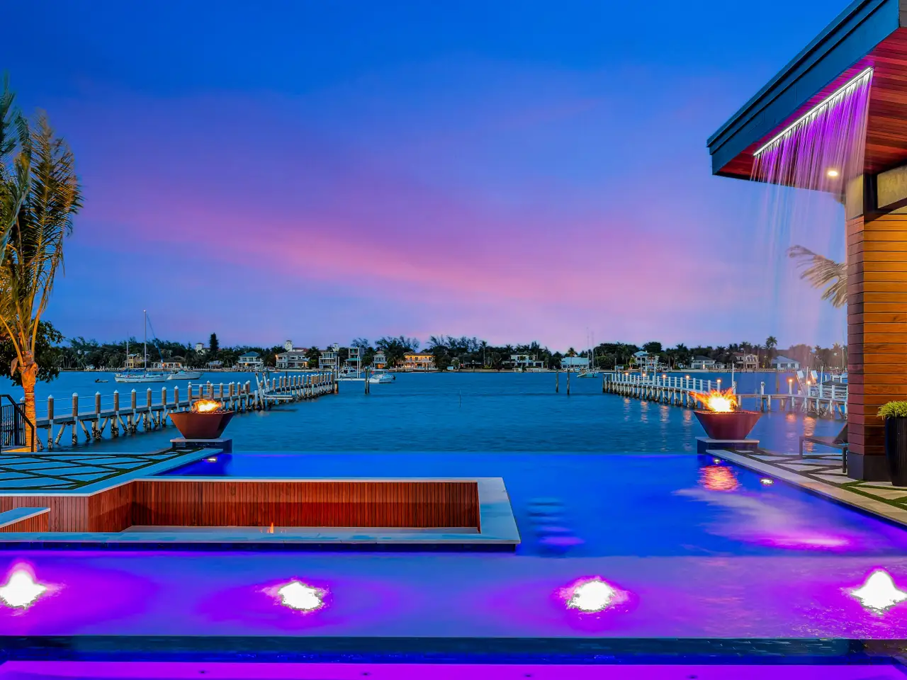 Brand-new gated intracoastal estate in prime Lantana location! Brand new 385 foot dock with 32k boat lift and pilings to tie up your very large vessels. This is the lowest price per square foot new construction on the direct intracoastal in Palm Beach County! Walk to the beach, Eau Resort & Spa, and top dining spots. Just 1.5 mi to I-95, minutes to PBI & private jet access. This smart, energy-efficient compound offers ultimate privacy with unobstructed water views, upstairs/downstairs living rooms & master suites. Loaded with upgrades: Sonos, security, landscape lighting. Backyard is a showstoppera"$500K+ resort-style pool, sunken firepit, waterfall gazebo w/ 10 stools, and multiple fire features. Luxury living at its finest!