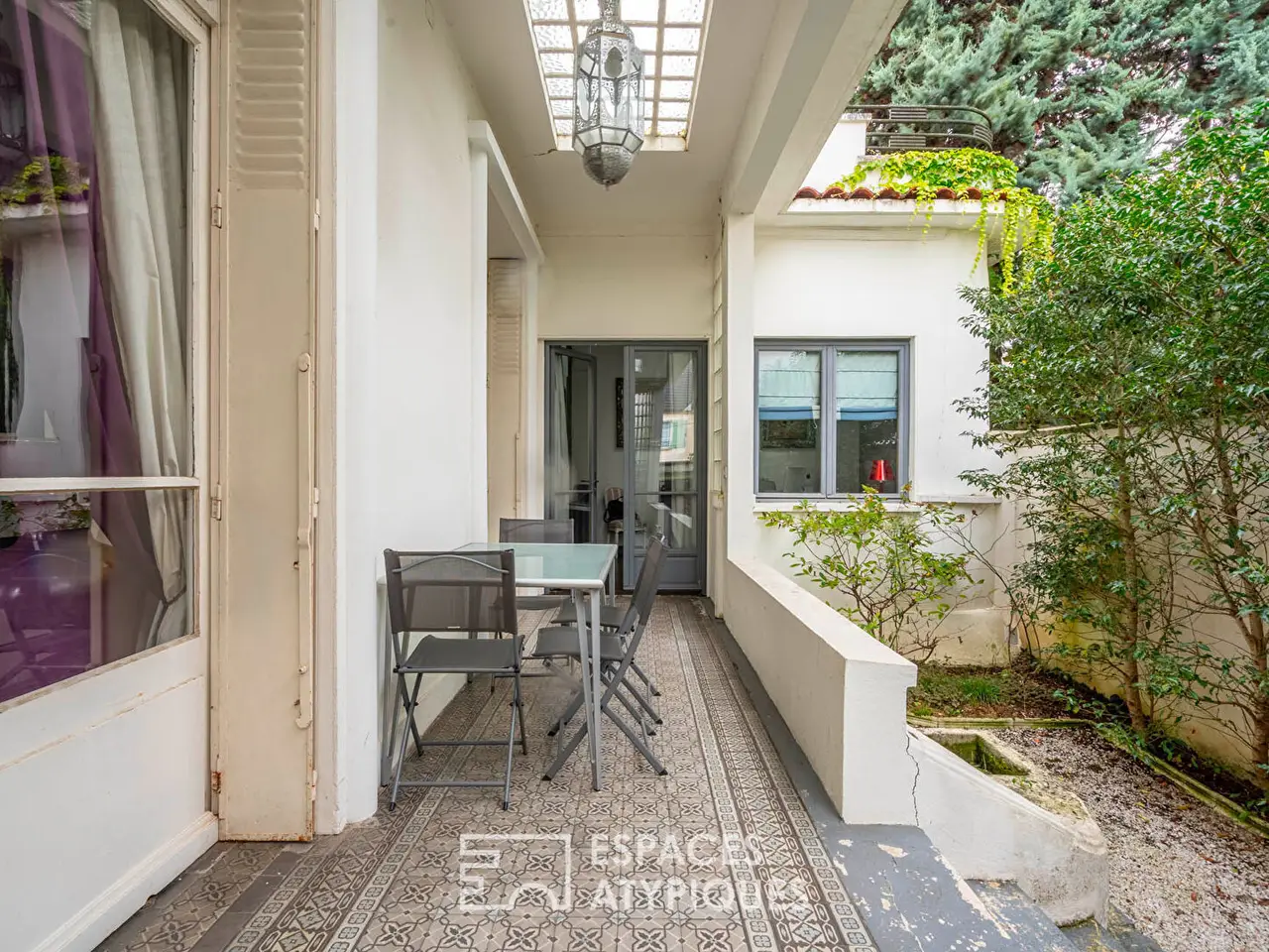A boudoir-like living room opens onto a lush garden, whose dense vegetation preserves a rare sense of privacy.