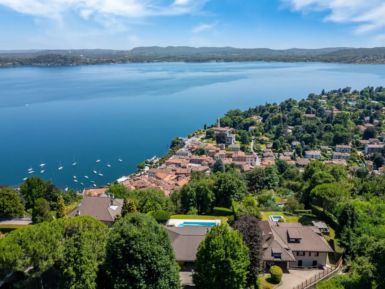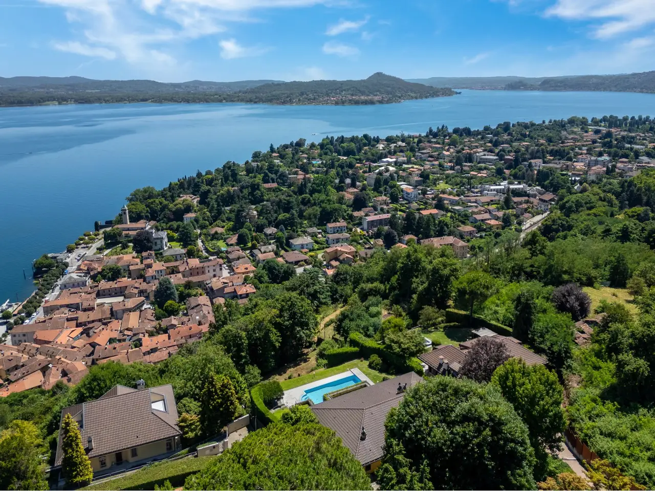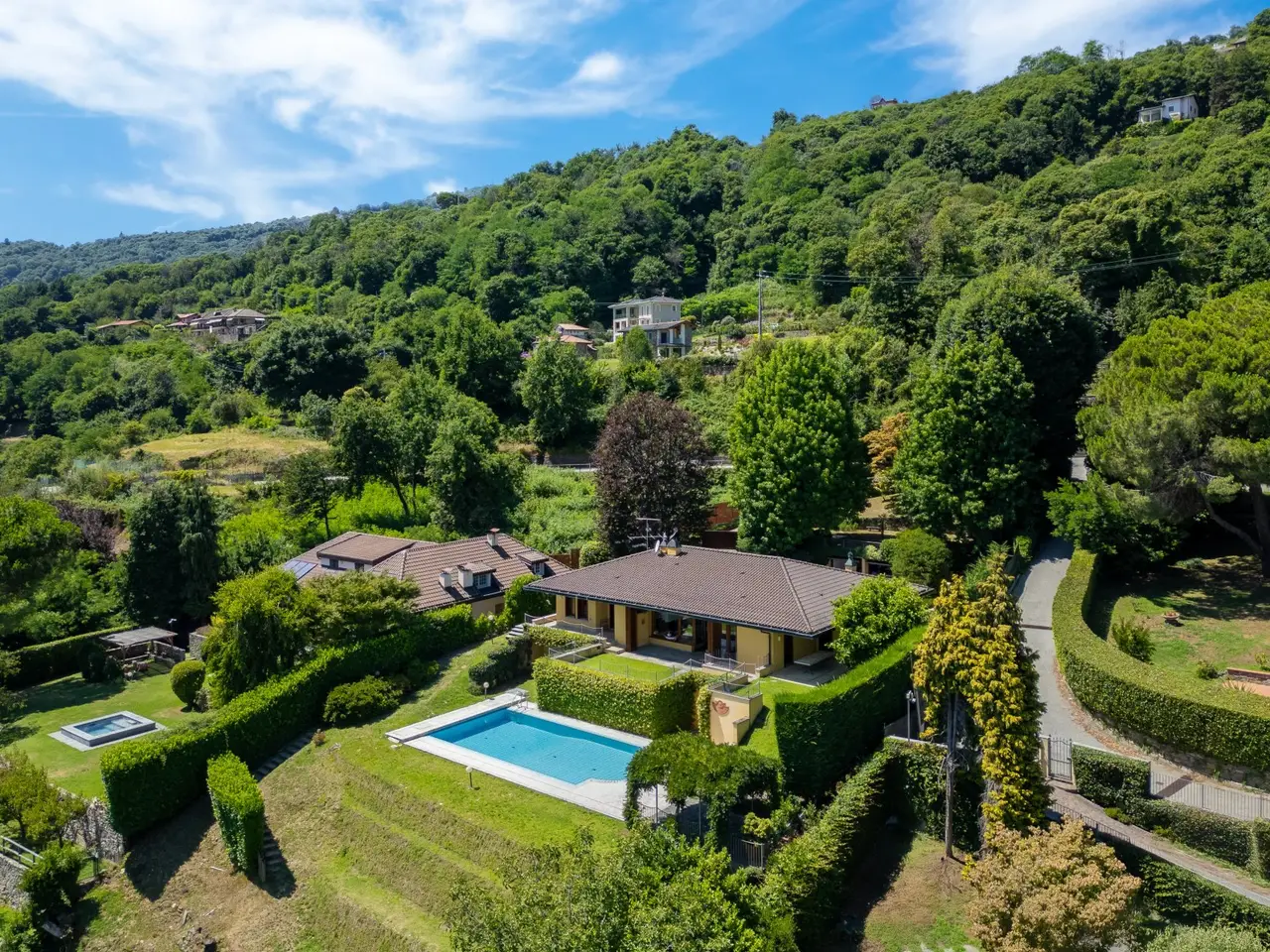 In a panoramic and private location on the hills of Lesa, we offer for sale a modern villa with breathtaking lake views, surrounded by a private park of about 3,700 sqm. The property is located in one of the most exclusive residential areas of Lake Maggiore, a few kilometers from the center, in an ideal location for those seeking tranquility, privacy and a representative residence. Main features of the villa on the mezzanine floor: - Main floor all on one level, ideal for enjoying the integrated convenience of space. - Large living room with panoramic windows overlooking the lake, connected to the dining area - Eat-in kitchen with adjacent workspace/den area - Master bedroom with en suite bathroom - Second master bedroom with en suite bathroom and walk-in closet - Courtesy bathroom for guests Ground floor: - Large tavern with fireplace - Third bedroom with en suite bathroom - Additional kitchenette, ideal for guests or staff - Study, technical rooms and various storage spaces (laundry, storage, etc.) Exterior and amenities: - Private pool with sunbathing area - Panoramic terraced garden of about 3,700 sq. m. - Pergola with wisteria ideal shaded area to create a barbecue adjacent to the pool and lake view terraces - Double covered garage and large porphyry-paved courtyard - Irrigation system, outdoor lighting, automatic gate, alarm system. This villa for sale in Lesa is perfect as a first home or vacation residence. The commanding location offers spectacular views of Lake Maggiore, while the spacious interior and exterior spaces make it ideal for families as well.