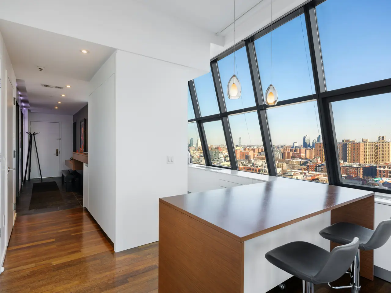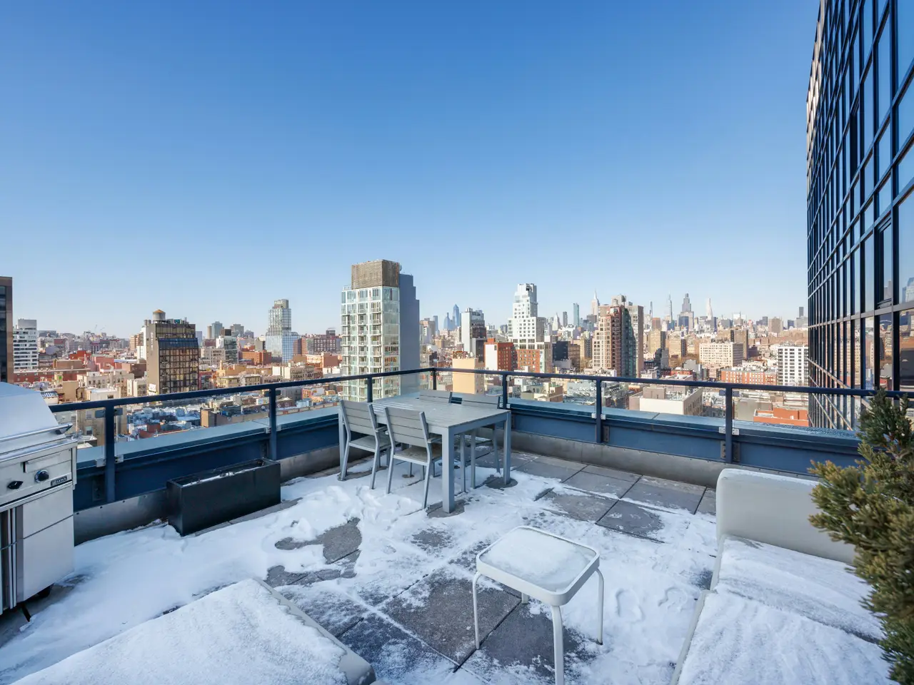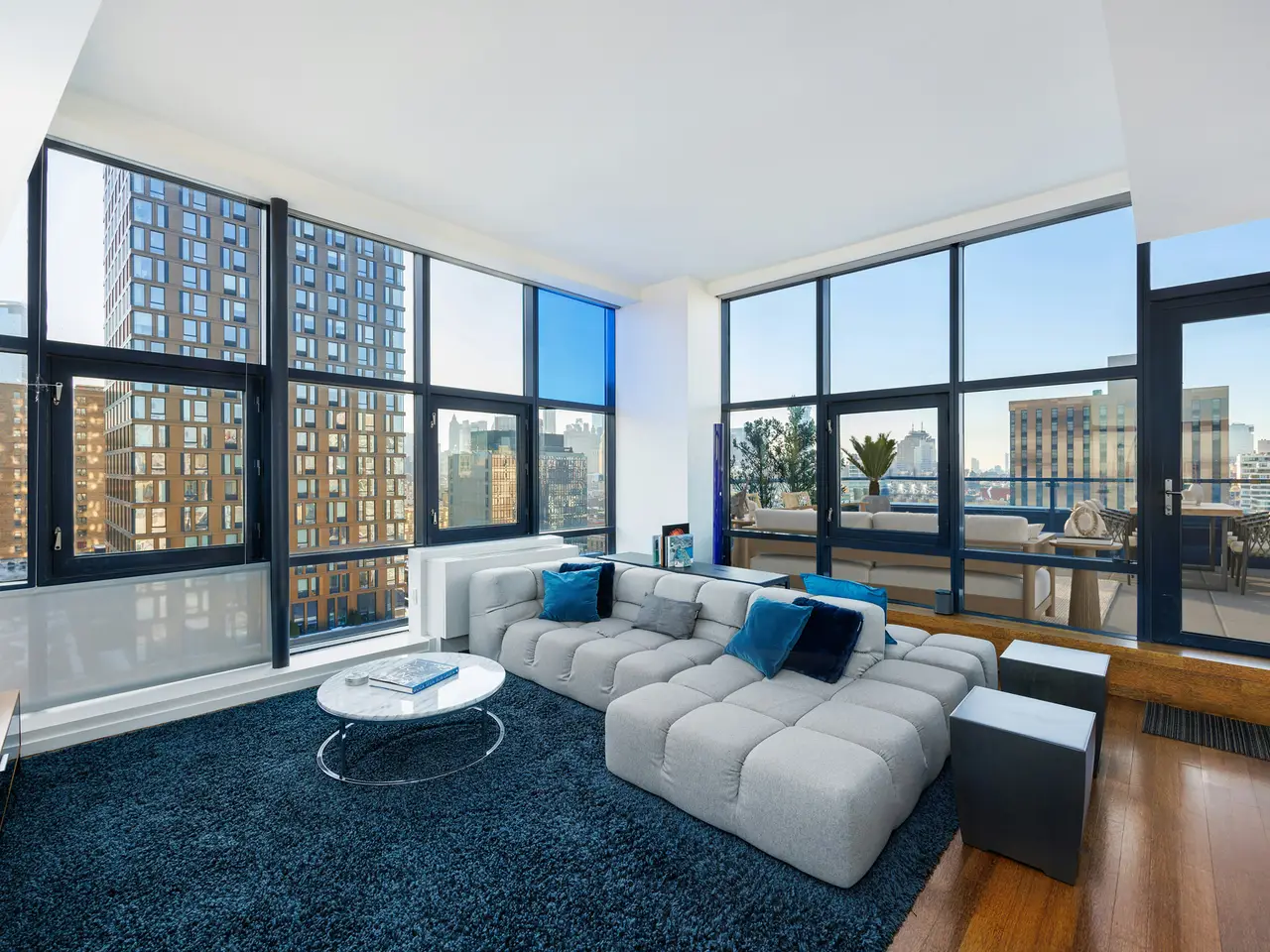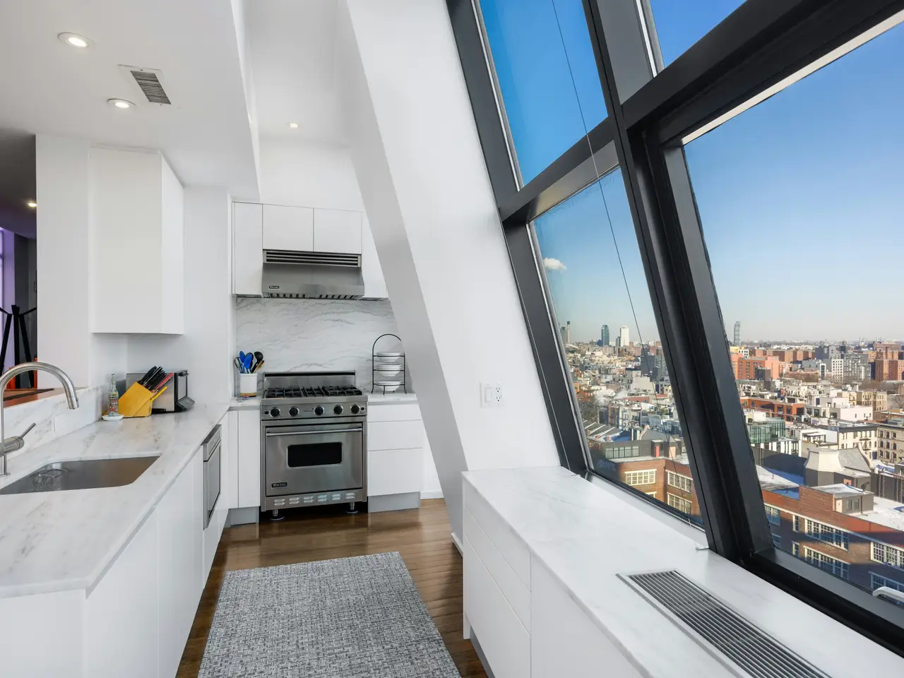 True Duplex penthouse condos (no one living above you) are rare; there are currently only 12 listed. Not only is this the least expensive, but the average cost of the other 11 is almost double that of this listing. This is not because this one is a slouch-quite the opposite. To begin with, it has the best view of all of them, but there is so much more because, at 2,500 sf, this true penthouse with two bedrooms, three baths, and an oversized Direct Living terrace is a perfect home. The lower floor is completely dedicated to the public spaces, while the upstairs is for the private areas, and the two are seamlessly separated by a windowed staircase. The key-locked elevators open on the public floor, so let's begin here. The first thing you notice is the clever flow created by opening the wall between the foyer and the kitchen. This improved both rooms. The vestibule is now a bright area with ingenious storage spaces and display shelves, ensuring that this often-forgotten spot is fully integrated, it even has a full bathroom on the north end. This bathroom's noteworthy feature is a widowed shower. (don't worry no neighboring building is high enough). The living spaces on the south side of the gallery are striking with their panoramic views (not hyperbole here. However, they need to be seen in person to be fully appreciated because the 10+ft ceiling height, full-height glass on three sides, and a slant on the east side make the room appear smaller in pictures. However, the floor plan does not lie, at 17x32, this is a very large room. One standout feature of this penthouse is the perfectly proportioned Direct Living terrace. At an almost square configuration, this terrace is perfect for entertaining. With nearly 300 degrees of open views, you have plenty to gawk at, but with no building blocking your view North, your vista of midtown is among the best I have ever seen. The kitchen is truly a study in clever design, and what you end up with is a very practical space with stunning views, plenty of storage, and commercial-grade appliancestruly a chef's dream. The aforementioned opening to the vestibule makes the kitchen feel much larger and creates a super cool dining counter. While the low storage cabinets on the slanted east wall are so clever, you can see the next owner continuing them everywhere this wall is exposed. Up the windowed staircase are two bedrooms, each with an ensuite bathroom, the smaller bedroom has a wall of windows facing east, awarding you perfect sunrise views framed by the Williamsburg Bridge, which is quite unique. The primary is a complete suite with a walk-in closet, a five-fixture bathroom, and three exposures. Regardless of the open feel these windows provide, privacy is ensured throughout, with no building on your elevation within reach. To round out the offering on the table here, the apartment has a washer and dryer. And this unit comes complete with a private storage space with its own electricity, making it a perfect wine storage. The Condo building is called BLUE; it was built in 2007 by the acclaimed architect Bernard Tschumi. It offers 8000 square feet of terraces along with Fios internet, refrigerated storage, a bike room, a full-time doorman, and concierge services. Conveniently situated fifty feet from the F-J-M-Z trains, BLUE is nestled within the vibrant heart of New York's bustling Lower East Side, with all of your favorite amenities, including the famed Essex Market, Katz' Delicatessen, Russ & Daughters, the New Museum and so much more.