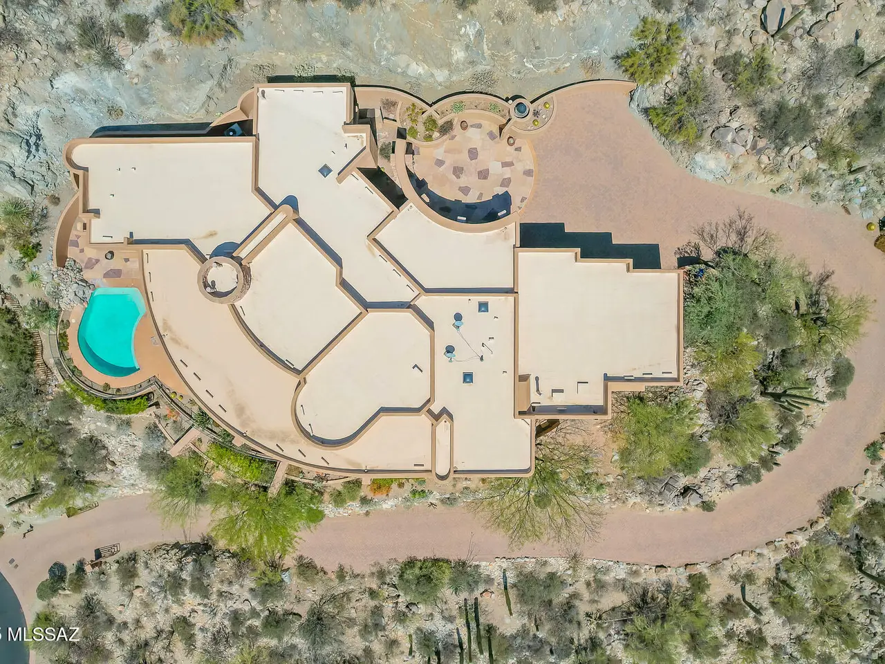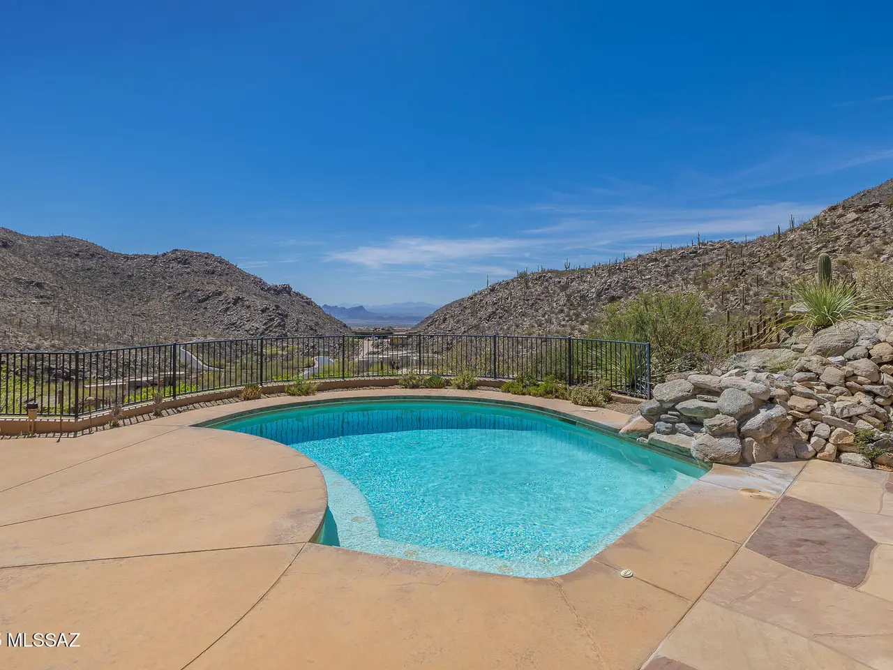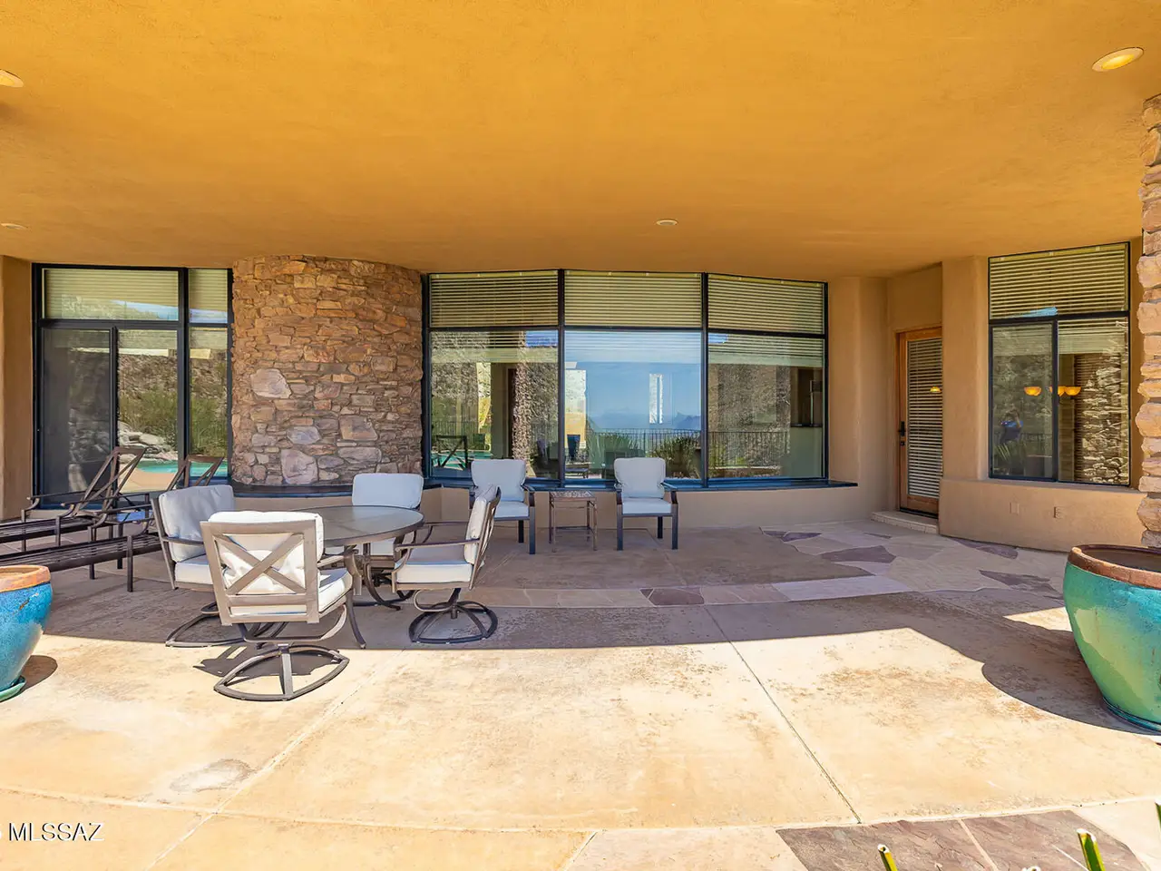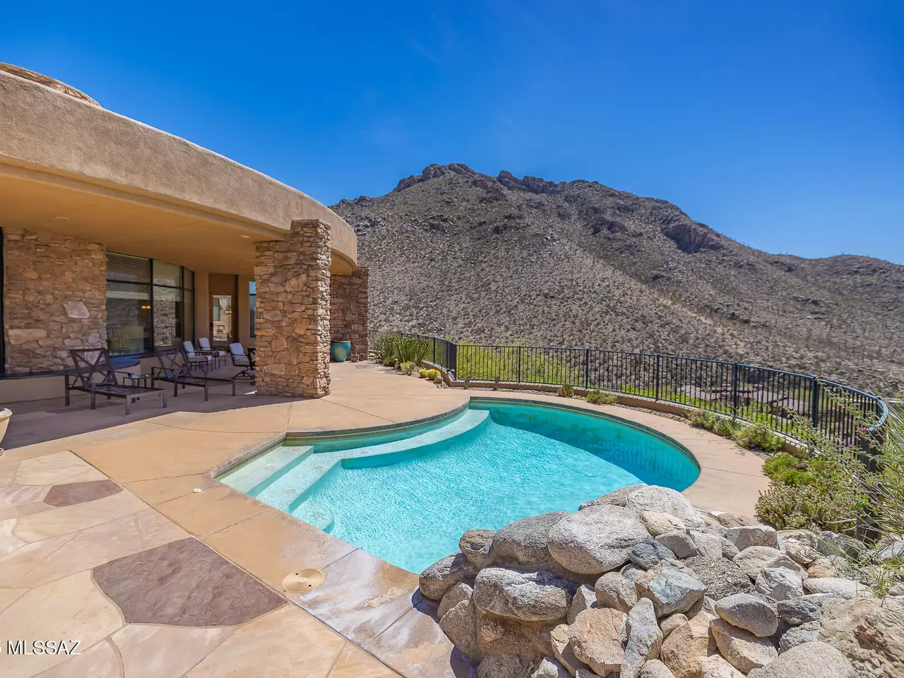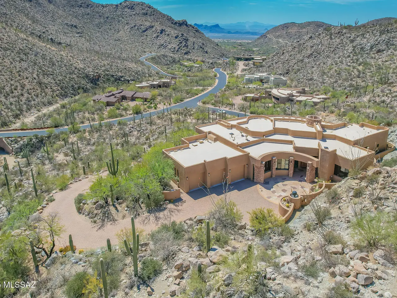 LUXURIOUS CUSTOM ESTATE sits high nestled against the Tortolita Mountains in the premier, guard gated community of Canyon Pass at Dove Mountain. Enjoy breathtaking panoramic views of the canyon, valley and mountains beyond... plus a sparkling, heated pool. Gated drive winds to a flagstone patio entrance with orbital water fountain. This 3, 665 sq ft residence affords 4 bedrooms and 4 full baths plus den/office. Large gathering room greets you with soaring ceilings, wall-to-wall view windows, corner stacked stone fireplace and custom art/media center. Formal dining area with views lies off a gourmet kitchen offering large island with prep sink, granite slab countertops, stainless/black appliances, built-in workstation and pantry, plus wood paneled Sub-Zero refrigerator/freezer, Dacor microwave and Asko dishwasher. Elegant Owner's suite accesses rear patio and hosts a stacked stone fireplace and luxury bath with granite covered vanity, jetted tub, circular tiled walk-in shower plus dual walk-in closets. Bedrooms 2 & 3 offer luxury en suite baths. Bedroom 4 lies off hall bath. Other luxury amenities include flagstone flooring, alderwood cabinets, curved walls & windows, stacked stone outdoor columns & interior accents, custom closets, skylights, art niches, recessed ceilings & clerestory windows. Extended laundry with sink, zoned heating/cooling and water heaters, plus 3-car extended garage with customized storage room. Security features include gated driveway, alarm and fire suppression. Retreat to a spectacular rear oasis with flagstone patio accents, wrought iron view fence, heated pool with rock waterfall plus breathtaking panoramic views. Dove Mountain is home to the Ritz-Carlton Resort & Spa, Gallery Golf & Sports Club, Golf Club at Dove Mountain, plus sport parks and hiking/biking trails.
