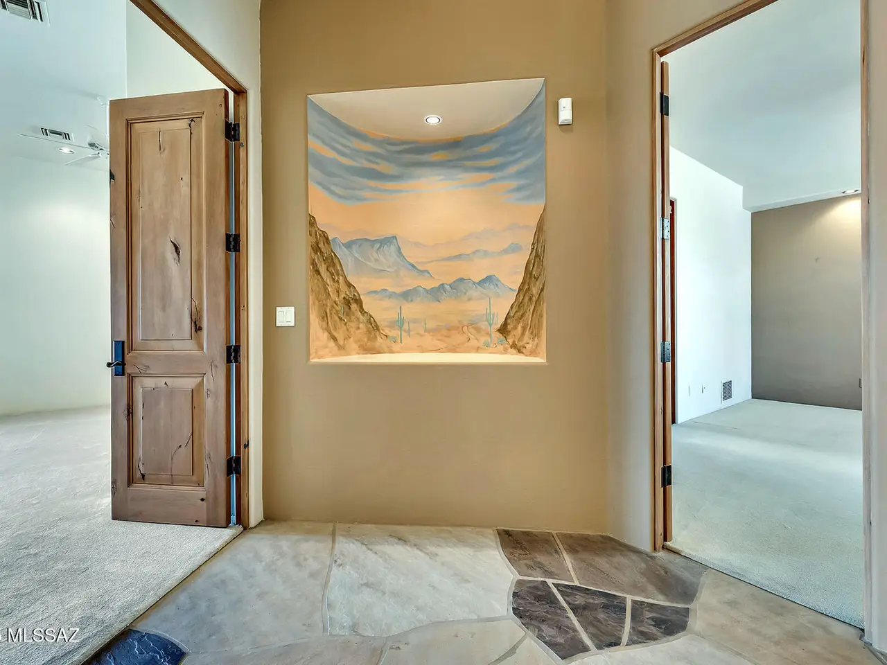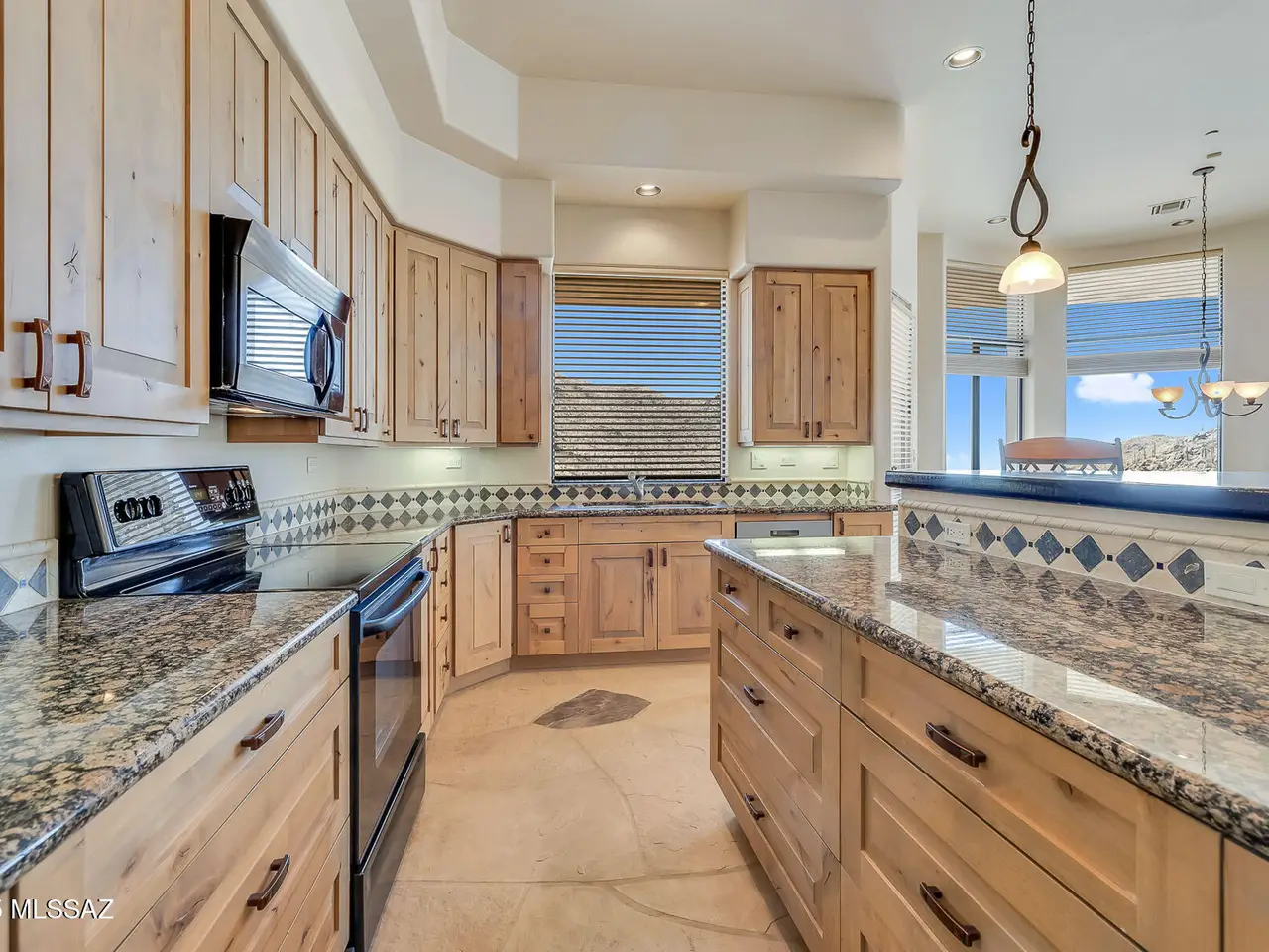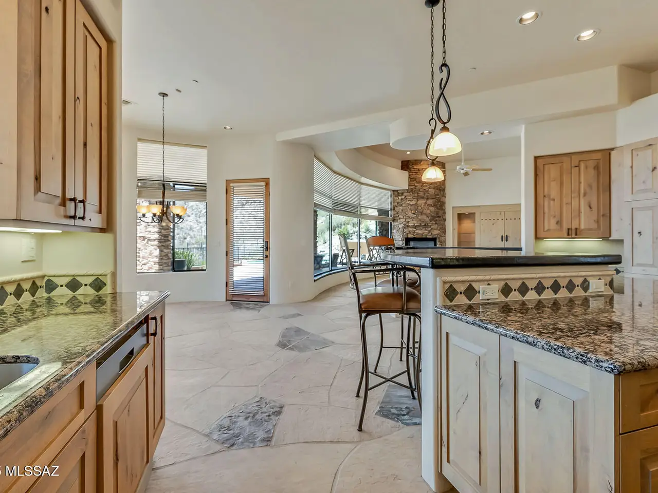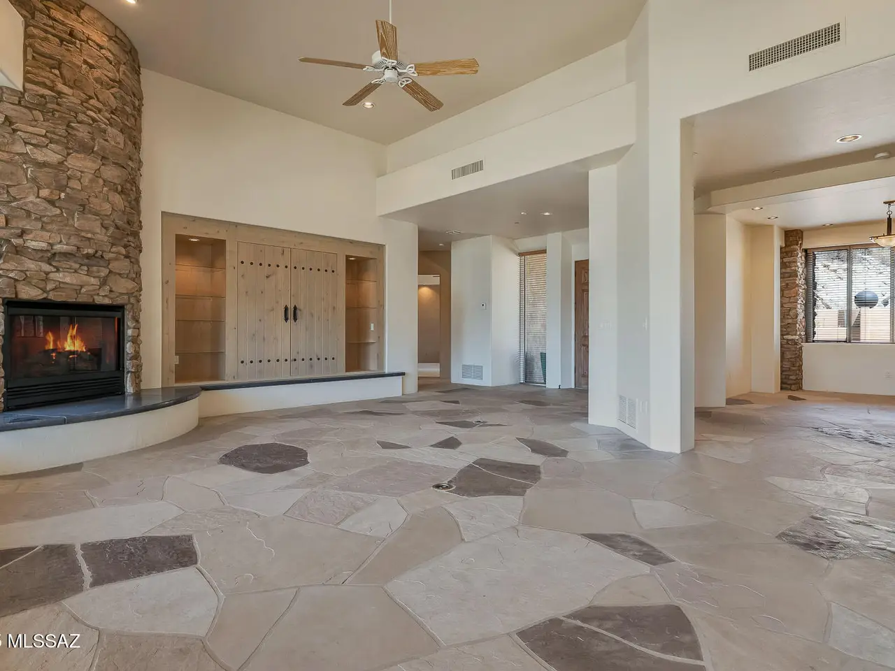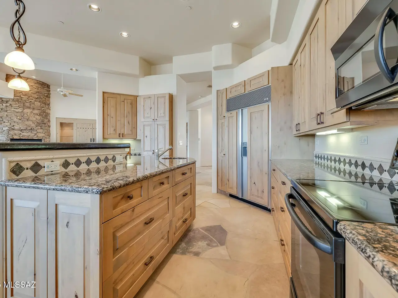 LUXURIOUS CUSTOM ESTATE sits high nestled against the Tortolita Mountains in the premier, guard gated community of Canyon Pass at Dove Mountain. Enjoy breathtaking panoramic views of the canyon, valley and mountains beyond... plus a sparkling, heated pool. Gated drive winds to a flagstone patio entrance with orbital water fountain. This 3, 665 sq ft residence affords 4 bedrooms and 4 full baths plus den/office. Large gathering room greets you with soaring ceilings, wall-to-wall view windows, corner stacked stone fireplace and custom art/media center. Formal dining area with views lies off a gourmet kitchen offering large island with prep sink, granite slab countertops, stainless/black appliances, built-in workstation and pantry, plus wood paneled Sub-Zero refrigerator/freezer, Dacor microwave and Asko dishwasher. Elegant Owner's suite accesses rear patio and hosts a stacked stone fireplace and luxury bath with granite covered vanity, jetted tub, circular tiled walk-in shower plus dual walk-in closets. Bedrooms 2 & 3 offer luxury en suite baths. Bedroom 4 lies off hall bath. Other luxury amenities include flagstone flooring, alderwood cabinets, curved walls & windows, stacked stone outdoor columns & interior accents, custom closets, skylights, art niches, recessed ceilings & clerestory windows. Extended laundry with sink, zoned heating/cooling and water heaters, plus 3-car extended garage with customized storage room. Security features include gated driveway, alarm and fire suppression. Retreat to a spectacular rear oasis with flagstone patio accents, wrought iron view fence, heated pool with rock waterfall plus breathtaking panoramic views. Dove Mountain is home to the Ritz-Carlton Resort & Spa, Gallery Golf & Sports Club, Golf Club at Dove Mountain, plus sport parks and hiking/biking trails.