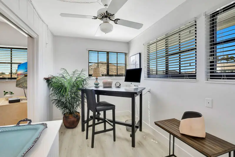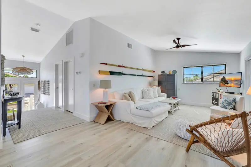 Enjoy waterfront living in this beautifully updated 2-bedroom plus den, 2-bath home on Marco Island. Located on an indirect Gulf-access canal with 100' on the water, the property features a private dock with boat lift, perfect for boating and fishing. Relax by the screened-in pool or take in the water views from the upper-level lanai. The light and airy interior offers an open floor plan with coastal-inspired finishes. The updated kitchen includes shaker cabinetry, solid surface counters, tile backsplash, farmhouse sink, and modern appliances. The den provides flexible space for a home office or guest room, while the primary suite offers comfort and style. Designed for the Florida lifestyle, this home offers multiple outdoor living spaces, impact windows, and a beautifully landscaped yard. Ideally located near Marco Island's beaches, shopping, and dining.