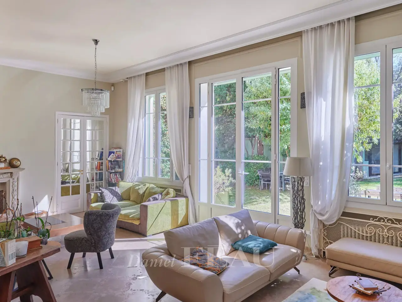 This renovated 1920s property set in a 560 sqm south-west facing plot is set in a discrete little cul-de-sac between the Saint-Giniez neighbourhood and Parc Borely. Renovated in 2018 allying contemporary style with period charm, it offers about 230 sqm of tastefully renovated living space including a spacious living/reception room with an original fireplace, a dining room, a kitchen, a study, a utility room, and a master suite with a bathroom and dressing room. Upstairs are four bedrooms (two opening onto a wide terrace), a bathroom and a shower room. With a sauna, a workshop and a carport. The leafy garden features a heated swimming pool and a pool-house.