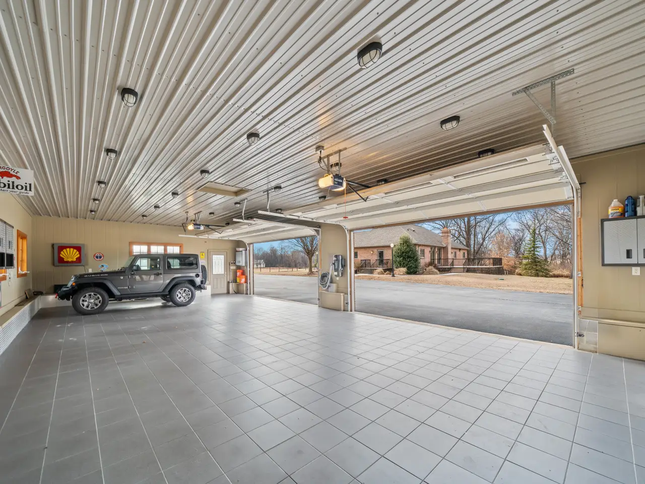 Four-car garage with tile floor and EV charging station