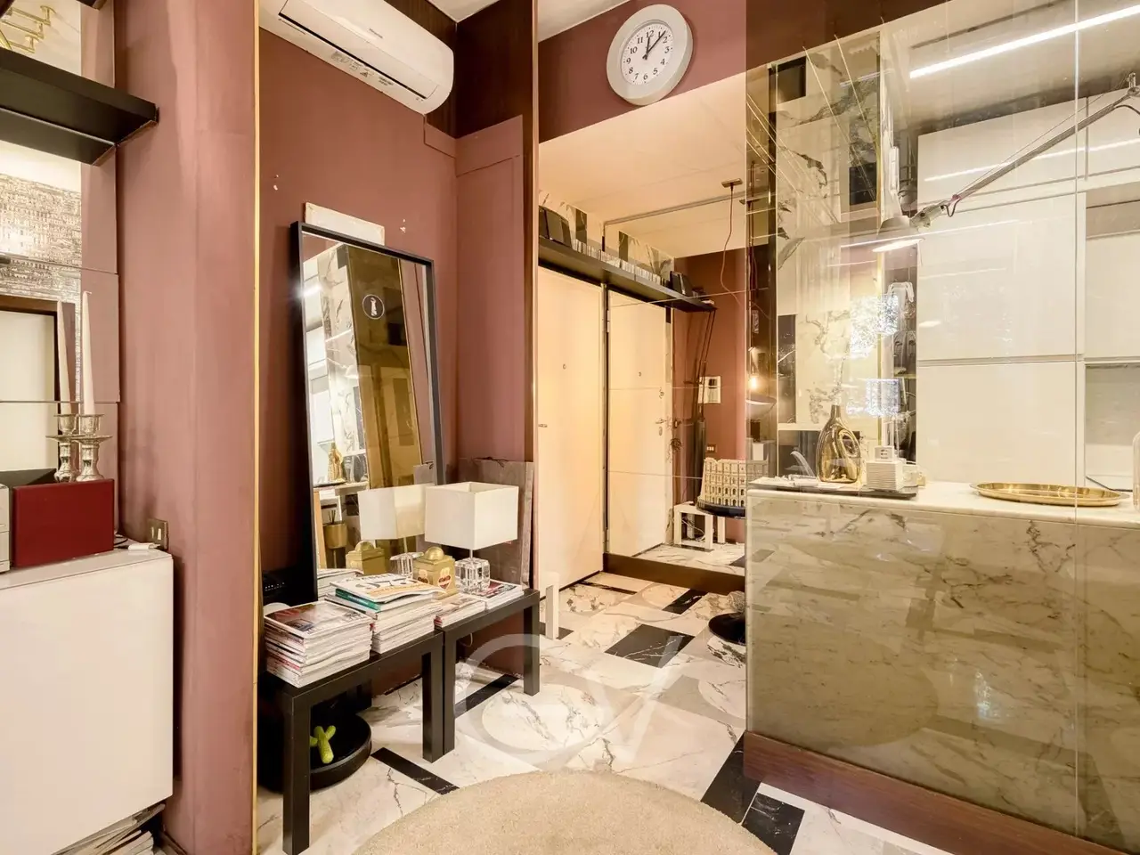 gv1369 - Senato, via Marina - In the heart of Milan, design and charm in cozy-chic two-room apartment. A charming and elegant 57sqm apartment is a marvelous peaceful nest, a chic oasis of sophisticated refinement where every detail is cured and studied to add beauty which goes well with the wonderful location, Via Marina, one of the most beautiful and seeked street of Milan, surrounded by secret gardens, in the historical center heart of Milan, just a few steps away from the Shopping District, but even more chic because it is immersed in the silence and exclusivity of living in one of the few residences present. The entrance, from the stately 1950’s building signed by the Architect Ignazio Gardella, opens in a private position on the mezzanine floor on an entrance with armoured door, from which takes shape a disengagement beautifully decorated with brass plates and marble-effect inlay stoneware which already makes you enter in the mood of the dwelling, which is accessed with a second armoured door. Here it develops a magnificent living room, overlooking the greenery and the Senato secret gardens, where the Fornasetti wallpaper invites you into a world of refined architecture, amplified by the mirrored wall and embellished by the long black marble shelf. In front of it, the eat-in kitchen remains semi-open and is on the other hand essential, white and well organized. The master bedroom also is illuminated by two large flanked windows and has a space for a big wardrobe. The windowed bathroom, also finely decorated in marble, has a wide shower and Gio Ponti taps in the brass series for Momoli. To complete a cellar and a suitable condominium area in use of the apartment used as a laundry / storage room with an additional balcony area to move the containers. The apartment is delivered with air conditioning and complete of all the fixed furnitures with the possibility of detecting the magnificent design furnitures present on request. The splendidly rationalist building faithful to Gardella’s Lombard tradition has centralized heating and presents large, majestic, common spaces that embellish the dwelling as well as an impeccable concierge service. Class F – Ipe 232,14. € 950.000. The choice of this property helps to support the mission of Theodora onlus. Photos, texts, floor plans, etc., are purely for indicative-illustrative purposes and do not constitute documents with contractual value and assumption. Giorgio Viganò Real Estate - 027636151 - www.giorgiovigano.com