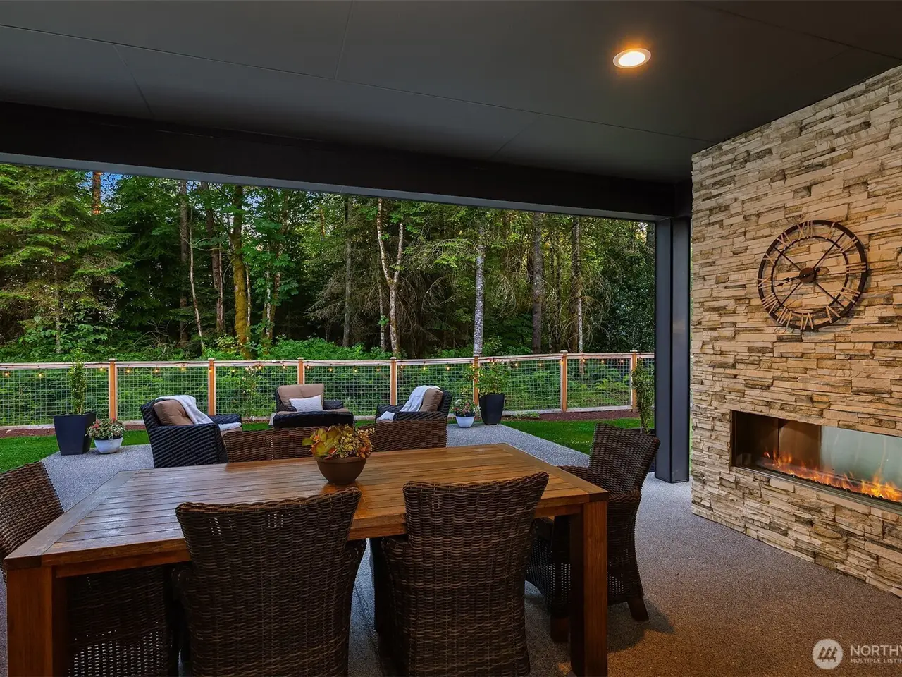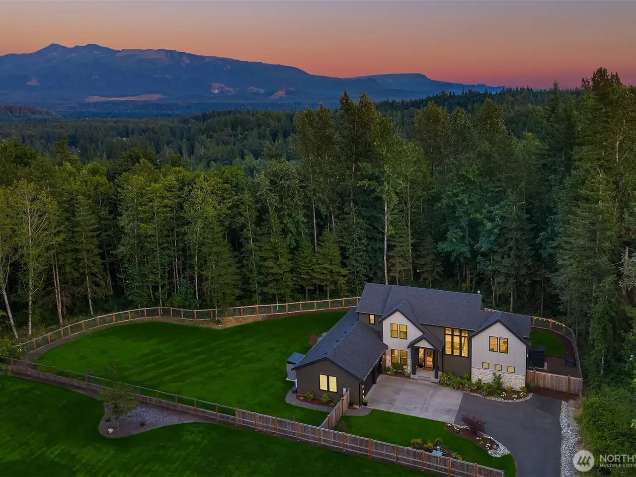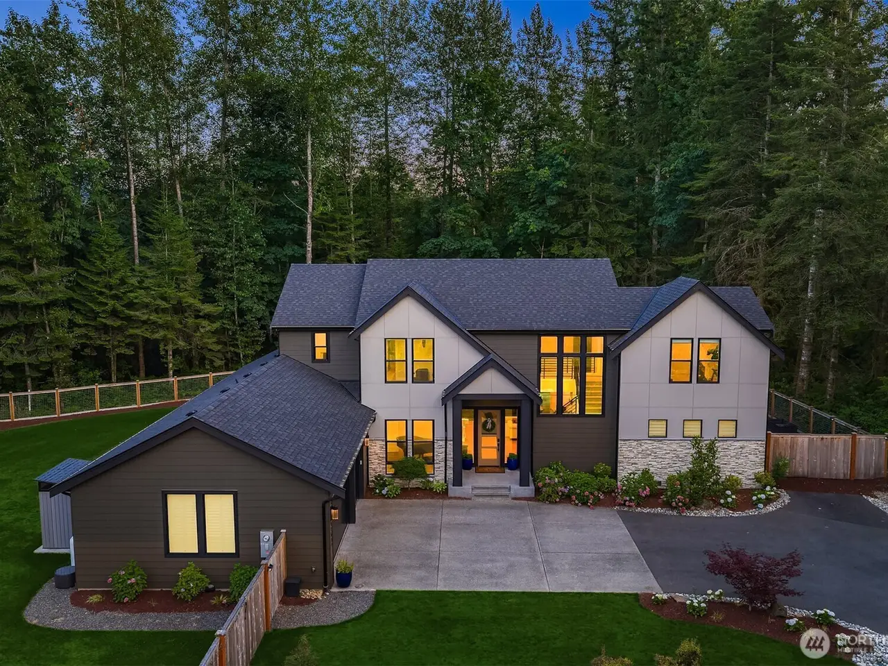 Tucked away in a private enclave, this stunning retreat sits on 1.25 acres - offering room to dream. Built just two years ago with high-end finishes, gorgeous hardwoods, and top-tier appliances, every detail is stunning. Thoughtful floorplan features an impressive great room with a floor to ceiling fireplace, spacious main-floor primary suite with a 5-piece spa bath and a junior suite, plus three additional bedrooms and a large bonus room upstairs. Soaring ceilings, designer lighting, and a gourmet kitchen create an open, airy vibe. Great room flows effortlessly out to the covered patio with fireplace - perfect for year-round enjoyment. With total privacy, level fenced yard, and space to relax, this home offers the best of Northwest living.