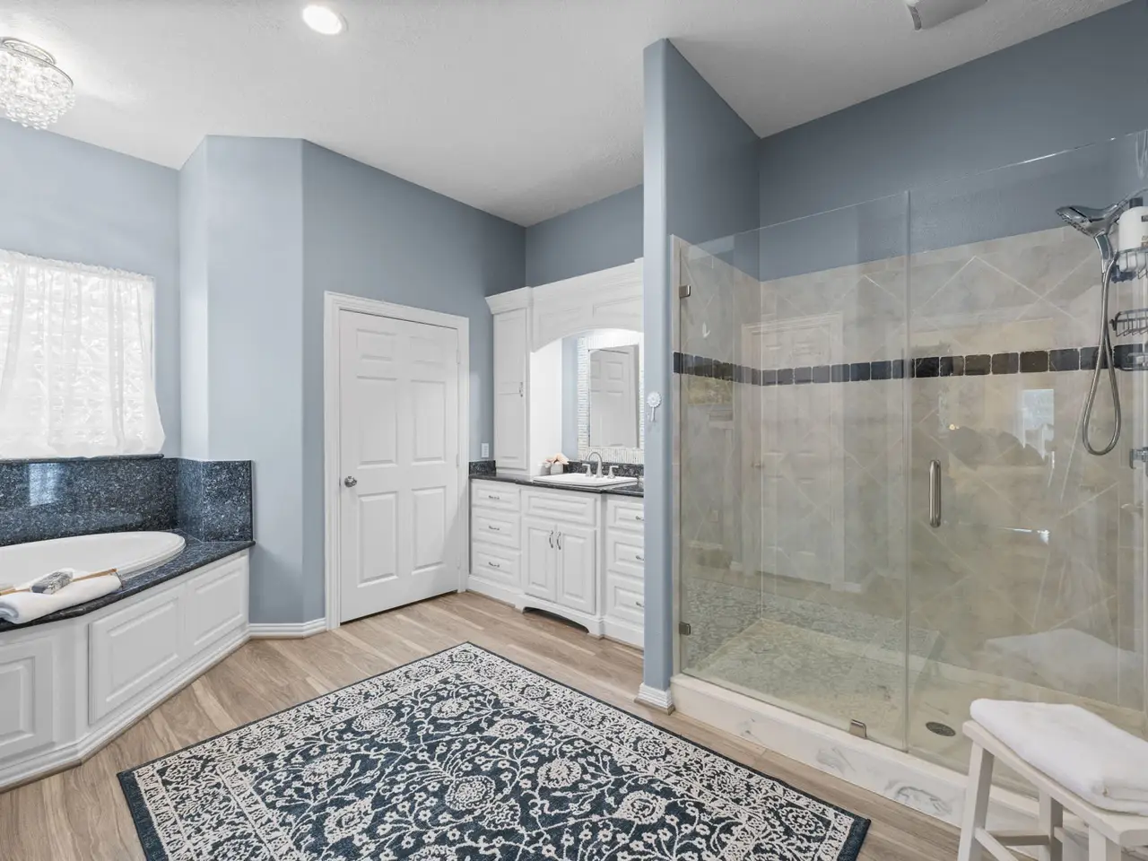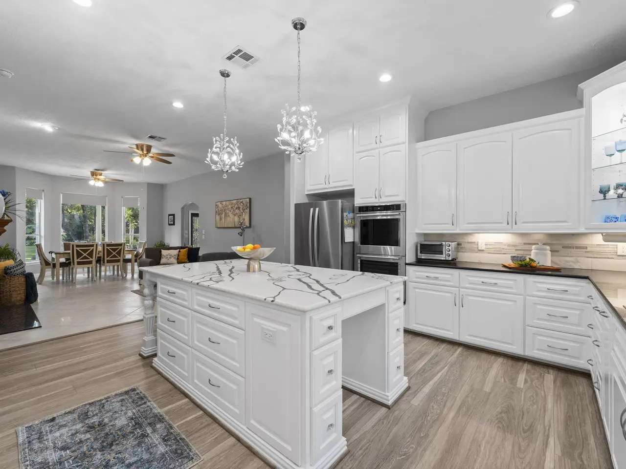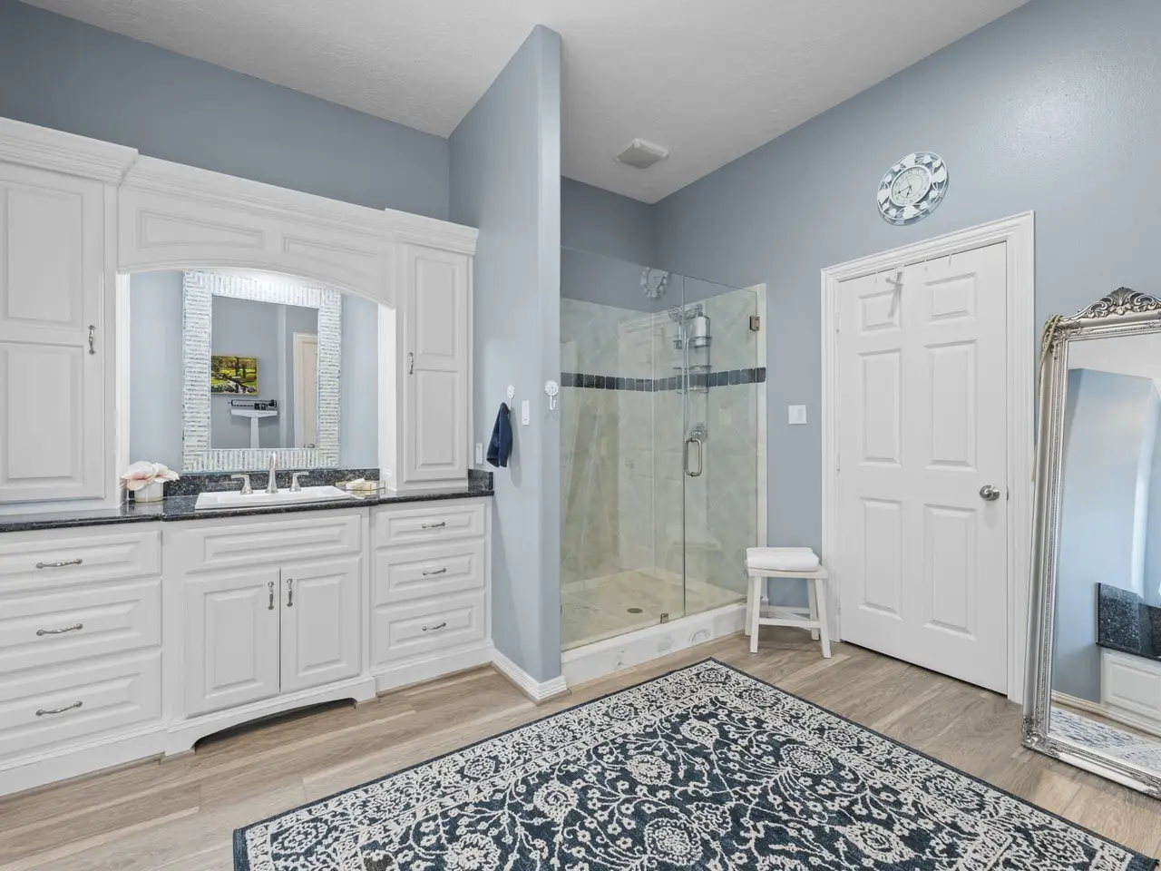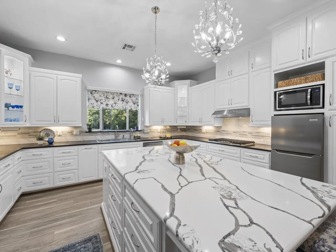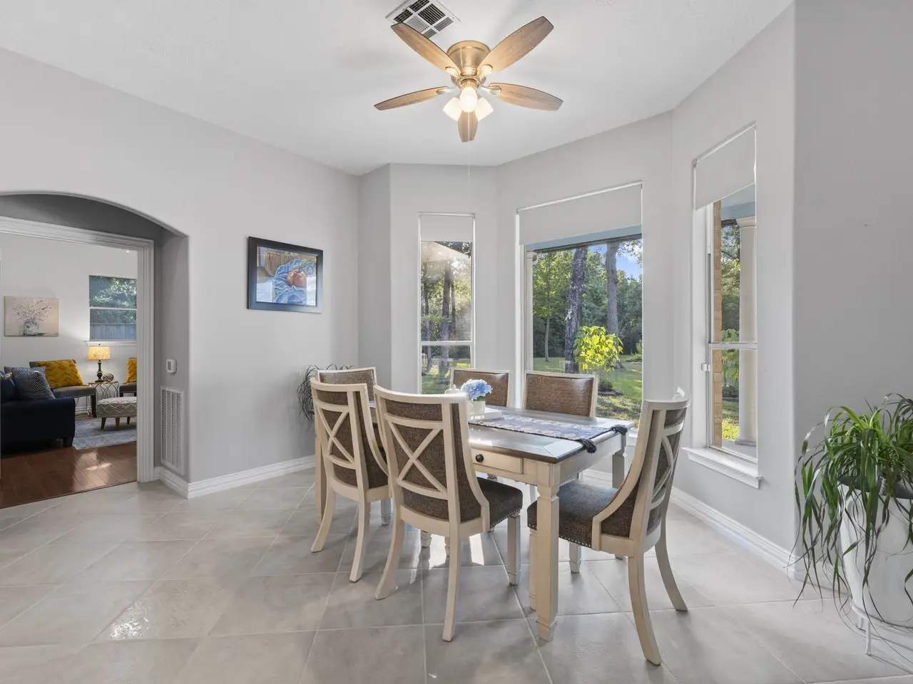 Gorgeous 3.19-acre estate in highly sought-after GATED Crown Oaks, just north of The Woodlands. This expansive property comprises a 5,496 sq ft main residence beautifully updated plus a 797 sq ft renovated garage apartment. Main house features 4 bedrooms and 4.5 baths, including TWO PRIMARY suites on the main level for convenient single-floor living. Completely renovated, chef-inspired kitchen with a large island, quartz and granite countertops, white cabinetry, and new appliances with adjacent hearth room and breakfast room. Generous family room with a wall of windows flooding the space with natural light, complemented by new LVP flooring throughout much of the downstairs. Upstairs includes a large game room and media room, plus two spacious bedrooms with private baths. Renovated upstairs garage apartment: two bedrooms, full kitchen, living room, and bathroom. Fully fenced back yard with a large covered back porch, perfect for entertaining and soaking in the serene 3.19-acre setting.