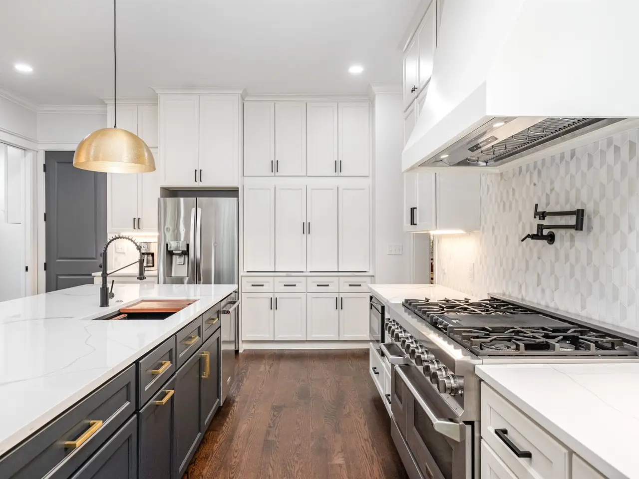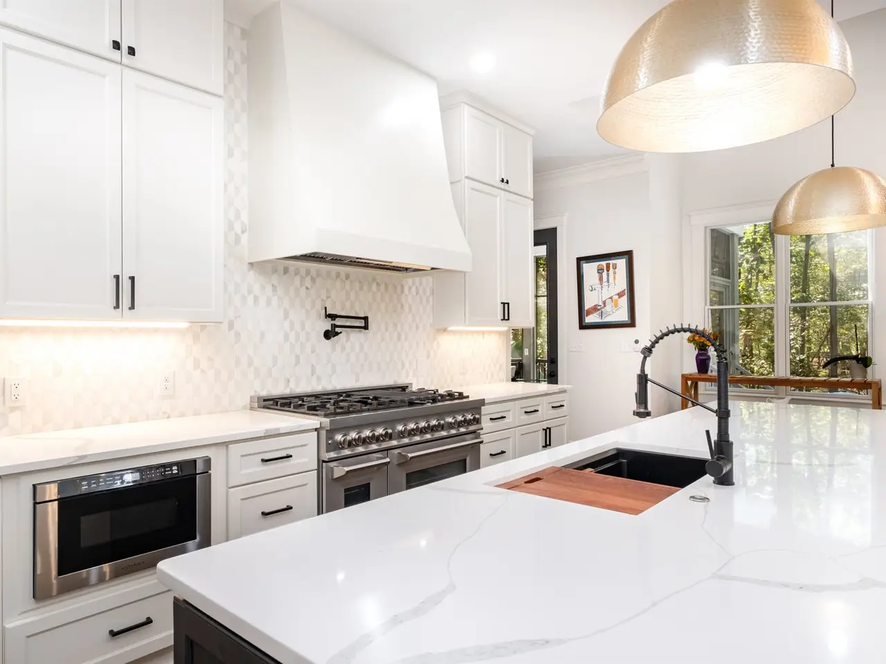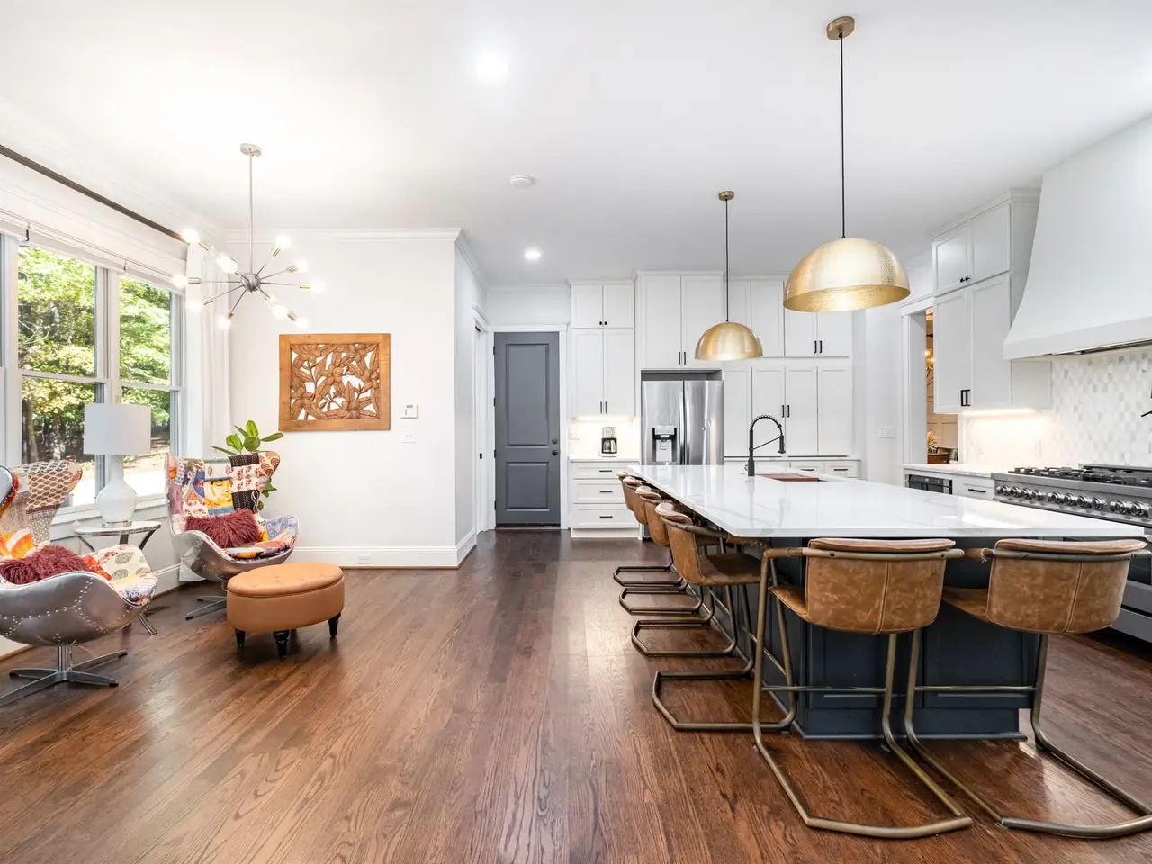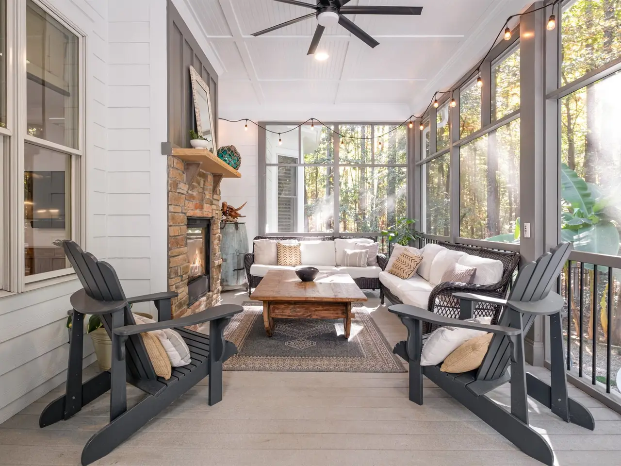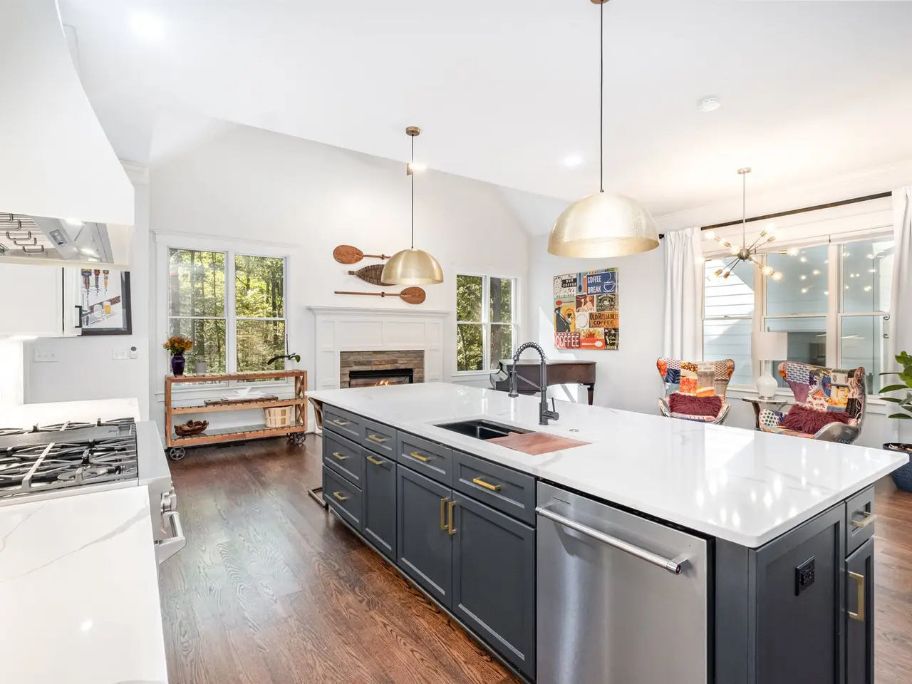This modern luxury estate in The Farms offers true resort living on 2.1 private acres. Bordered by protected water-company land and community greenway, it's one of the most private homes in the neighborhood. The 4BR/3.5BA main home features soaring ceilings, hardwoods throughout (no carpet), designer lighting, neutral paint, and a newly built-in bar. The chef's kitchen includes a 48" gas range with double ovens, drawer microwave, and custom cabinet pantry. A double-sided fireplace opens to a screened deck overlooking the 40' heated saltwater pool with 7' depth, swim-up bar, and 8+ person spa. Outdoor features include stone walkways, bonfire pit. One of the few properties in The Farms with a carriage house, the detached carriage house offers a studio-style space with kitchenette, bath, washer/dryer hookups, and dual-zone mini-split that also temp-controls the garage. Main home has two HVAC units and two hot water tanks, plus a third serving the carriage house. Both garages feature lift-ready ceilings. The Farms amenities include clubhouse, pool, tennis, pickleball, soccer fields, holiday events, and boat/RV storage available. Lake Norman access is just minutes away.