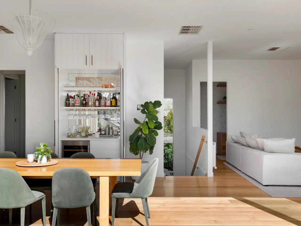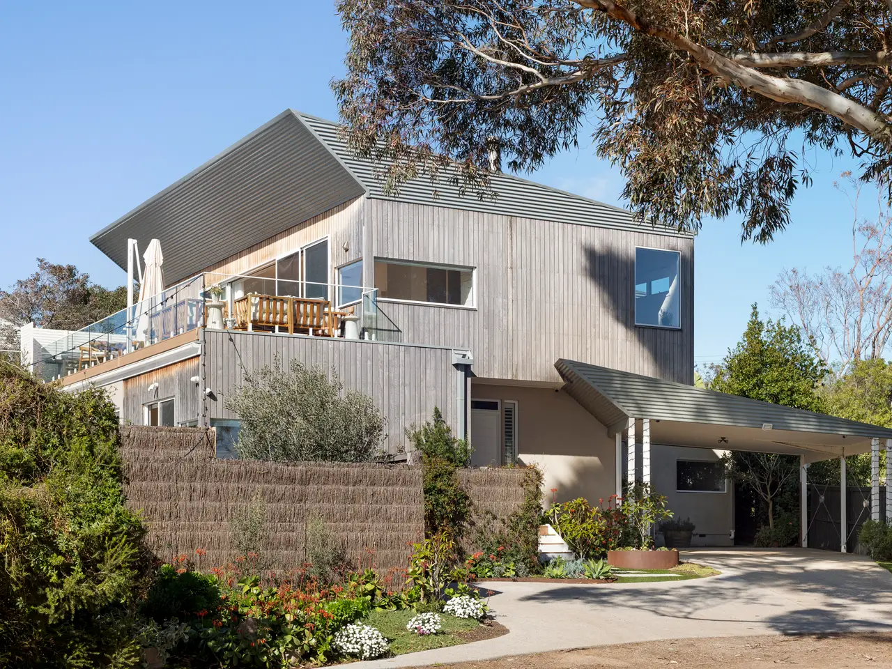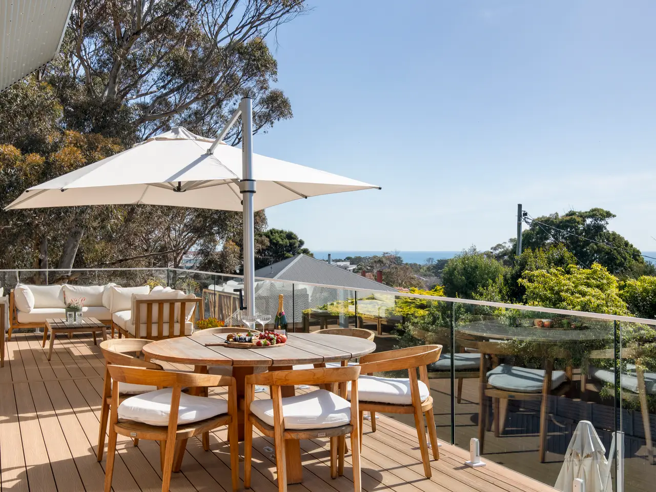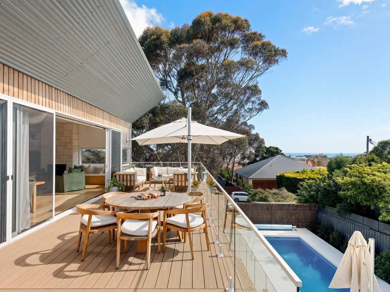 Nestled at the base of a charming country lane in one of Mornington's finest beachside pockets, this stunning Spotted Gum residence embodies the essence of coastal living with a focus on multi-generational harmony and big bay views. Just a block from the water's edge and only a short walk from Main Street, the flawlessly finished 6-bedroom home cleverly integrates a two-bedroom unit into the roofline, with a passive design and custom interiors tailored for both grandeur and ease. Spanning both light-letting levels, a collection of well-designed living spaces include a lounge with bunk room, an open-plan entertaining zone with open fireplace, a north-facing balcony, and a statement kitchen featuring twin Qasair Albany custom rangehoods, integrated gas burners, dual underbench ovens, concealed bar, and integrated fridge. Three bright bedrooms with walk-in robes are surpassed only by the first-floor master retreat, with its luxurious ensuite and spacious walk-in robe. The comprehensive floorplan is completed by a spa-like family bathroom with a feature tub, a dedicated study, and a generous laundry with direct access to the two-bedroom unit, which features an open-plan lounge/meals area and a fully-equipped kitchen. Resort-style amenities define the outdoor space, featuring tiered decking, an in-ground self-cleaning pool, a mod-grass basketball zone with a built-in ring, ample off-street parking, and coastal landscaping.