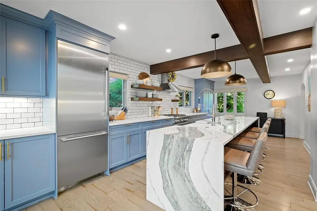 Charming Jr. Beam home in the heart of Mt. Lebanon, moments from schools, Uptown, dining, shopping & Rec Center! Modern fixtures & finishes blend beautifully w/original character - 8-panel doors w/glass knobs, plaster walls, hardwoods, archways, blt-ins & crown molding. Inviting LR features a stone fireplace flanked by built-ins & 12' opening to cozy den/lounge space, easily used as a DR. The show-stopping kitchen is a dream w/custom pale-blue cabinetry, quartz counters, floating shelves, 12' waterfall isle, beamed ceiling, hi-end appliances & coffee/beverage bar - all open to a spectacular family rm w/cathedral barrel ceiling, exposed brick, media wall, banquette dining space & French doors to spacious composite deck. Vaulted primary suite boasts a boutique-style en suite. Walk-out lower level ideal in-law or teen suite, gameroom, full bath, storage & mud rm/drop zone off 2-car garage. This remarkable home offers timeless charm, modern luxury and a prime Mt. Lebanon location.
