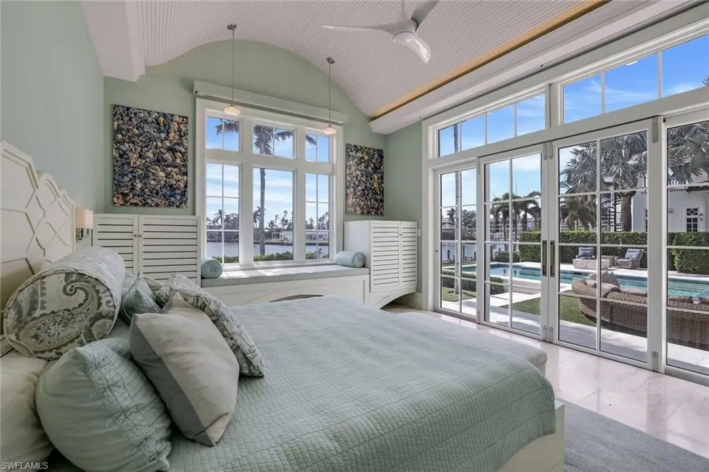Live in casual elegance in this beautiful custom bay front home in The Moorings, timelessly designed by Harrell & Company Architects on just under a private + acre premier southern exposure lot. This private oasis has been professionally decorated with a coastal flair. Watch the dolphins and eagles on Hurricane Harbor from the great room's floor to ceiling windows with zero corner sliding doors for seamless indoor-outdoor living and entertaining. Upgrades galorea soaring back lit quartz accent wall, cathedral ceilings with beautiful mill work; each ceiling a masterpiece, an indoor/outdoor bar, perfect for entertaining. There is a private elevator, Lutron lighting, two laundry rooms, two powder rooms and three car garages. The kitchen will delight your inner chef with professional grade appliances, gas six burner range, two dishwashers, walk in pantry and Miele built-in coffee machine. The first-floor master suite features a large walk-in closet with a dressing area and laundry room, private outdoor shower and a lovely view of the bay and the spa with waterfall. The study doubles as a guest bedroom, two queen-size Murphy beds, the second-floor hosts 2 additional bedrooms and baths, wet bar, family room loft and bayfront deck with a firepit. Overlooking the pool and bay you will find the cabana with bedroom and bath. The travertine lanai features a covered dining and living areas with wet bar, TV, grilling area, retractable screens, and shutters. The sparkling pool and spa are located on the terraced lawn featuring a firepit, several seating areas leading to the bay front deck with boat and jet ski lifts. Built in 2016 using the highest quality materials by D. Garrett Construction at a high elevation, this home has never been damaged by hurricane or storm surge. For your peace of mind there is a security system with cameras, high impact glass windows & doors, all at a high and dry elevation. This house is a true showplace. The Moorings is conveniently located west of 41 in the City of Naples and features a private residence Beach Club. Two miles from 5th Avenue and all that Naples has to offer. Location, Luxury and Beauty!