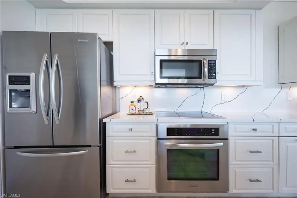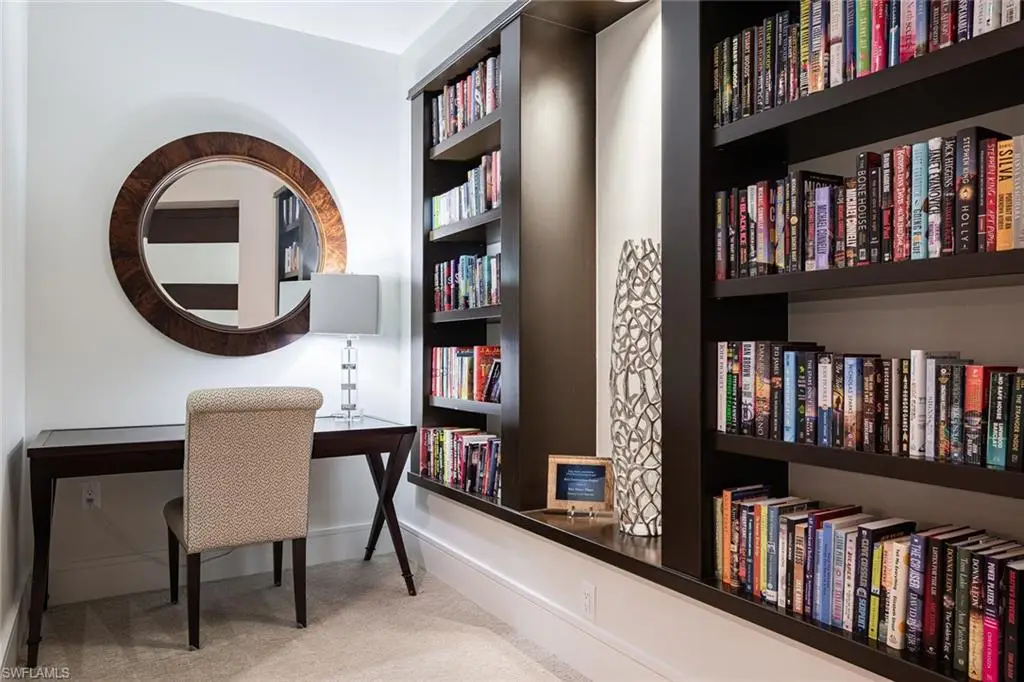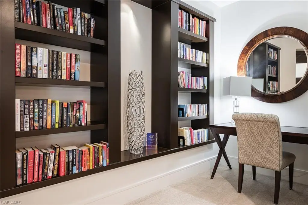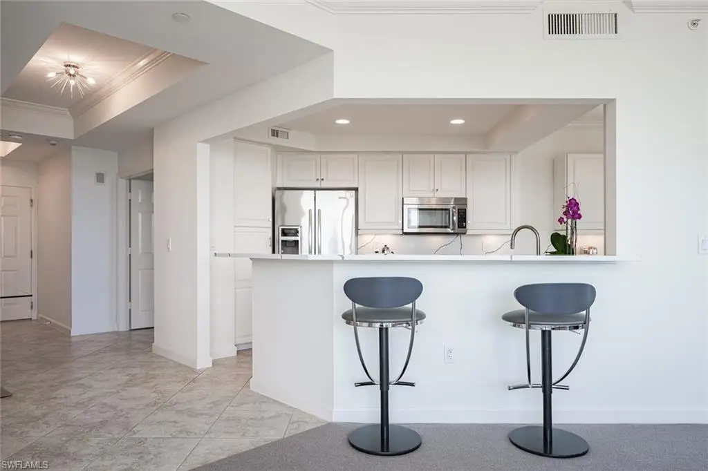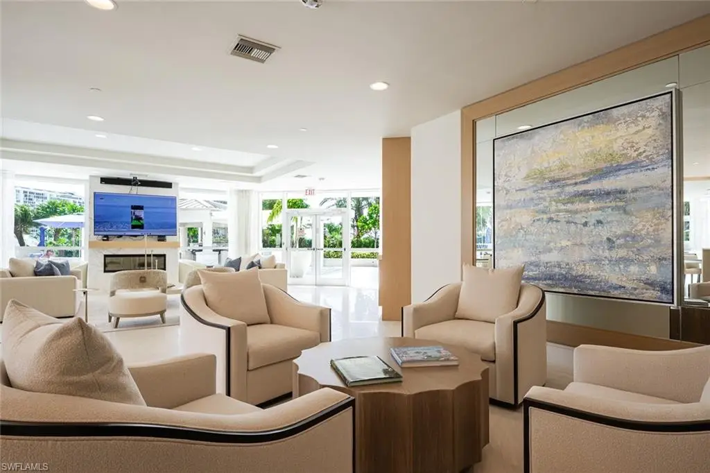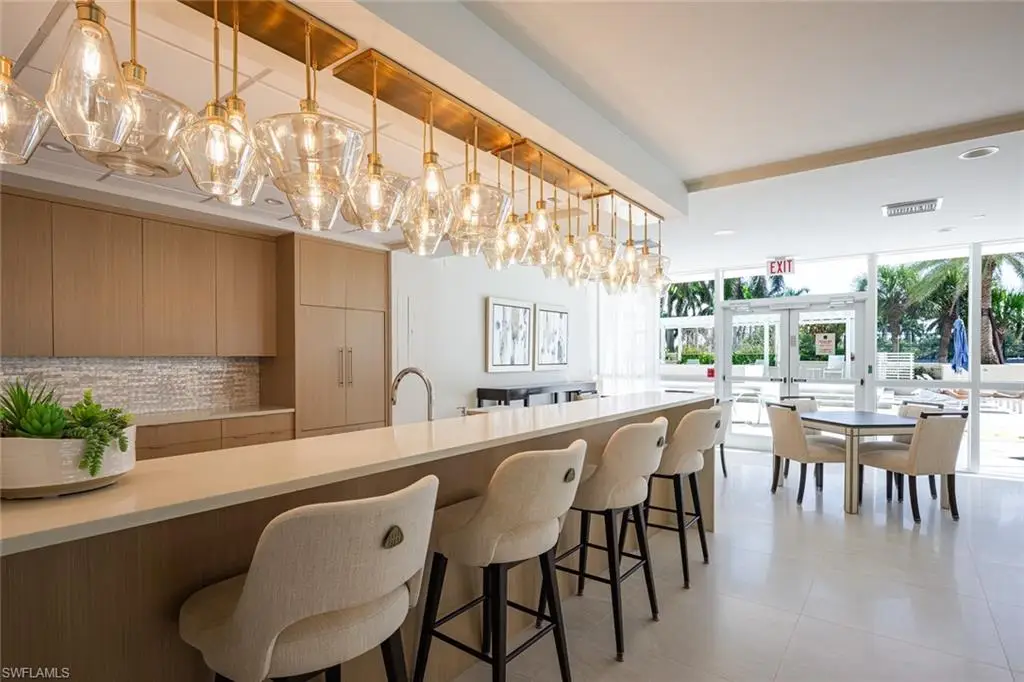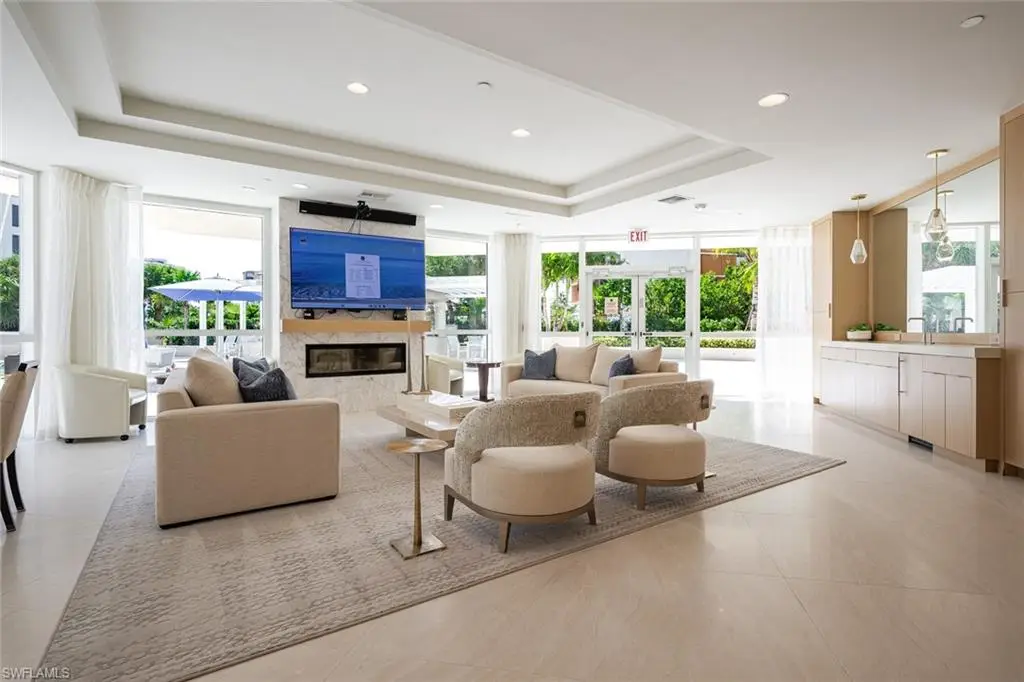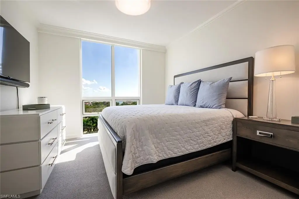 Experience effortless coastal living from this beautifully updated residence overlooking the shimmering waters of Venetian Bay. With captivating sunset views of the Gulf of Mexico from its expansive wraparound terrace, this two-bedroom plus den, two-bath home offers 1,649 square feet of refined comfort and style. The open-concept layout features nine-foot ceilings and a spacious primary suite with a large bath, walk-in and linen closets, and generous guest accommodations. The recently enhanced kitchen now showcases sleek quartz countertops and a more open design, while automatic shades, upgraded lighting, and plush new carpet add a touch of modern luxury. The screened lanai, equipped with electric storm shutters, provides peace of mind with ease of hurricane protection. Residents of this impeccably maintained building enjoy a host of first-class amenities, including a newly remodeled lobby, social room, and library, plus a sparkling pool and spa area with grilling stations, a well-equipped fitness center, guest suites, and on-site management. A deeded parking space and private storage are also included. Ideally situated near The Village Shops on Venetian Bay, youÆll enjoy fine dining, boutique shopping, and marina services just moments from home. Boat docks are available across the street for Park Shore homeowners to lease or purchase, offering the ultimate Naples waterfront lifestyle.