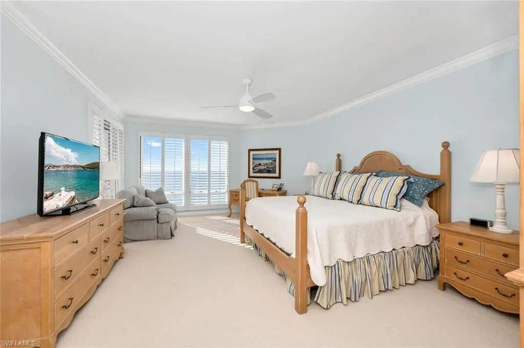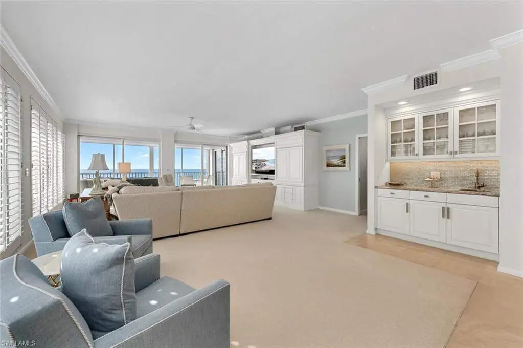 One of Naples' most exclusive residences featuring unobstructed Gulf views & exquisite sunsets & star-filled evenings. Luxurious 3 bedroom & 3.5 bathroom with 9 ft ceiling & amazing fresh white decor is complimented by the azure blue waters & includes a BOAT DOCK. The uncrowded beach is a joy to sit under an umbrella to read or just relax and listen to the waves. As you enter the foyer through double door entry you will be greeted by the colors of the sea. Nearly 3,000 sq ft of pure luxury sitting directly on the white sugar sand. Preferred end unit has southern exposure which allows natural light to cascade through the expansive bank of floor to ceiling windows from the living room and dining room. Includes electric storm shutters and 2 covered screened lanais to enjoy sunrise to sunset. The spacious floor plan includes a luxurious primary suite with soaking tub & dual closets. Guest bedrooms offer sparkling Bay views, ensuite bathrooms, & seamless access to a bayside lanai ensuring phenomenal guest experience. Le Dauphin offers unparalleled amenities designed to elevate every aspect of the Naples lifestyle. Extraordinary amenities include sparkling pool, tennis, pickleball and a summer kitchen complete with a BBQ. The on-site manager ensures meticulously kept building. Understated elegance greets you as you step into the newly renovated secured lobby, elevator, plus secured garage parking included. Experience the amenity rich lifestyle including the adjacent La playa with all the privileges of the private dining room & bar. Spend the day at the spa or fitness center. Enjoy food & beverage service on the beach from your lounge chair with beach butler service directly in front of Le dauphin, watch sports at the tiki bar, game of tennis & pickleball. Come today & enjoy the endless stretches of the pristine coastline.