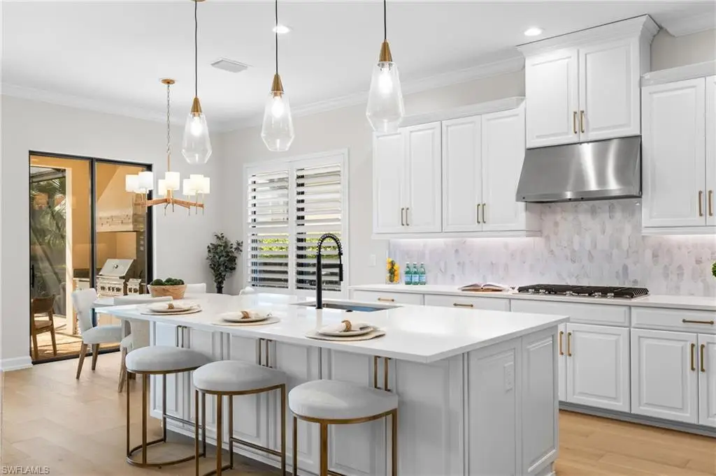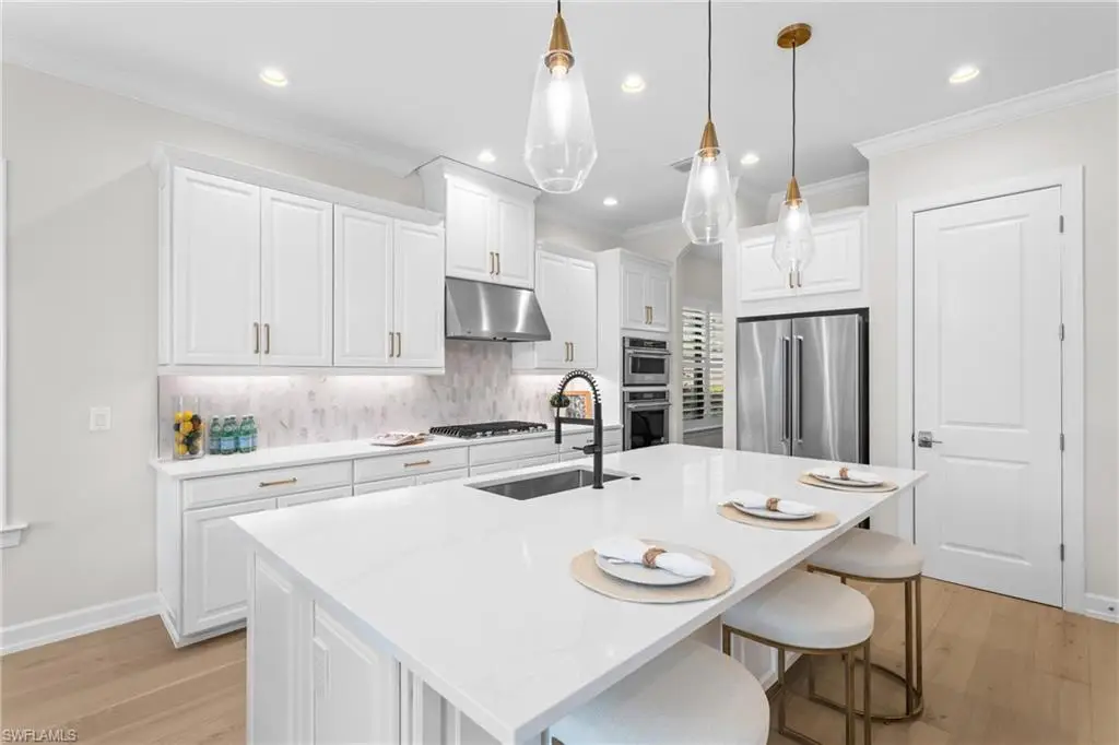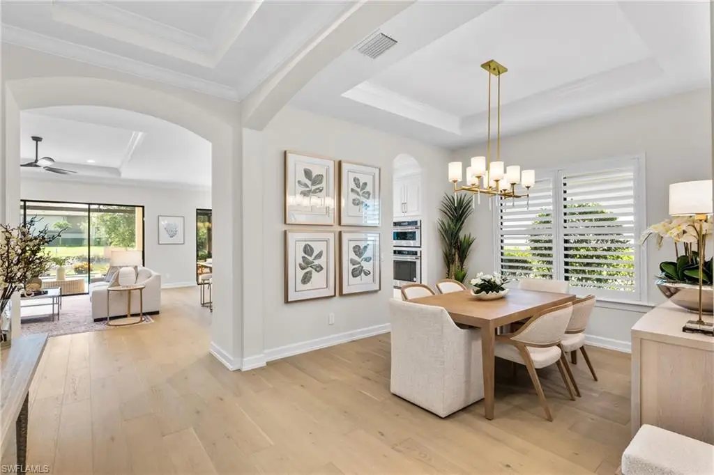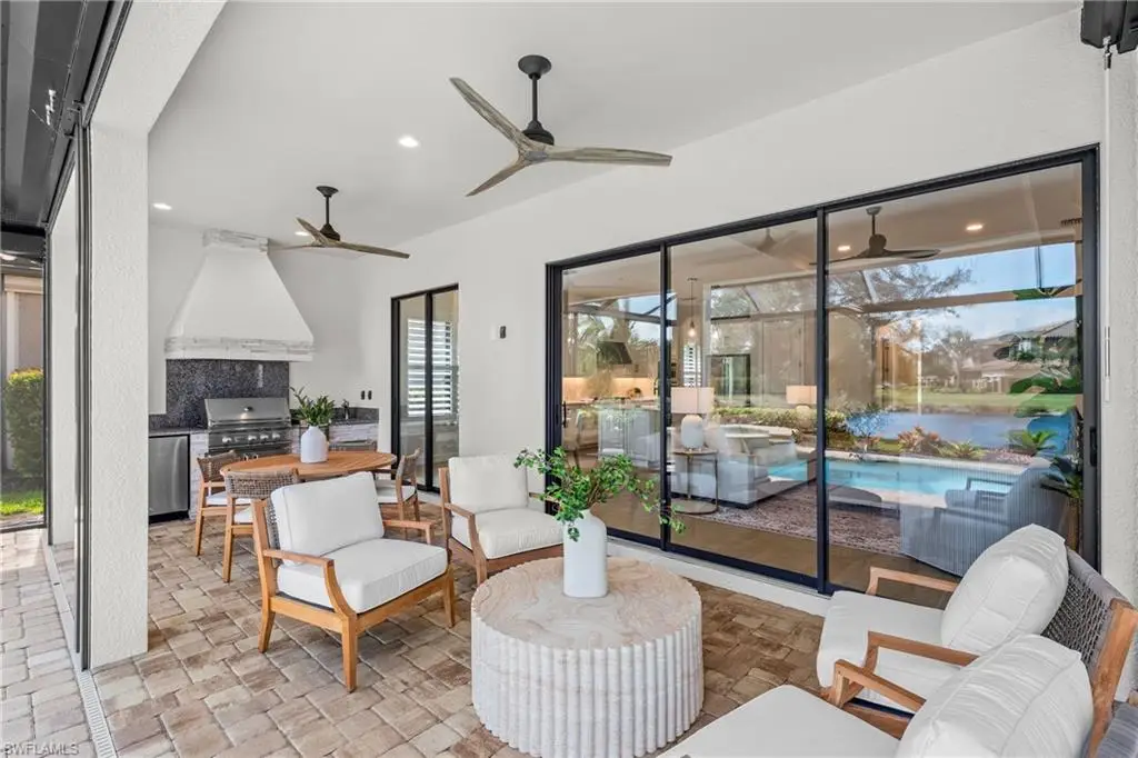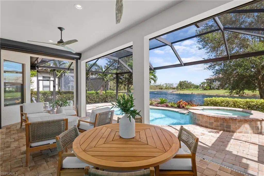 FULL GOLF MEMBERSHIP INCLUDED! Live a vacation lifestyle in Esplanade G&CC! This immaculate and totally remodeled ôFarneseö floorplan (2 Bedrooms plus den, 2.5 Baths) home is situated on a quiet cul-de-sac street within walking distance of the amenity campus of Esplanade Golf & Country Club of Naples. This home underwent a significant renovation and remodel in early 2025 which includes $200k in BRAND NEW updates which include: air conditioner with wifi thermostat; StormSmart motorized roll down hurricane screens on the lanai openings; KitchenAid appliances including GAS cooktop, wall oven, convection microwave, and french door refrigerator; Maytag washer/dryer; European white oak wood floors throughout; custom closet built-in shelving/cabinets throughout all closets & pantry; plantation shutters on all windows; Hanstone quartz countertops throughout; marble tile backsplash; hurricane impact glass front door & sidelight; freshly painted interior & exterior; refinished pool/spa interior; salt water pool/spa system; bathroom sink/shower fixtures including new toilets; frameless shower enclosure; upgraded door hardware; recessed lighting & high end light fixtures throughout; whole house Kinetico water softener/filtration system; finished eopxy garage floor; lush landscaping; and more! From the moment you walk in the door, you are greeted with a light and bright great room style floorplan that is flooded with natural light throughout the day from this homes abundance of windows and two sliding glass doors to the lanai. Enjoy al fresco dining and entertaining on the lanai complete with outdoor kitchen, and a salt water GAS heated pool with raised spa & sunshelf all enclosed by an updated screen cage with picture windows on all three sides (2019). Tastefully designed with light neutral colors, elegant lighting fixtures & chandeliers, and all the brand new furniture/decor is available to be purchased with the home. Esplanade Golf & Country Club of North Naples offers a true ôLifestyle Communityö with world-class amenities, including a resort pool with cabanas and the popular ôBahama Bar,ö tennis, pickleball, bocce, a 14-mile network of bike/walking trails, and an 18-hole private golf course. The impressive 15,000 Sq Ft clubhouse features a restaurant, bar, wine-tasting room, wine lockers, and a Starbucks-style cafT. Best of all, the propertyÆs landscaping, irrigation, golf membership, and all community amenities are covered under a quarterly fee of just $3,412ùno additional fees or memberships required! Don't miss your opportunity to own this exceptional home in one of NaplesÆ most sought-after communities. Schedule your tour of this stunning home and Esplanade Golf & Country Club today! NON FLOOD ZONE/NO FLOOD INSURANCE REQUIRED/ZONE X!
